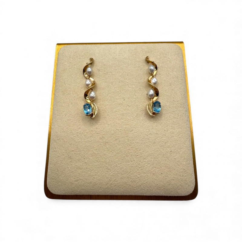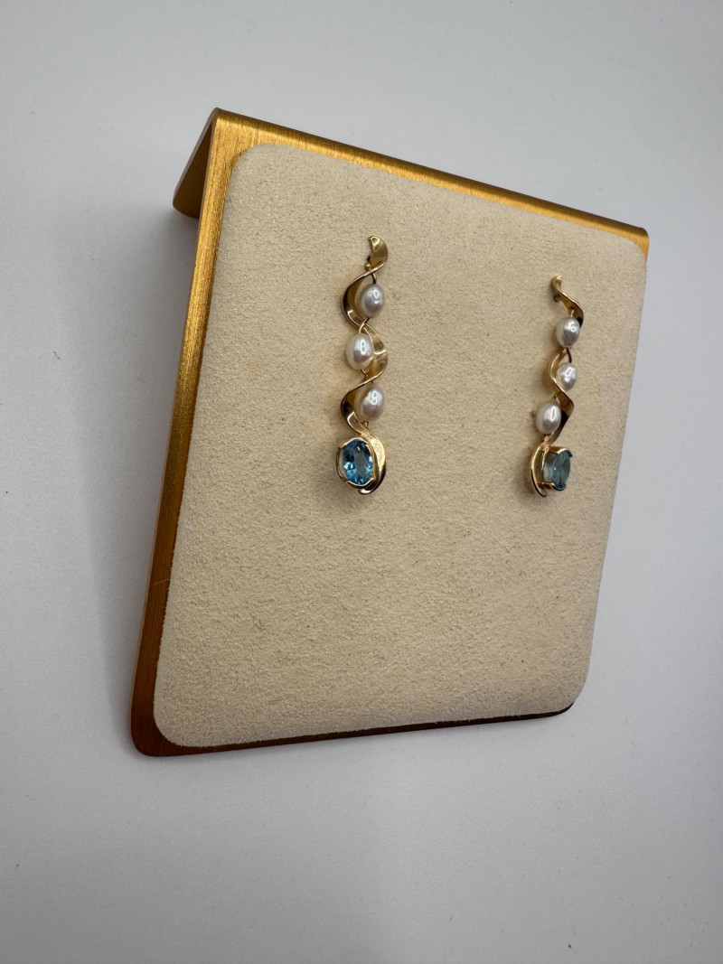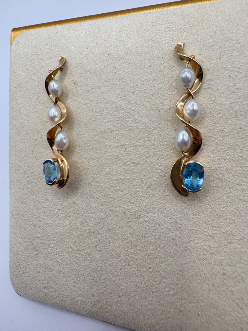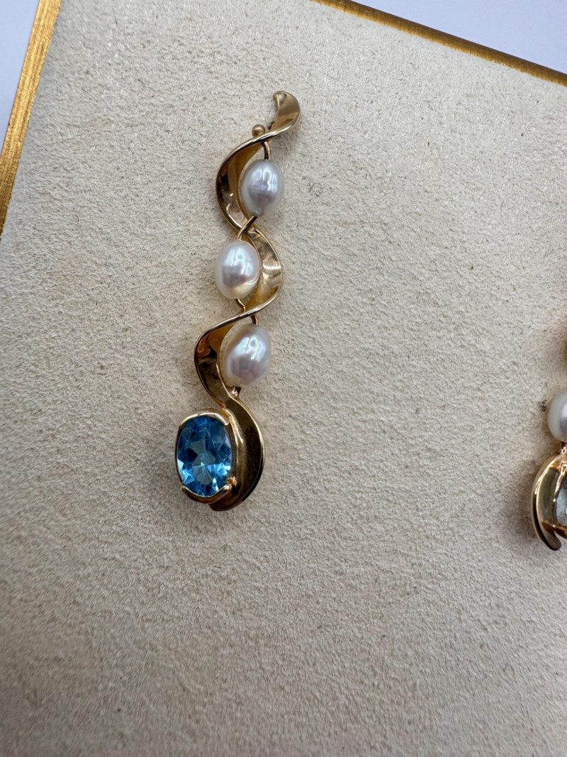 Lot # 40 - 14k Pearl & Blue Topaz Drop Earrings w/ Merrin Box – 1.25”, 2.95g