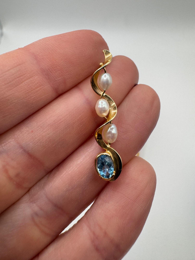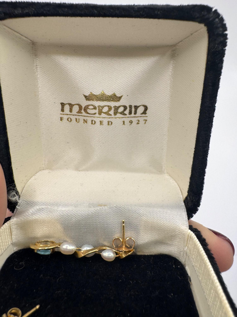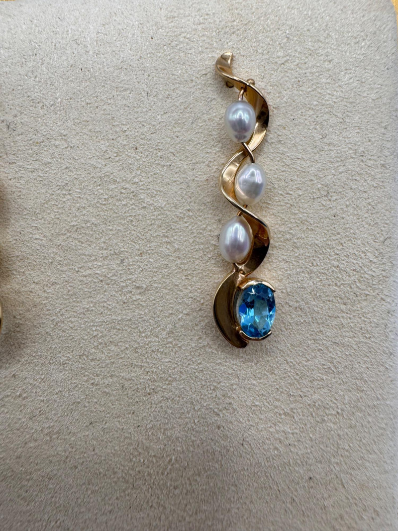 14k Pearl & Blue Topaz Drop Earrings w/ Merrin Box – 1.25”, 2.95g. General Disclaimer:All items are sold as-is. Jewelry, metals, gemstones, and other minerals have not been tested unless specifically noted. No guarantees are made regarding metal content, gemstone type, or origin. Refunds will not be issued based on identification, classification, or perceived quality.