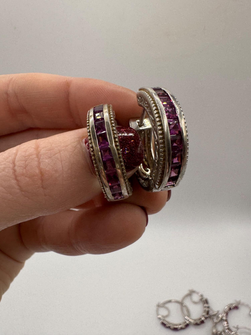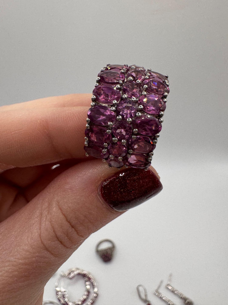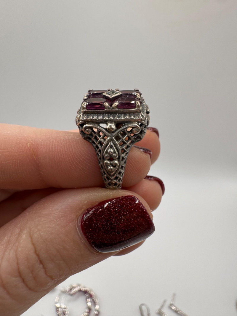 Sterling Garnet & CZ Jewelry Collection – Rings & Earrings, 107.56g. • Sterling silver jewelry assortment with garnet and CZ stones General Disclaimer:All items are sold as-is. Jewelry, metals, gemstones, and other minerals have not been tested unless specifically noted. No guarantees are made regarding metal content, gemstone type, or origin. Refunds will not be issued based on identification, classification, or perceived quality.