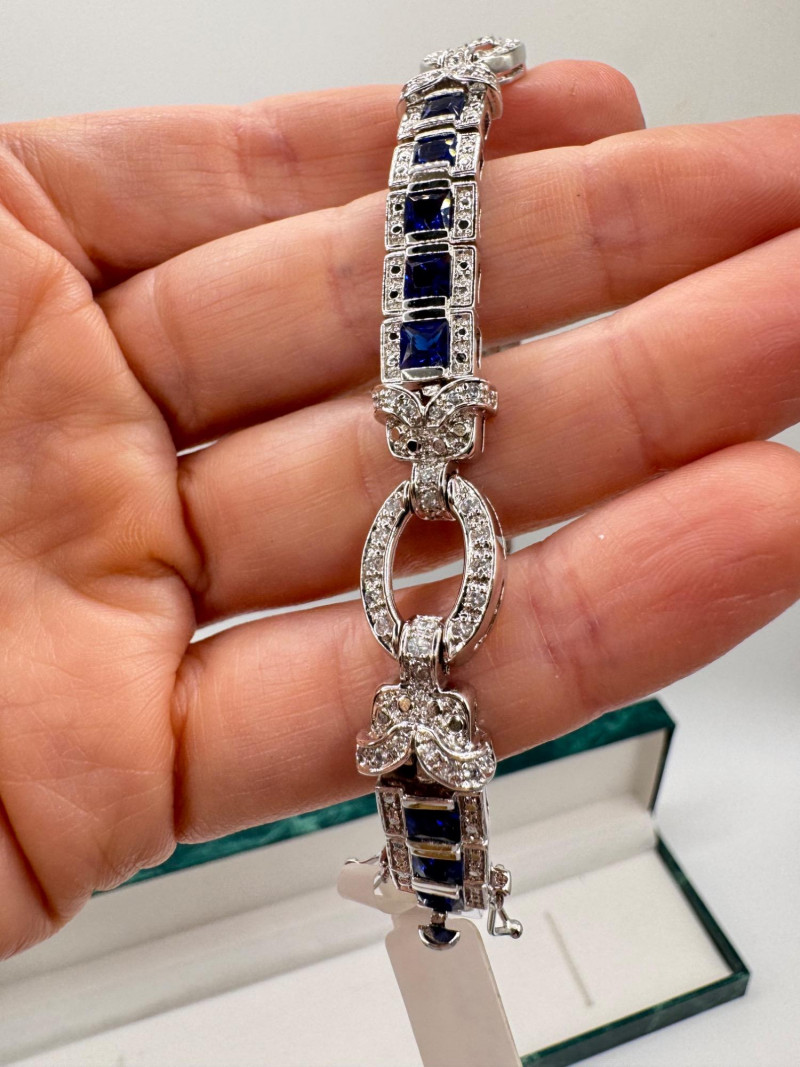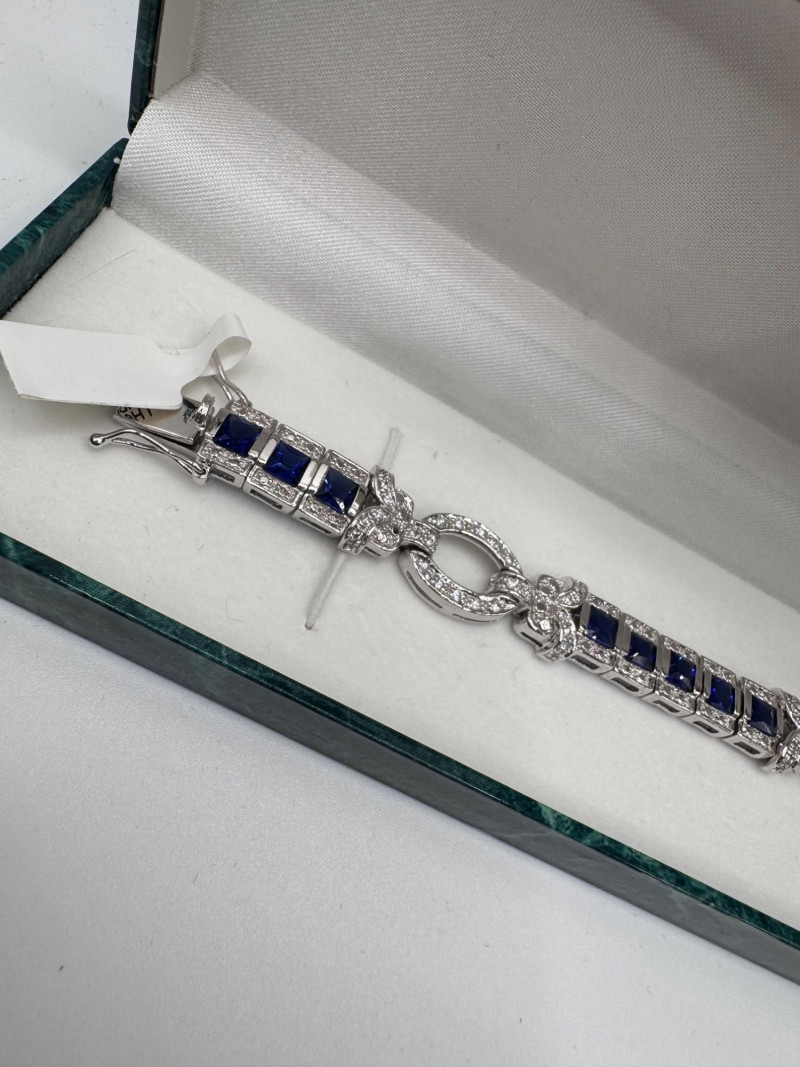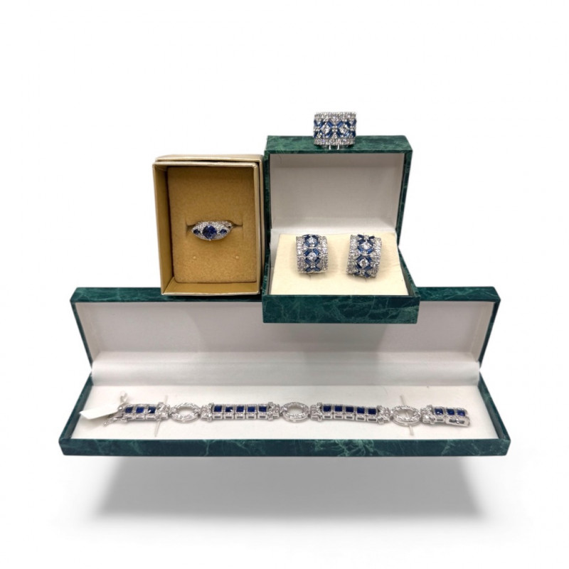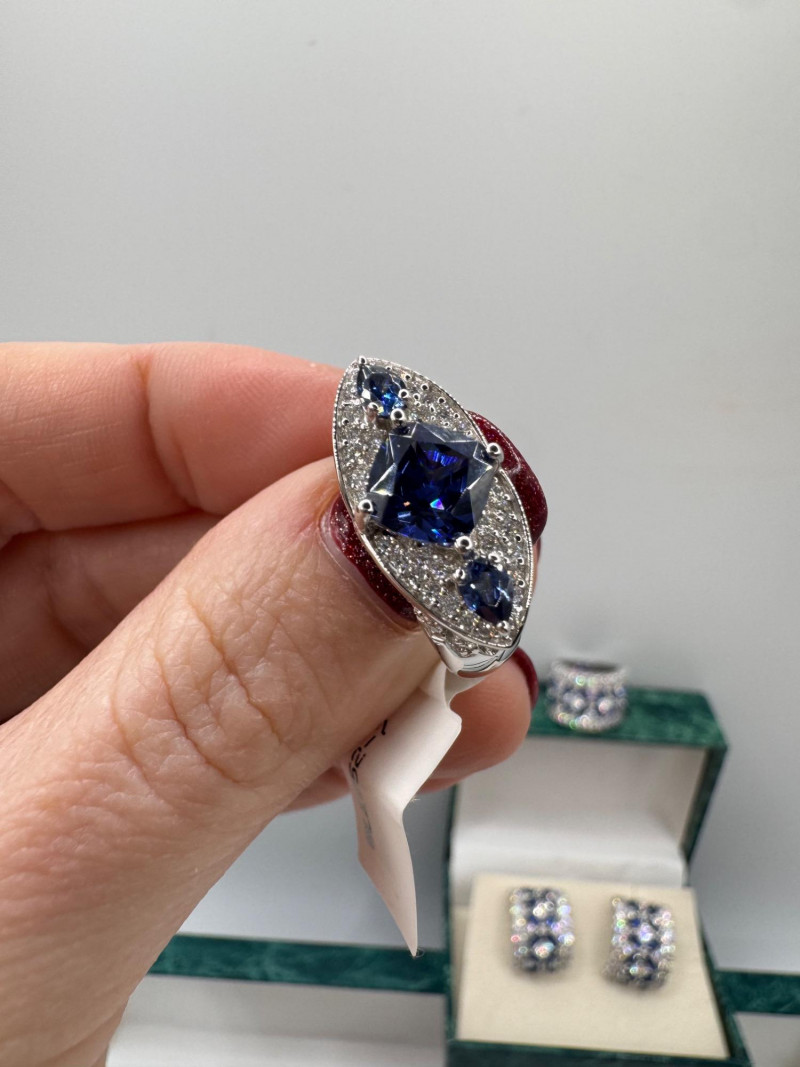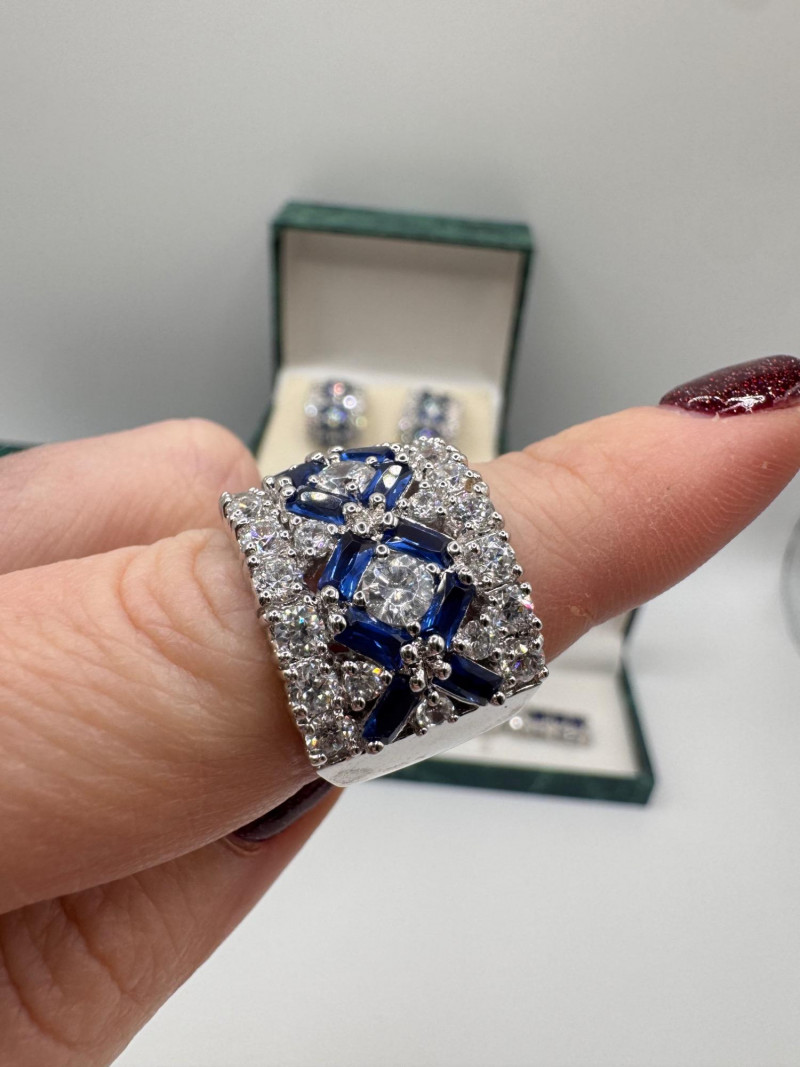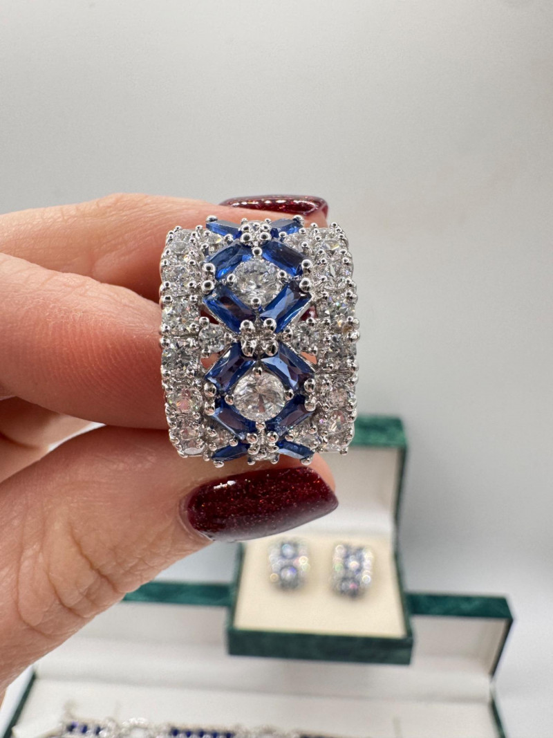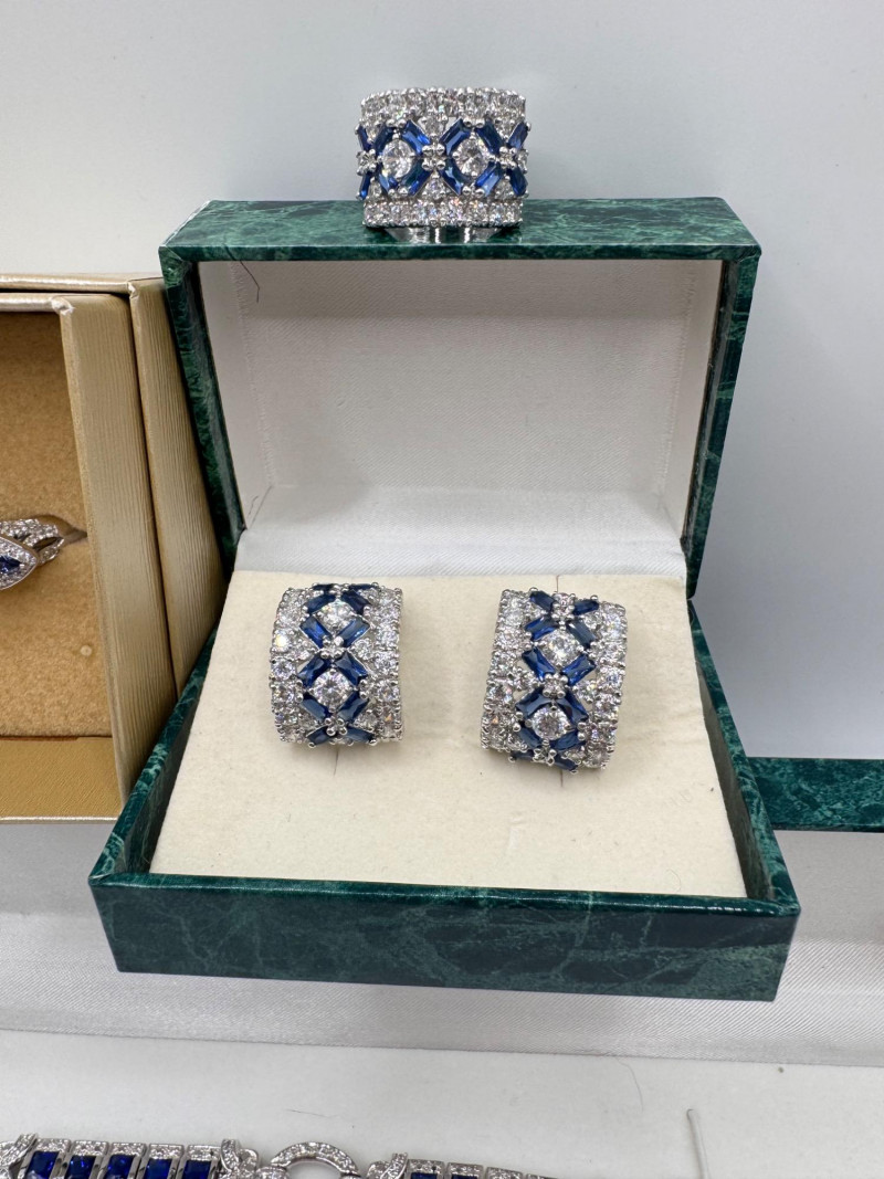 Suzanne Somers Bracelet, Ring & Earrings + Extra Sterling Ring. Suzanne Somers pave sapphire-simulant bracelet Marked STERLING Approx. 7.5" long Blue sapphire-look stones with clear simulant accents Comes with original Suzanne Somers box Suzanne Somers matching ring & earrings set Sapphire-simulant stones Ring size 6 Earrings are wide band-style with matching simulants Both marked .925 Additional sterling ring (not Suzanne Somers) Sapphire-look simulant center stone Size 7 Marked .925