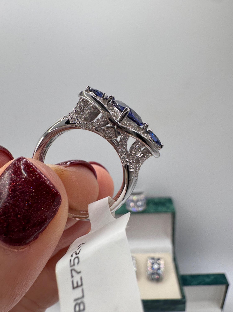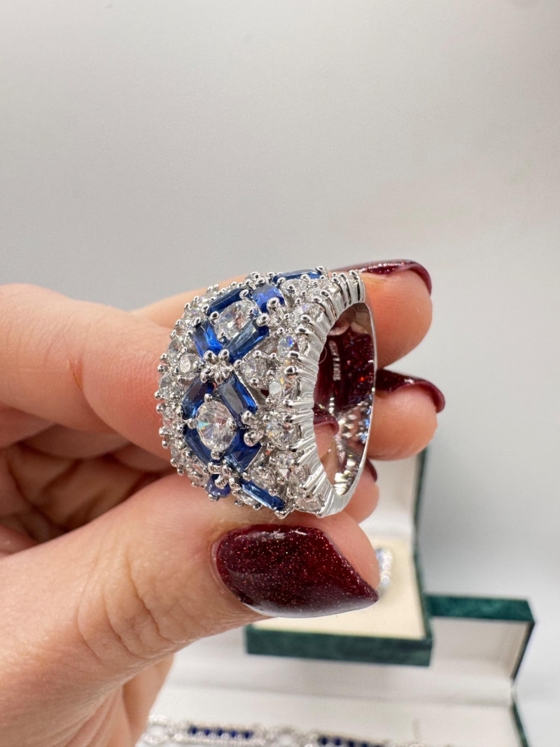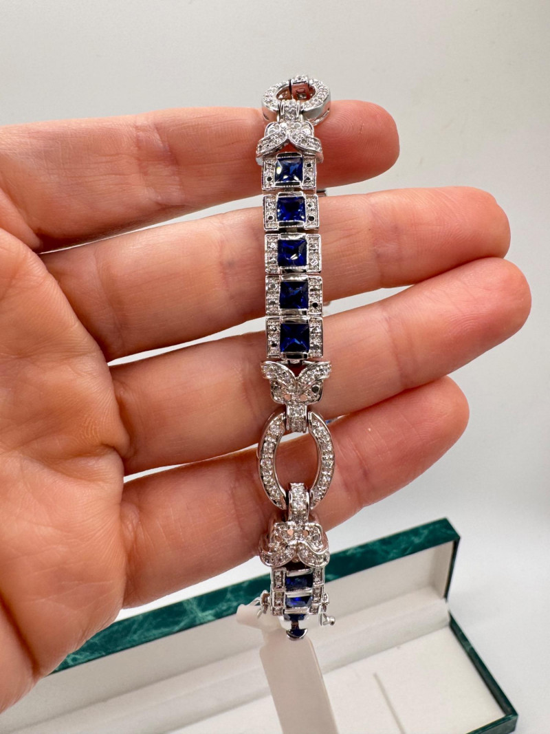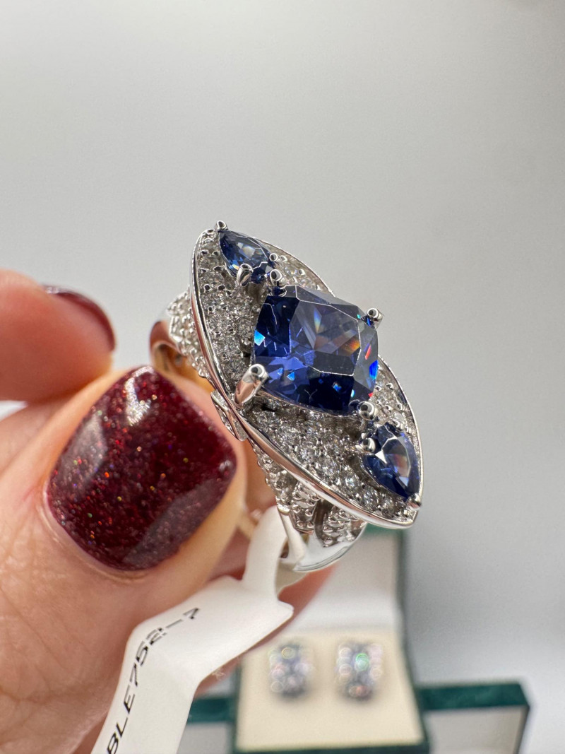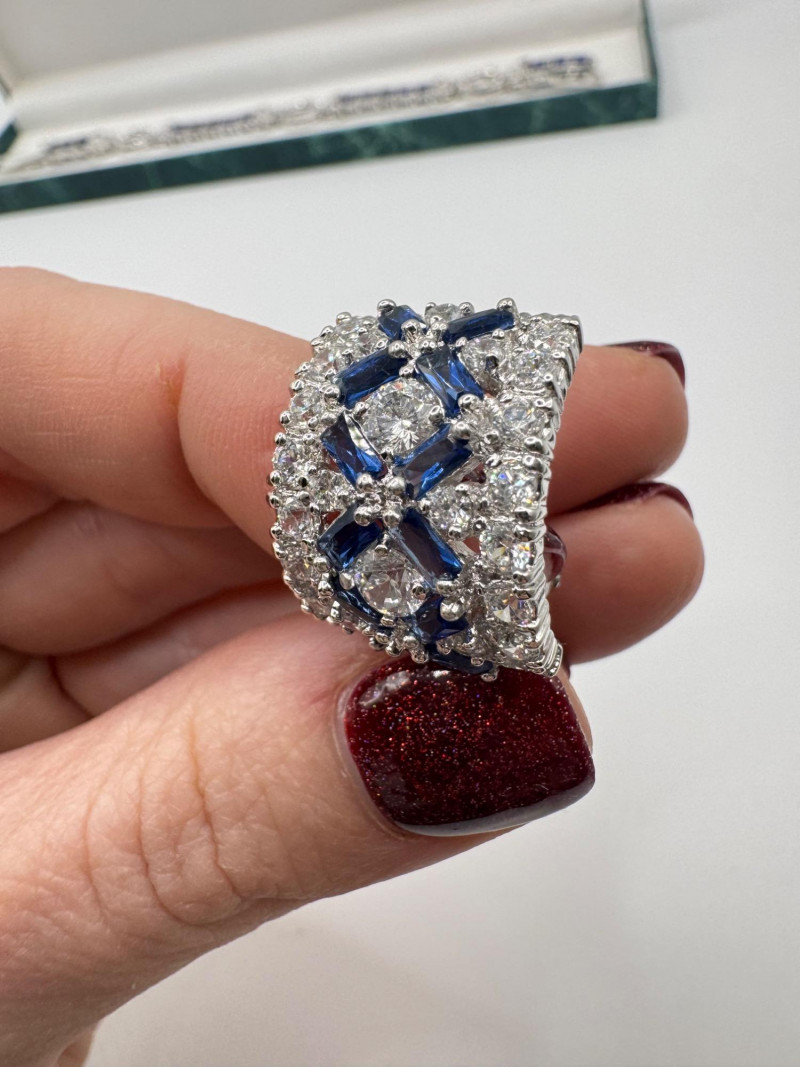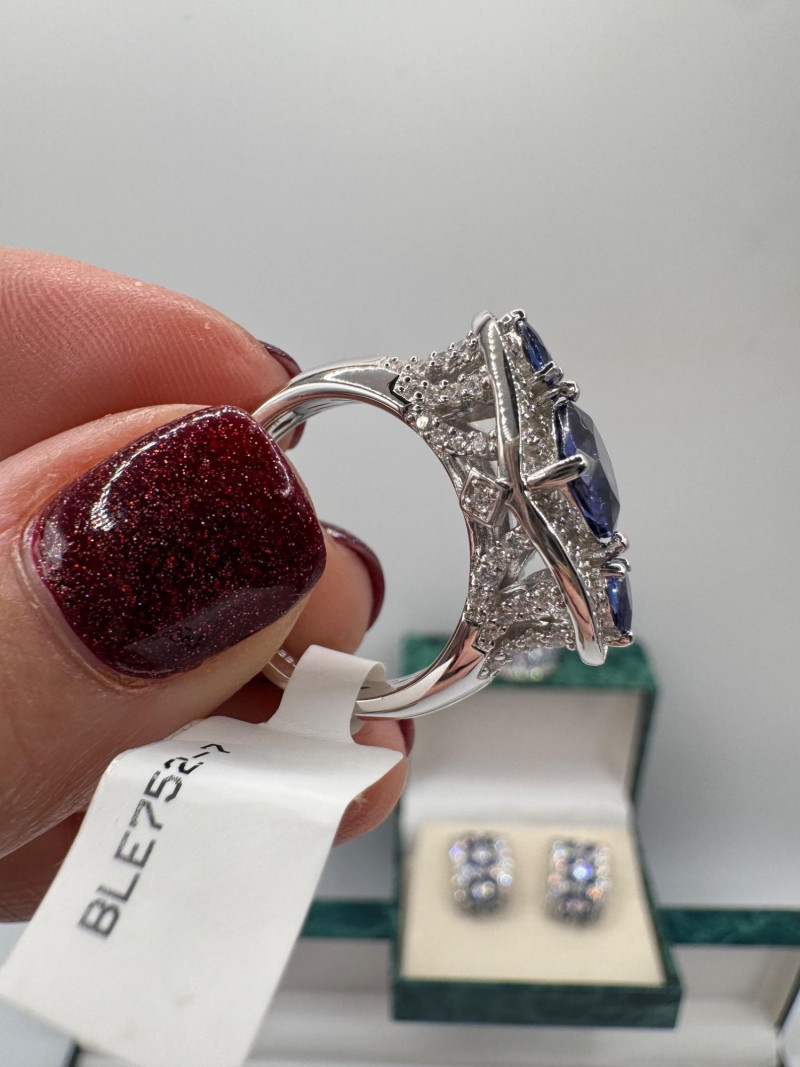 Suzanne Somers Bracelet, Ring & Earrings + Extra Sterling Ring. Suzanne Somers pave sapphire-simulant bracelet Marked STERLING Approx. 7.5" long Blue sapphire-look stones with clear simulant accents Comes with original Suzanne Somers box Suzanne Somers matching ring & earrings set Sapphire-simulant stones Ring size 6 Earrings are wide band-style with matching simulants Both marked .925 Additional sterling ring (not Suzanne Somers) Sapphire-look simulant center stone Size 7 Marked .925