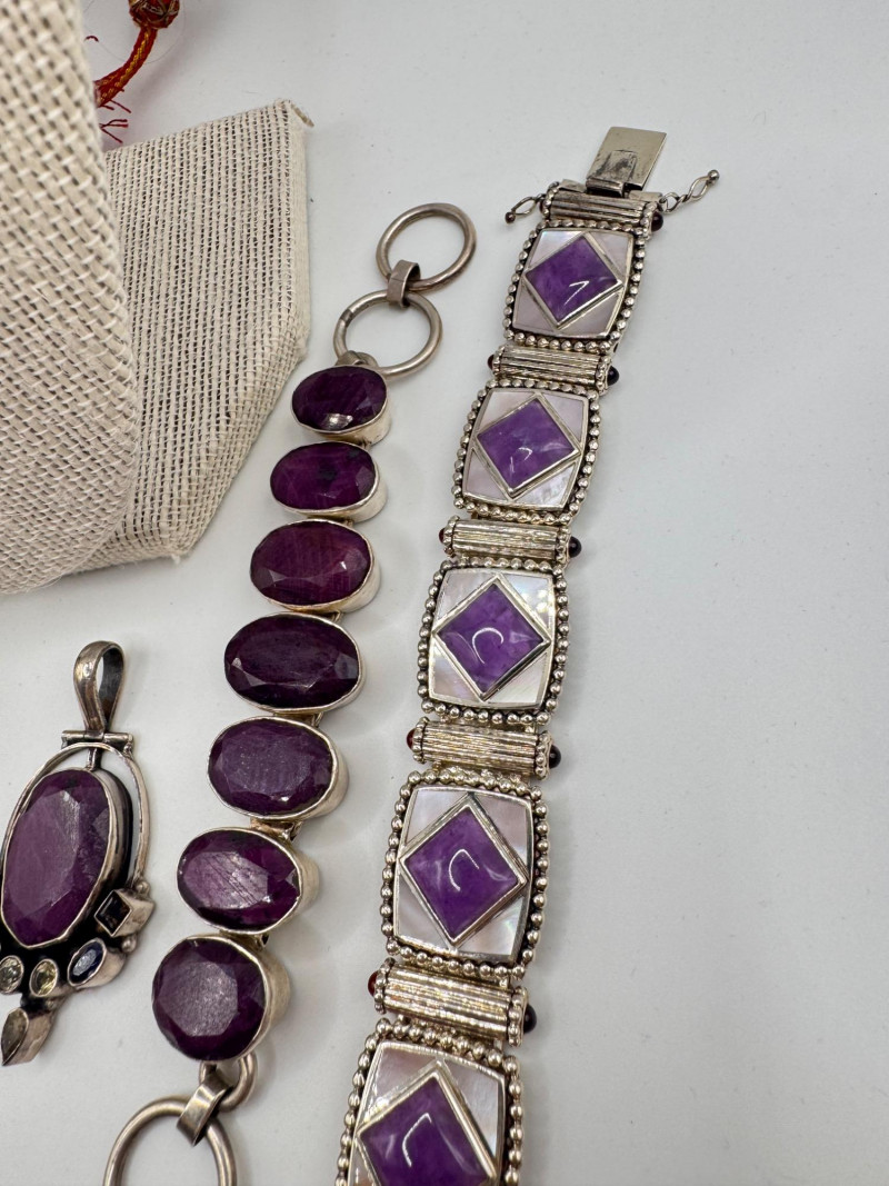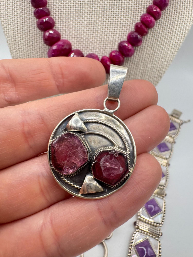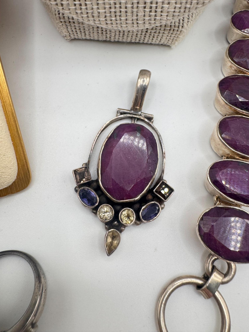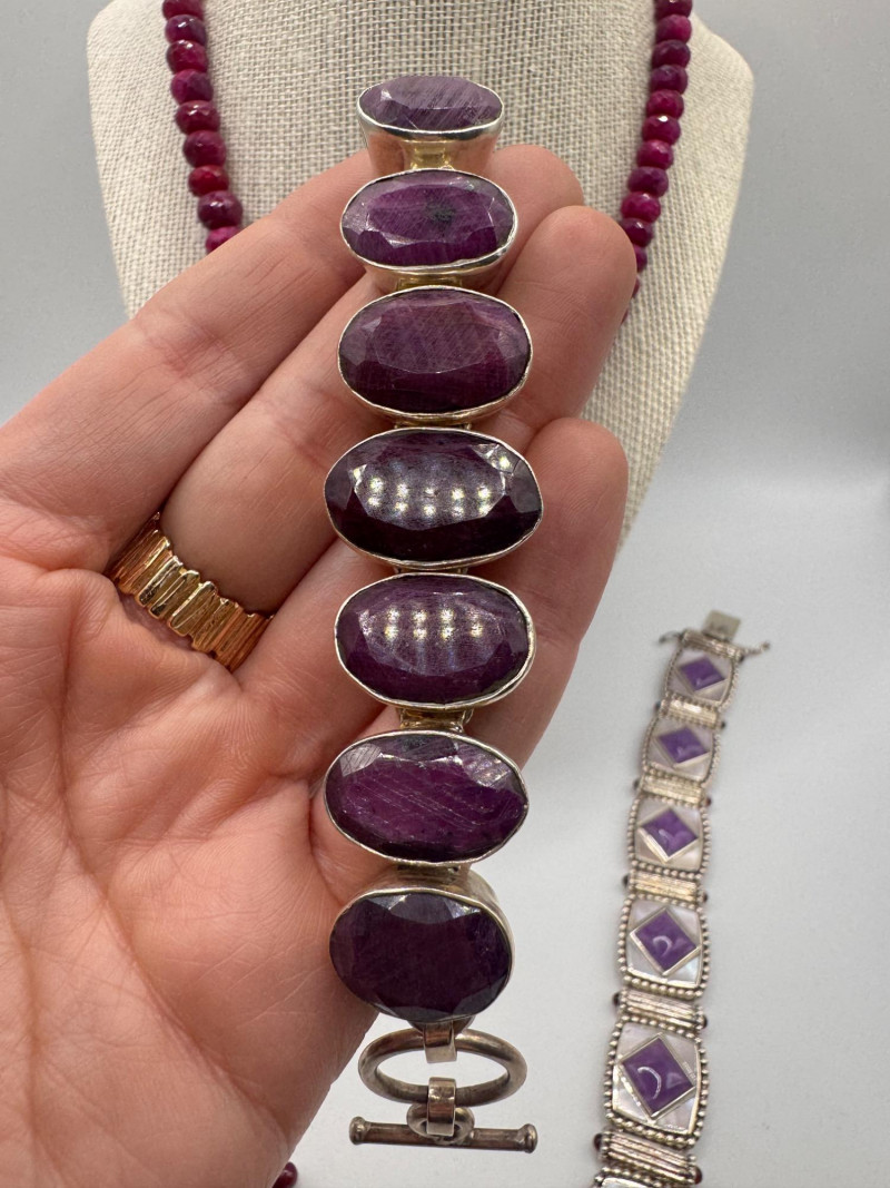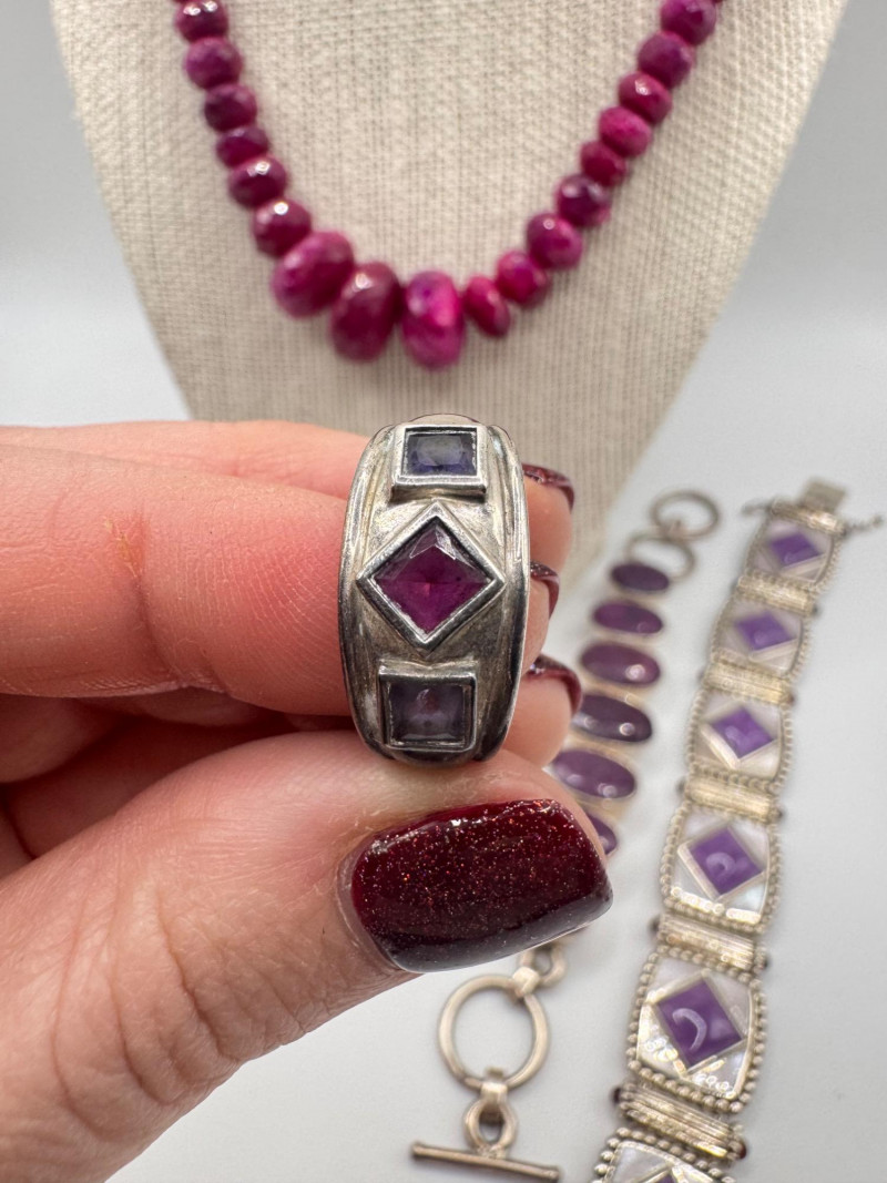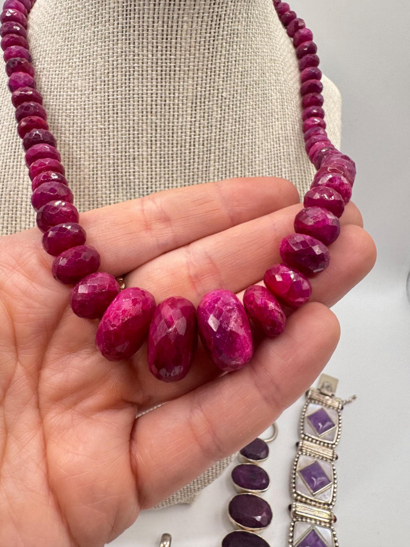 Chunky Gemstone Sterling Set – Stone Necklace, Pendants, Rings & More. Chunky faceted stone bead necklace (deep red tone) Two gemstone bracelets (fit approx. 7" wrists; one adjustable for smaller wrists): Bracelet with large ruby-colored oval stones in sterling (approx. 7") Purple stone inlay bracelet, marked 925 Sterling pendant with large purple cabochon and accent stones Sterling pendant with two raw/rough pink stones (tourmaline-style appearance) Long deep-red stone bead tassel earrings, sterling components Small deep-red stone cluster stud earrings Sterling ring with purple stone inlay, size 6