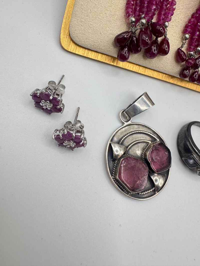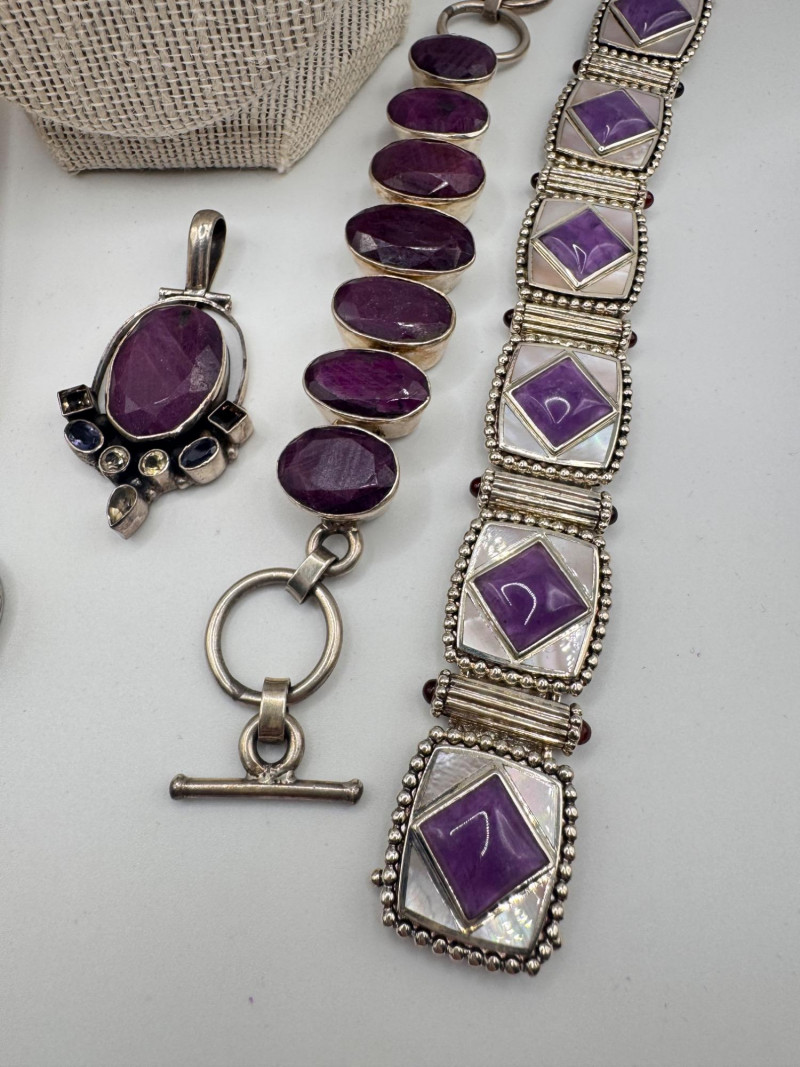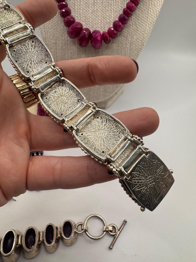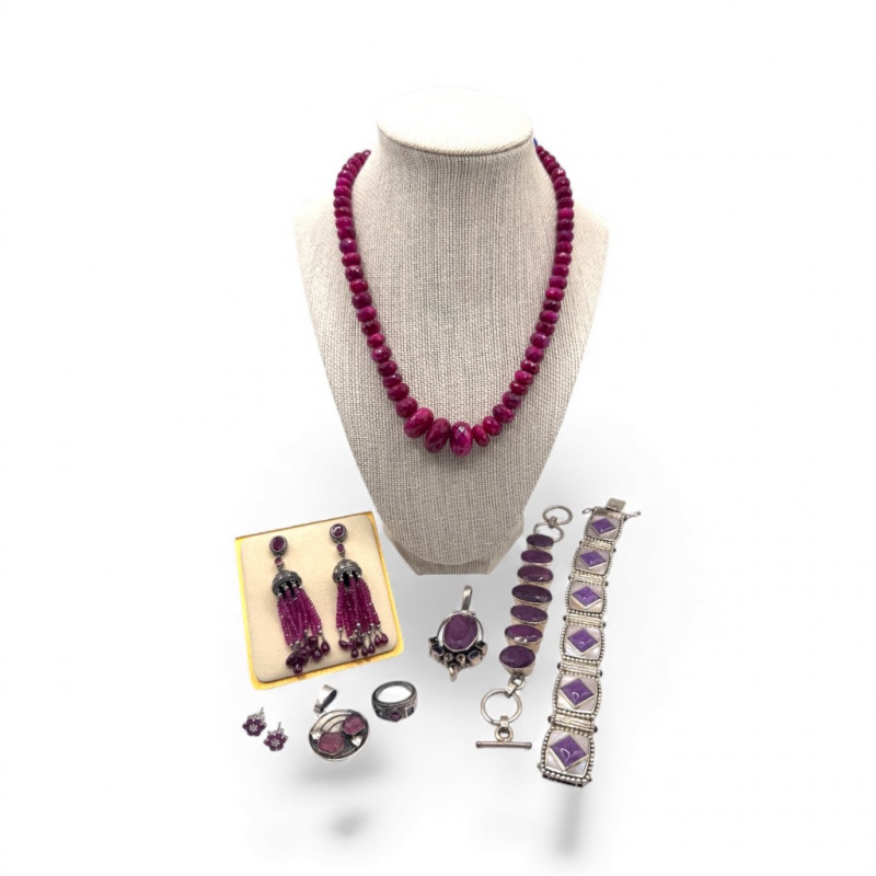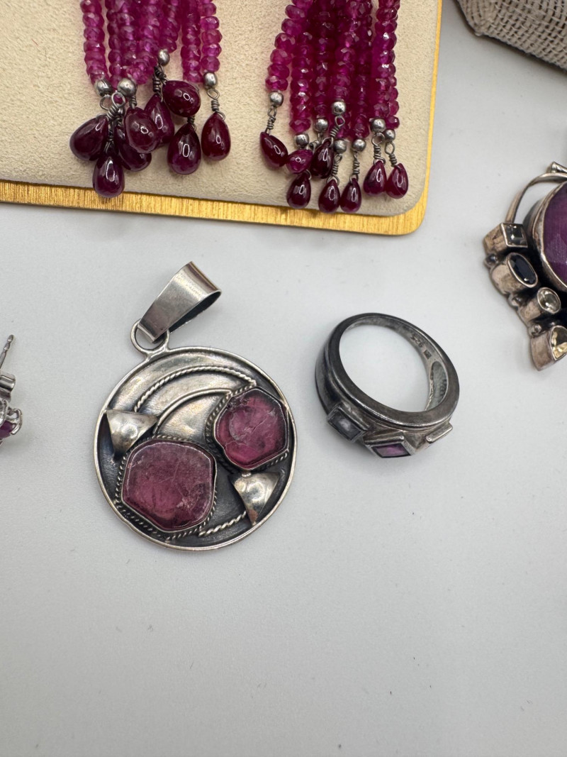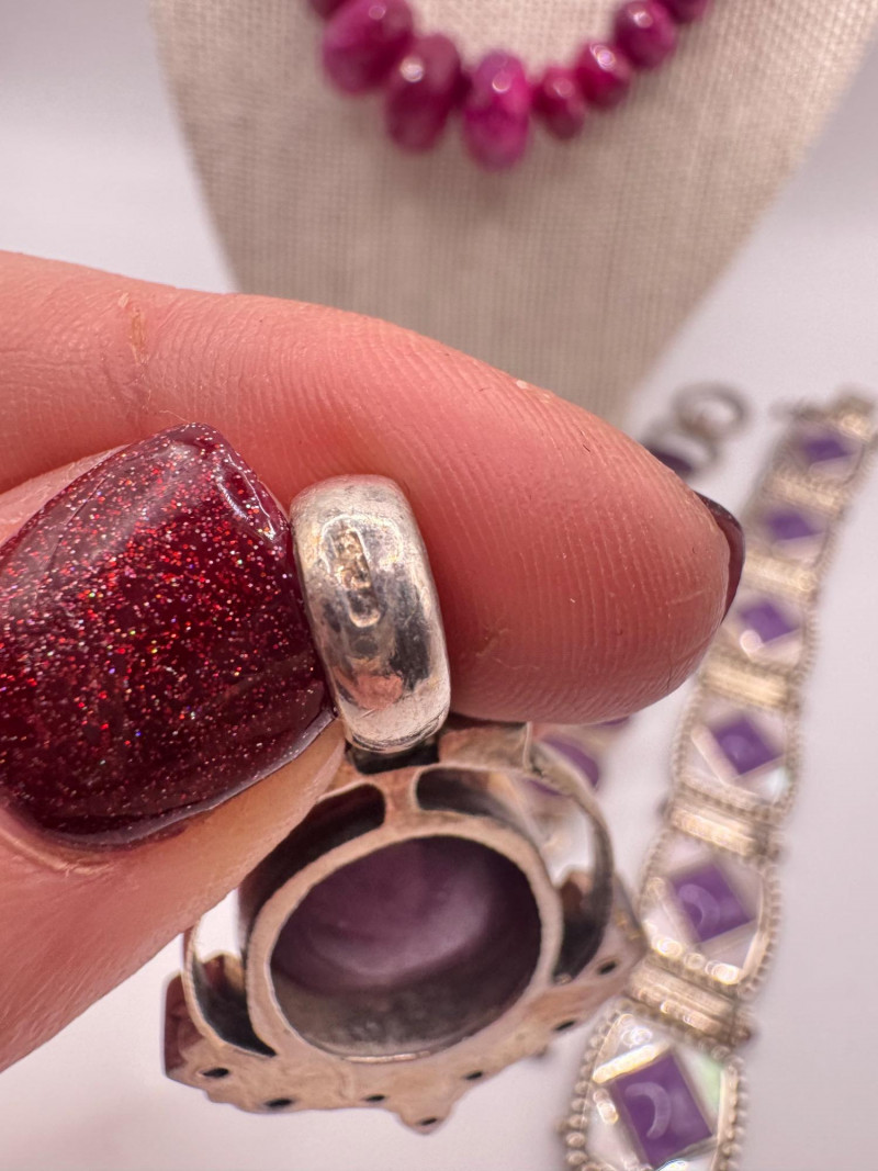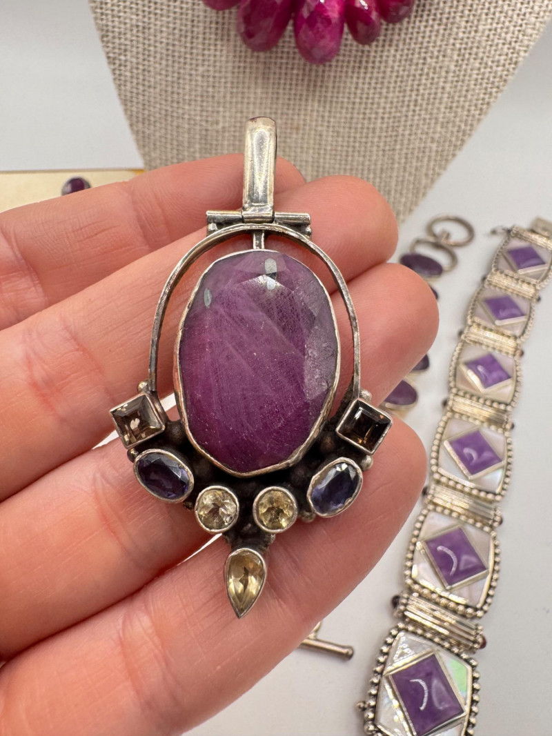 Chunky Gemstone Sterling Set – Stone Necklace, Pendants, Rings & More. Chunky faceted stone bead necklace (deep red tone) Two gemstone bracelets (fit approx. 7" wrists; one adjustable for smaller wrists): Bracelet with large ruby-colored oval stones in sterling (approx. 7") Purple stone inlay bracelet, marked 925 Sterling pendant with large purple cabochon and accent stones Sterling pendant with two raw/rough pink stones (tourmaline-style appearance) Long deep-red stone bead tassel earrings, sterling components Small deep-red stone cluster stud earrings Sterling ring with purple stone inlay, size 6