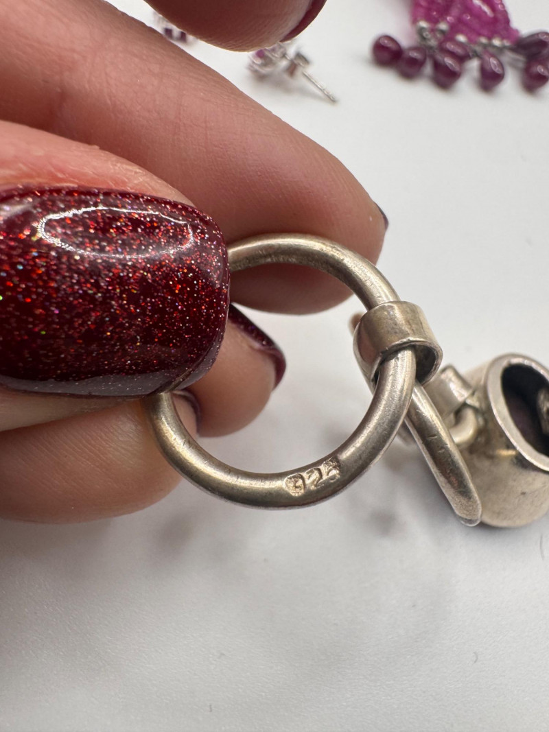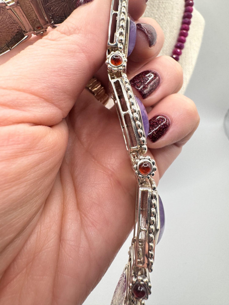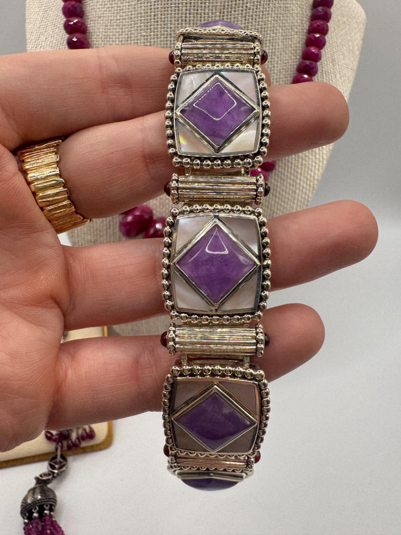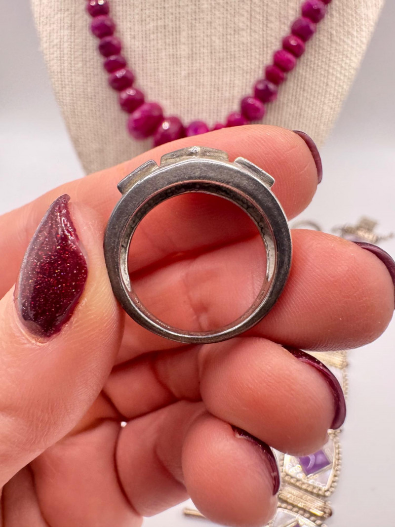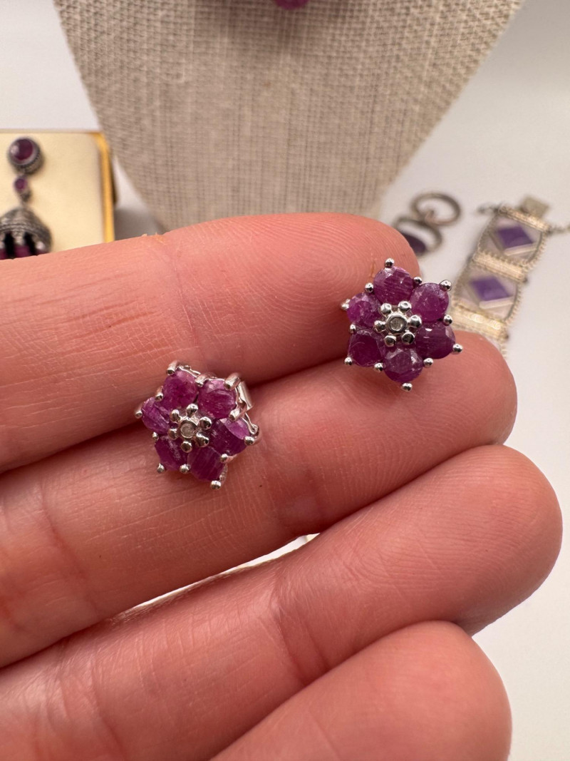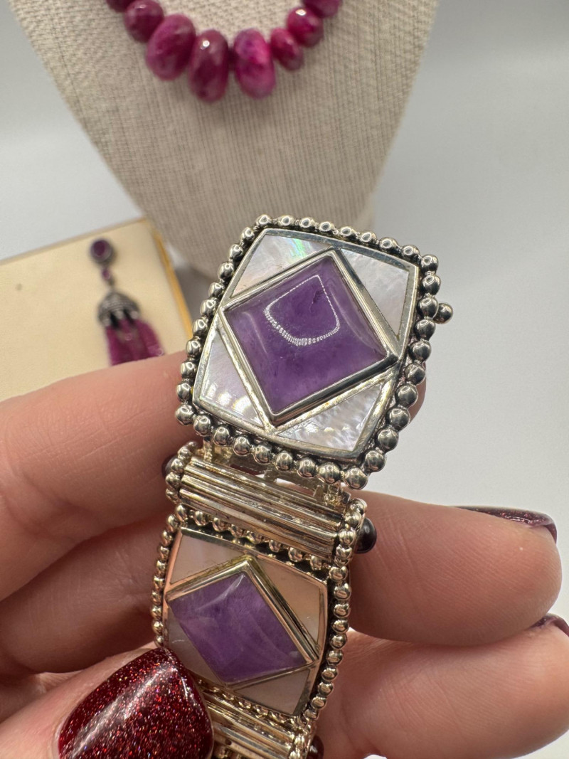 Chunky Gemstone Sterling Set – Stone Necklace, Pendants, Rings & More. Chunky faceted stone bead necklace (deep red tone) Two gemstone bracelets (fit approx. 7" wrists; one adjustable for smaller wrists): Bracelet with large ruby-colored oval stones in sterling (approx. 7") Purple stone inlay bracelet, marked 925 Sterling pendant with large purple cabochon and accent stones Sterling pendant with two raw/rough pink stones (tourmaline-style appearance) Long deep-red stone bead tassel earrings, sterling components Small deep-red stone cluster stud earrings Sterling ring with purple stone inlay, size 6