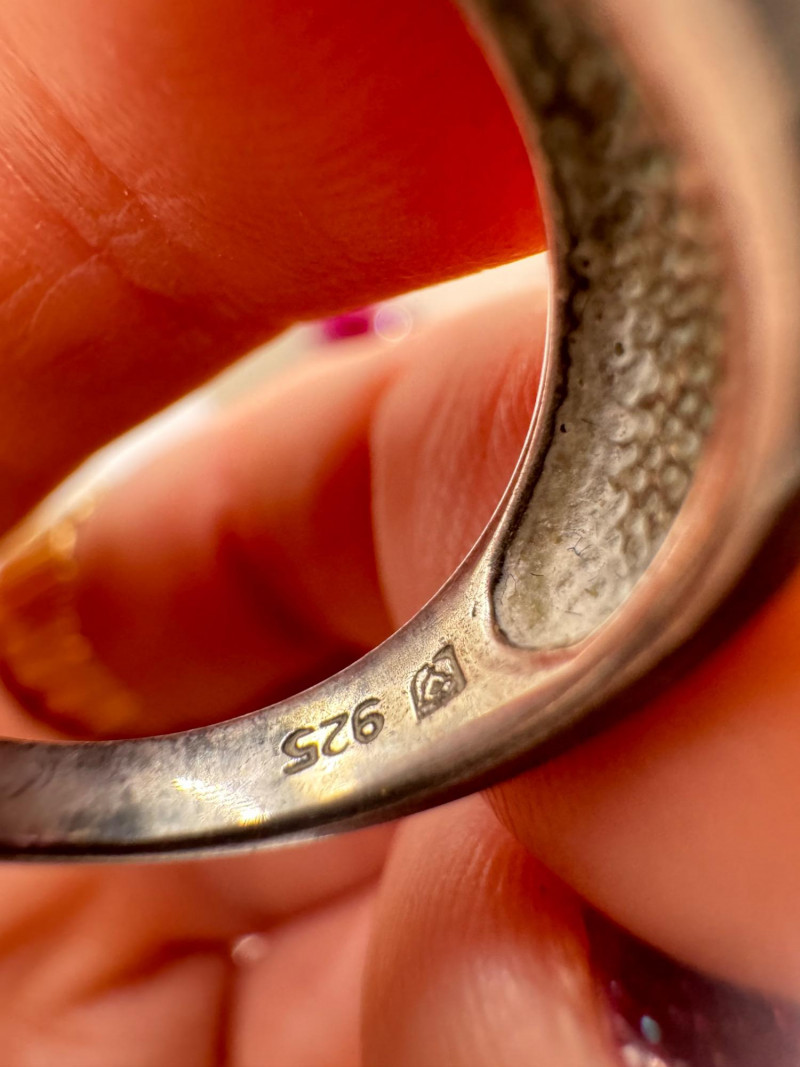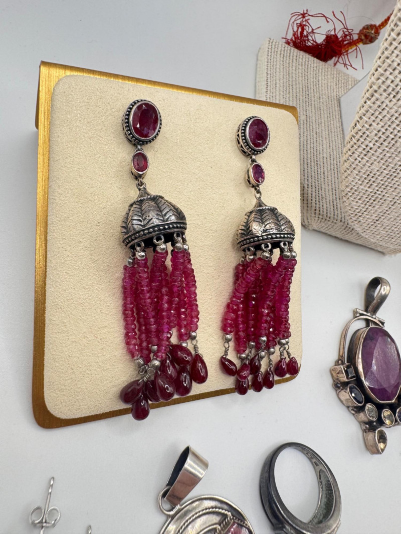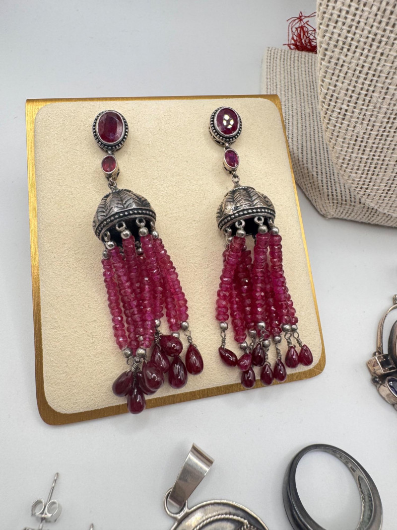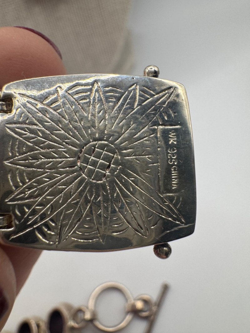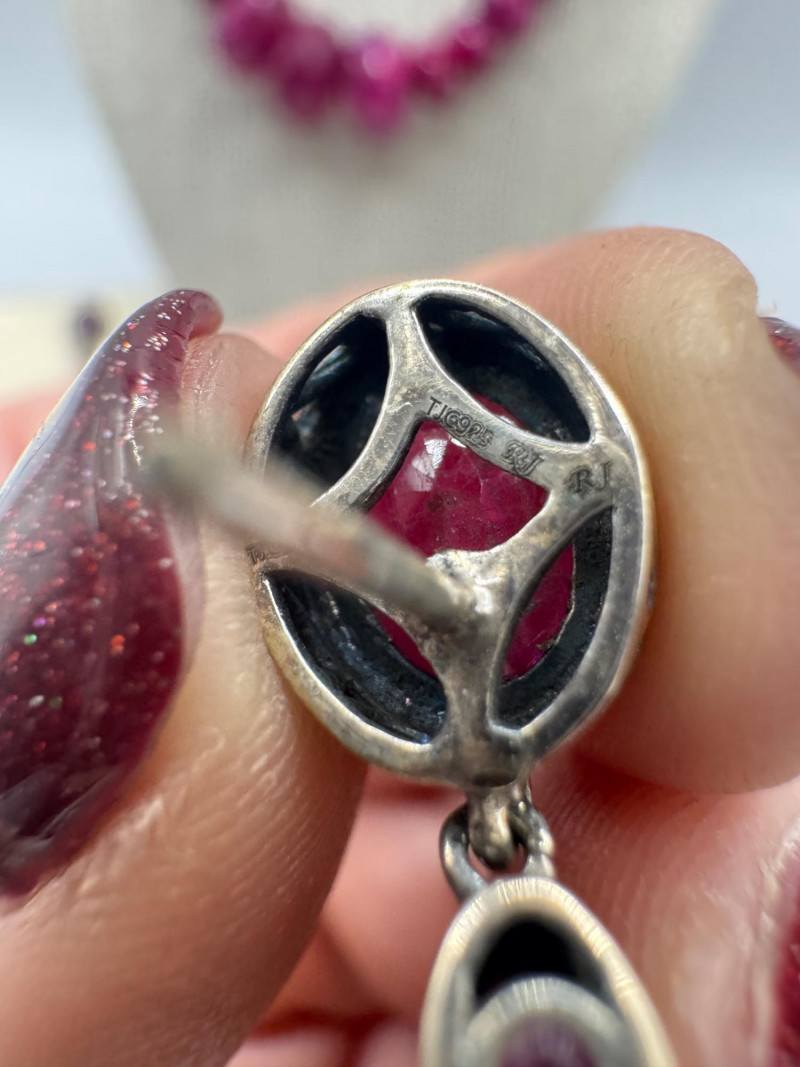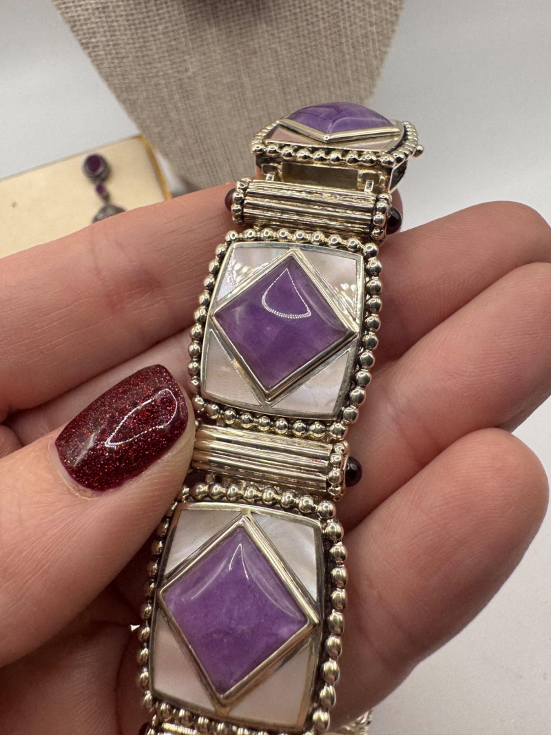 Chunky Gemstone Sterling Set – Stone Necklace, Pendants, Rings & More. Chunky faceted stone bead necklace (deep red tone) Two gemstone bracelets (fit approx. 7" wrists; one adjustable for smaller wrists): Bracelet with large ruby-colored oval stones in sterling (approx. 7") Purple stone inlay bracelet, marked 925 Sterling pendant with large purple cabochon and accent stones Sterling pendant with two raw/rough pink stones (tourmaline-style appearance) Long deep-red stone bead tassel earrings, sterling components Small deep-red stone cluster stud earrings Sterling ring with purple stone inlay, size 6