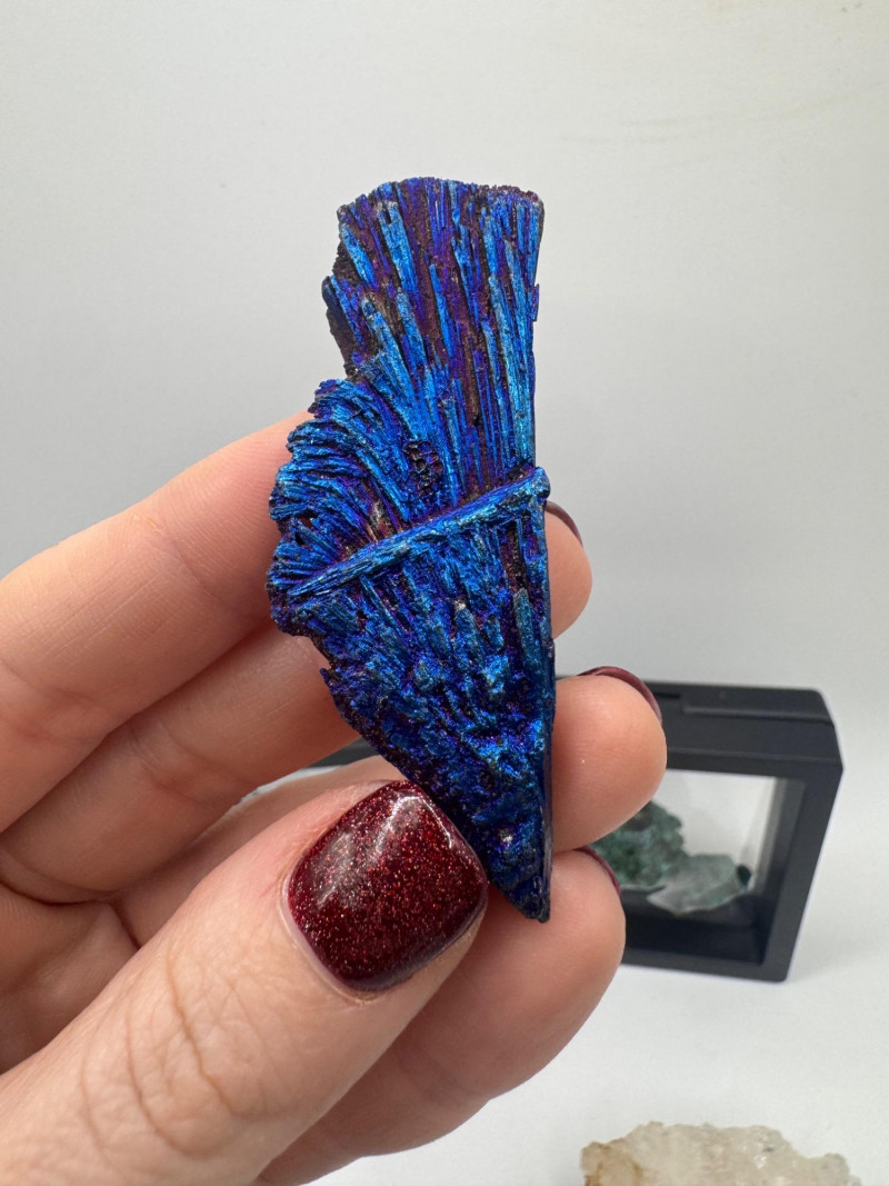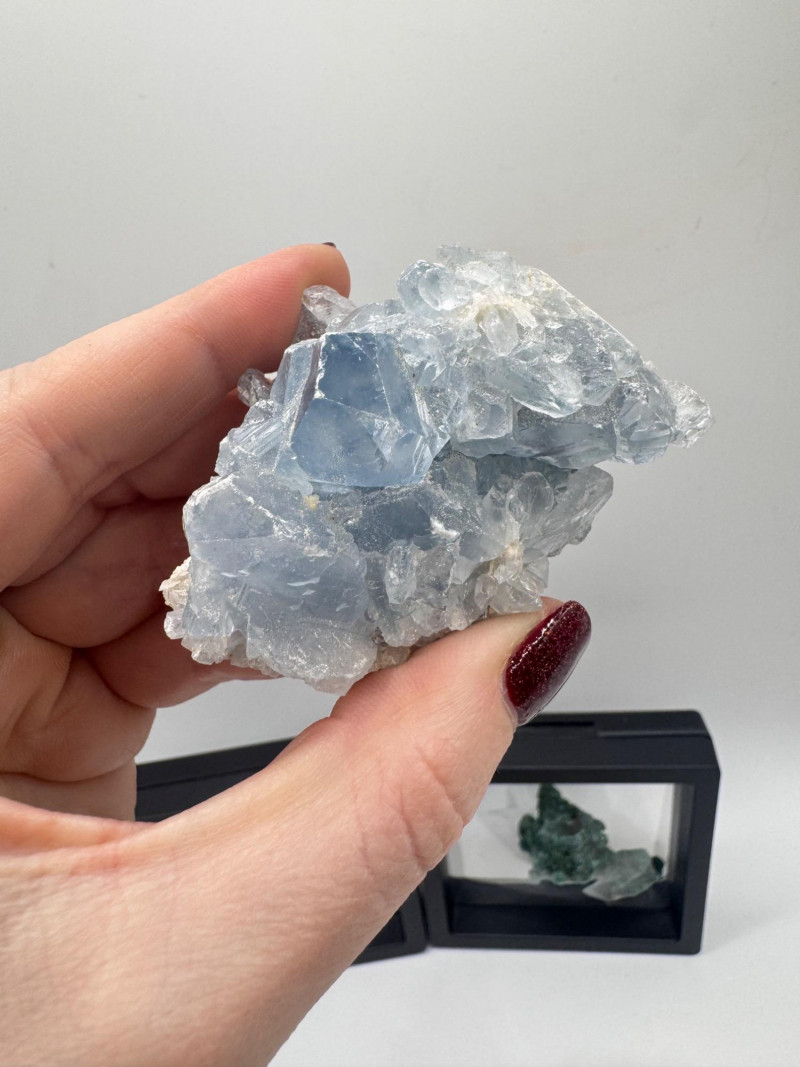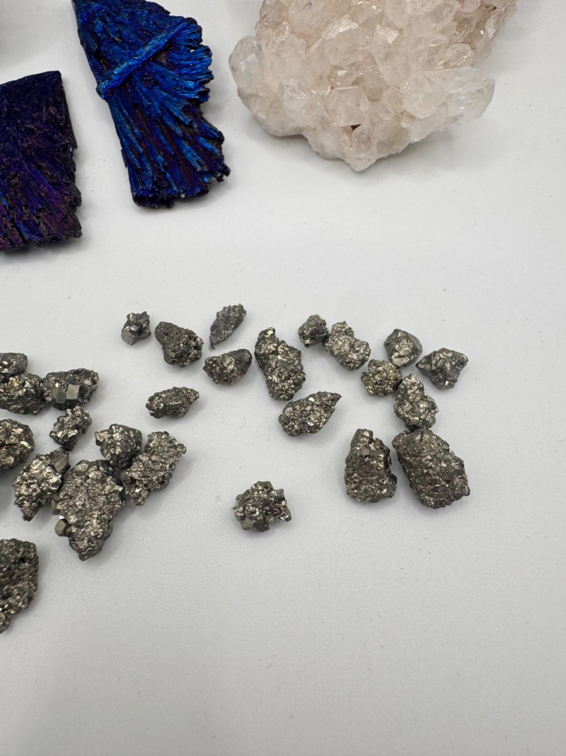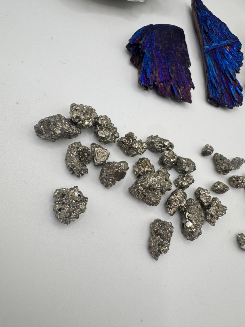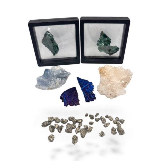 Black Tourmaline, Celestite, Calcite, Malachite & Pyrite Specimens Black Tourmaline (Iridescent “feather-like” pieces) — metallic blue/purple sheen Celestite cluster — light blue crystals, approx. 2.5" Calcite cluster — clear/white crystals, approx. 3" Green malachite specimens — 2 pieces, approx. 1.75"–2", each in display frame Pyrite nuggets — assorted small natural pieces General Disclaimer: All items are sold as-is. Jewelry, metals, gemstones, and other minerals have not been tested unless specifically noted. No guarantees are made regarding metal content, gemstone type, or origin. Refunds will not be issued based on identification, classification, or perceived quality.