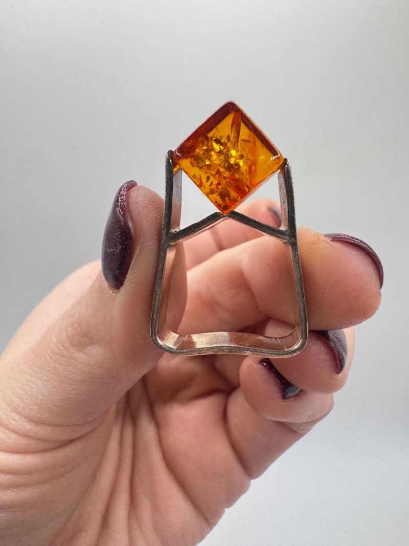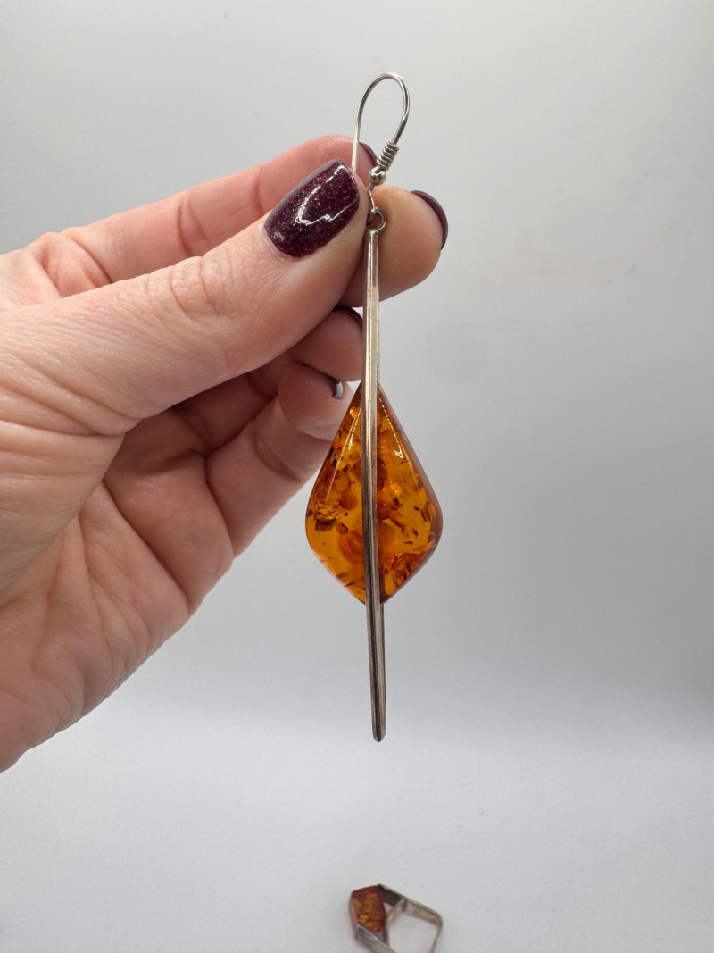 Sterling Silver & Amber Earrings & Ring + Signed Brooch.