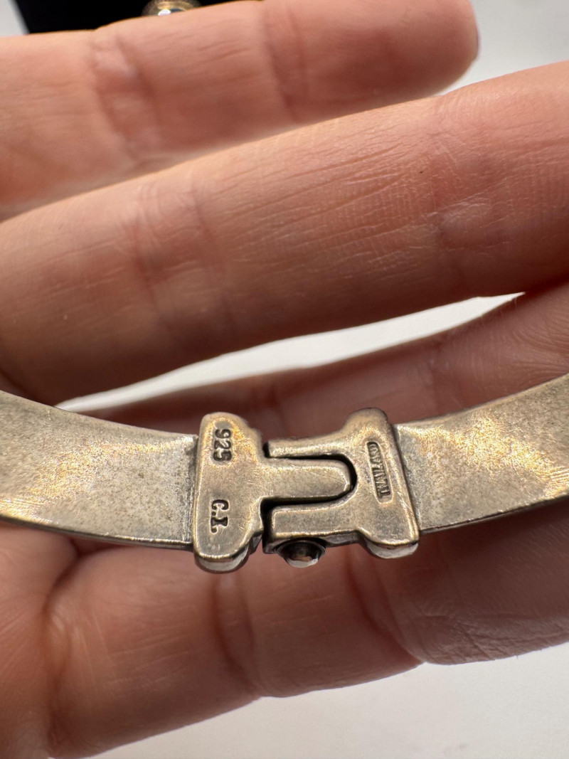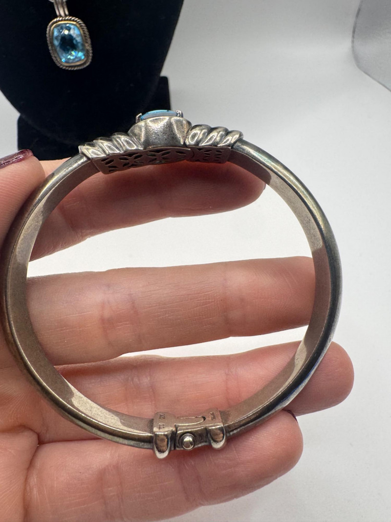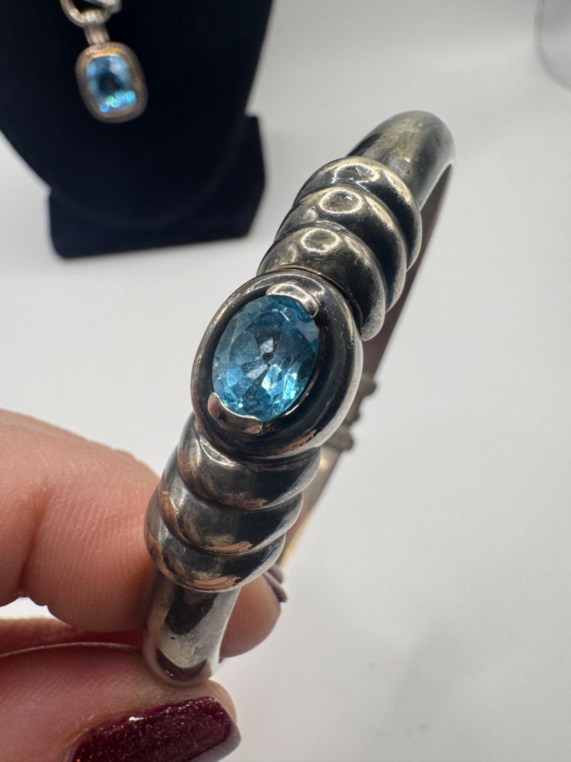 • Bracelet: hinged sterling bangle marked 925 (Thailand), set with oval blue stone