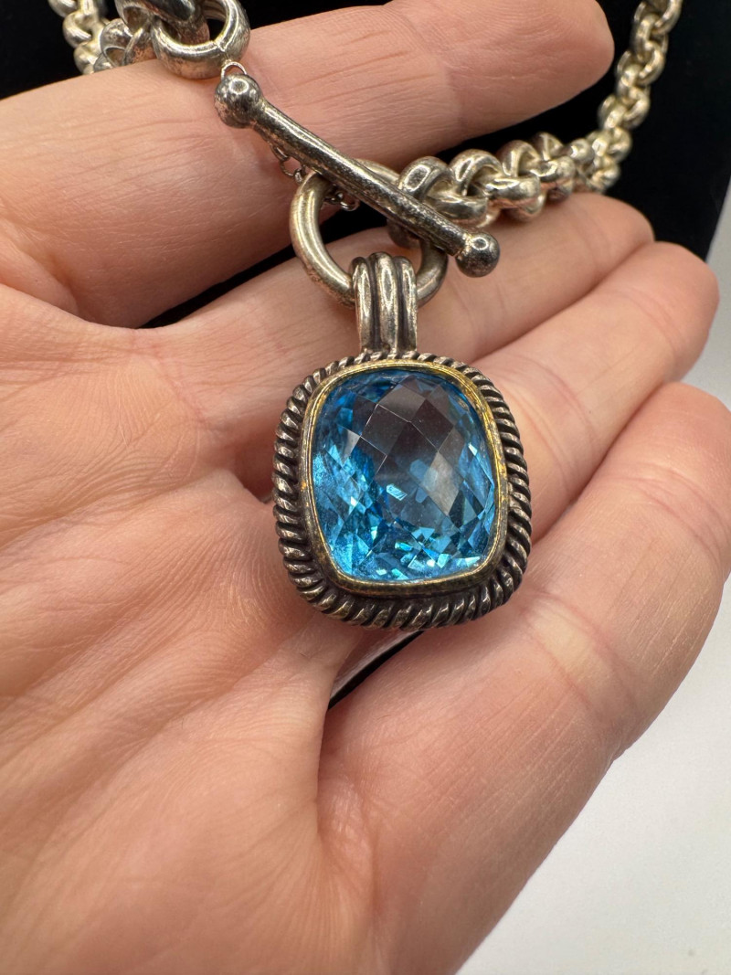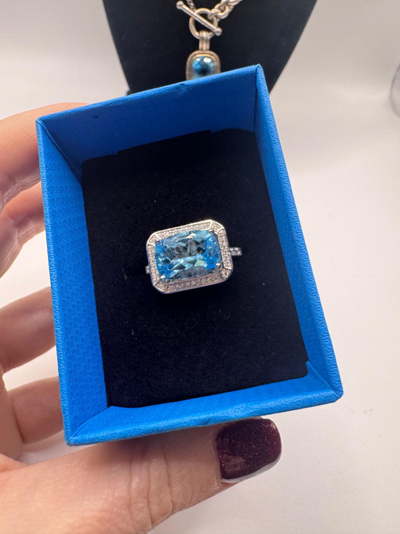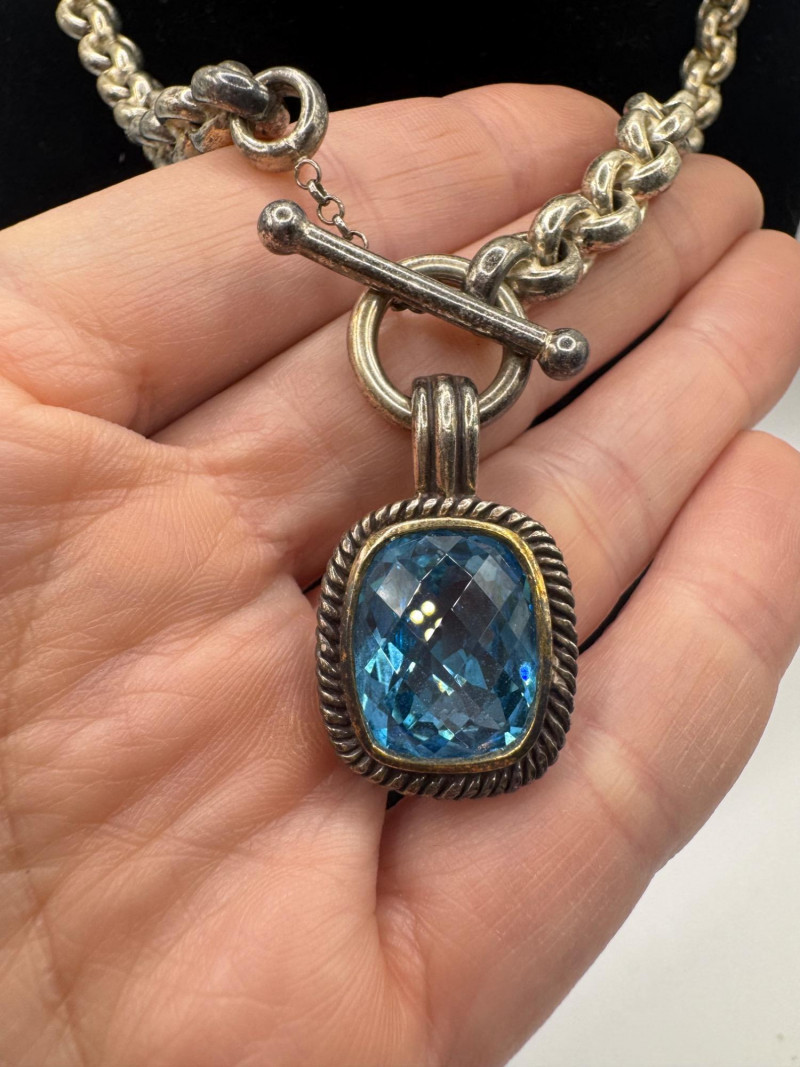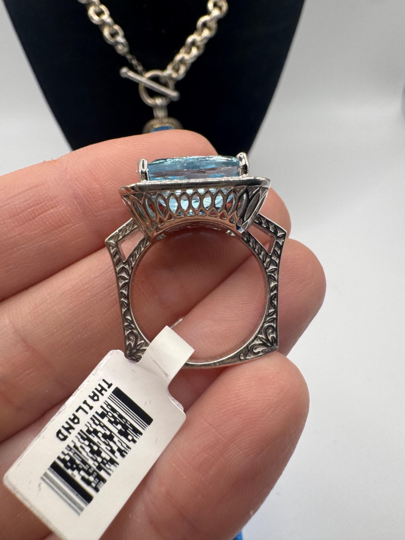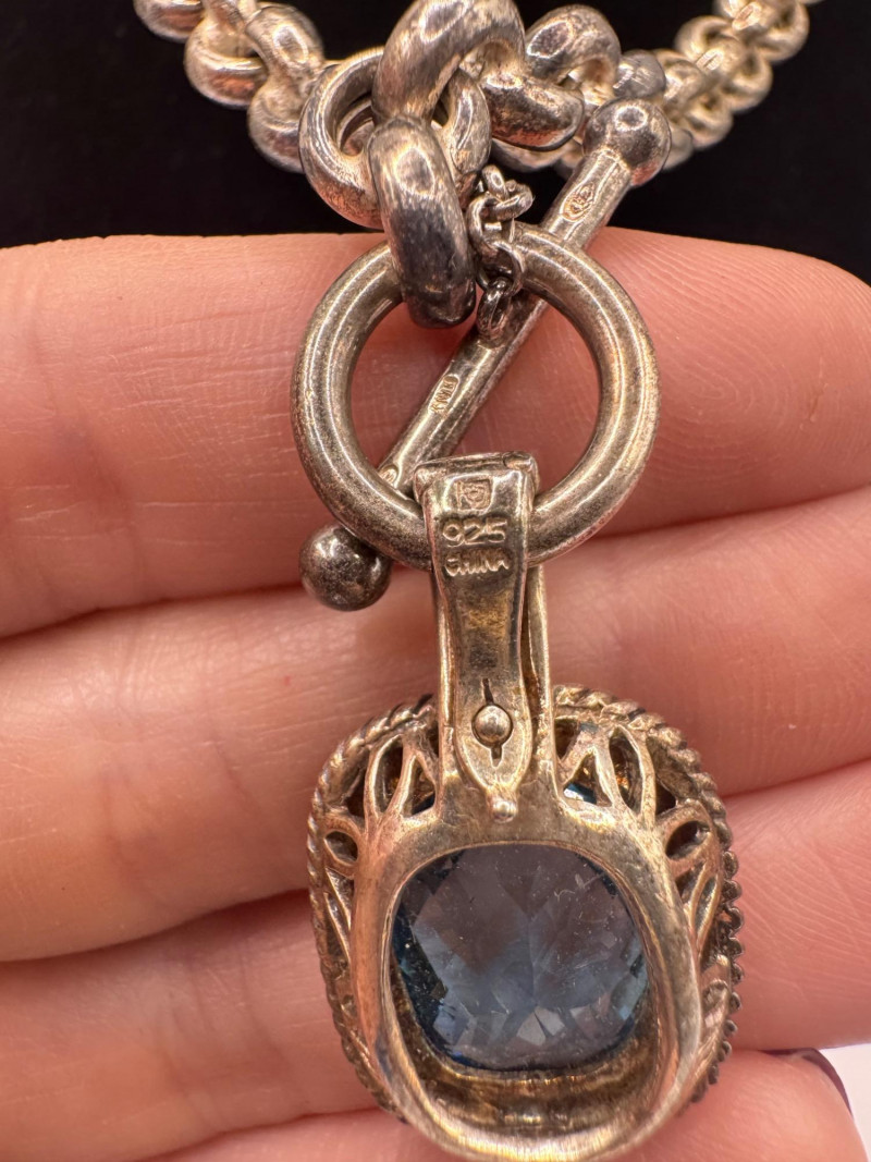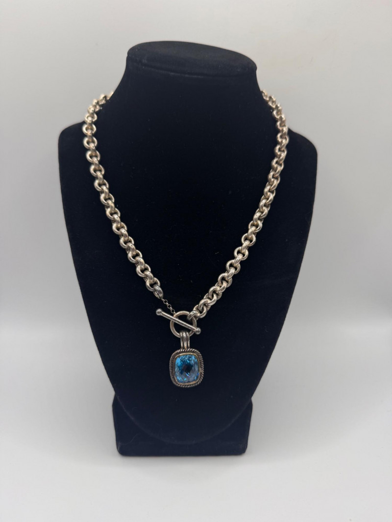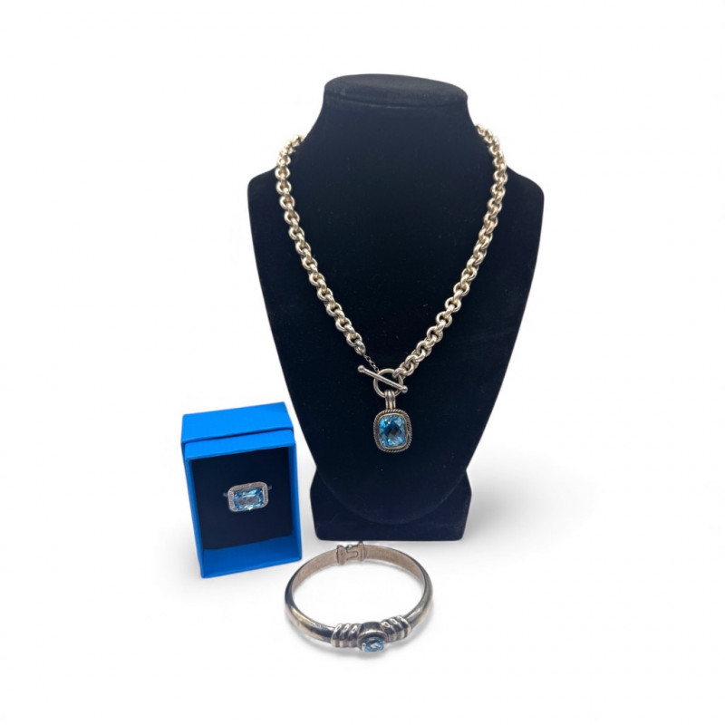 Sky Blue Topaz & Sterling Necklace, Ring & Bracelet 75.44g. • Necklace: heavy link chain with toggle clasp & blue topaz pendant General Disclaimer: All items are sold as-is. Jewelry, metals, gemstones, and other minerals have not been tested unless specifically noted. No guarantees are made regarding metal content, gemstone type, or origin. Refunds will not be issued based on identification, classification, or perceived quality.
