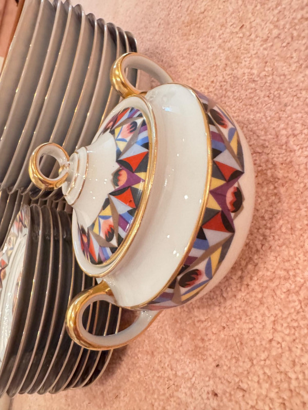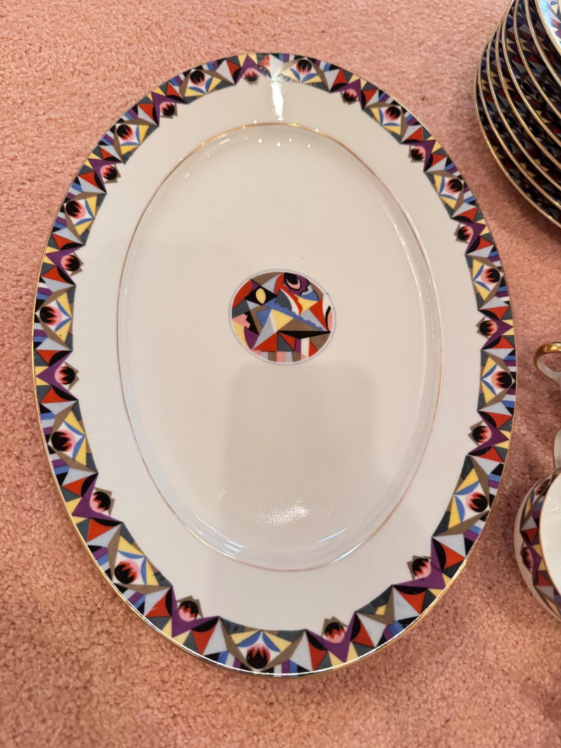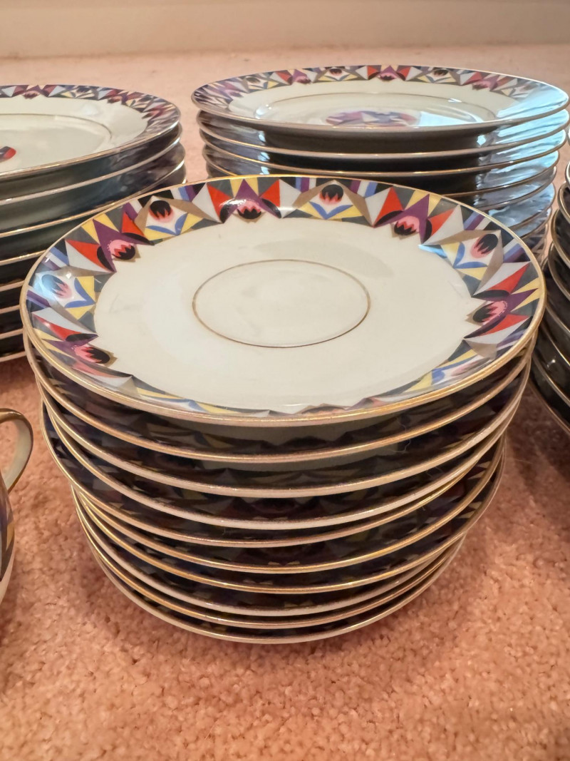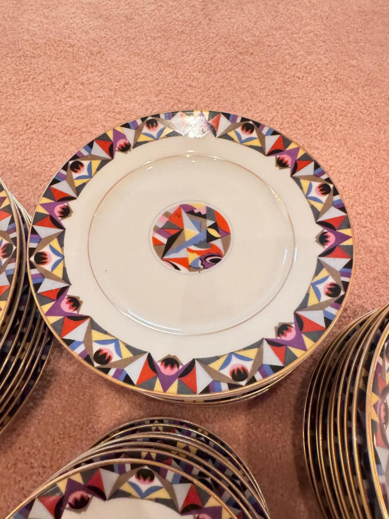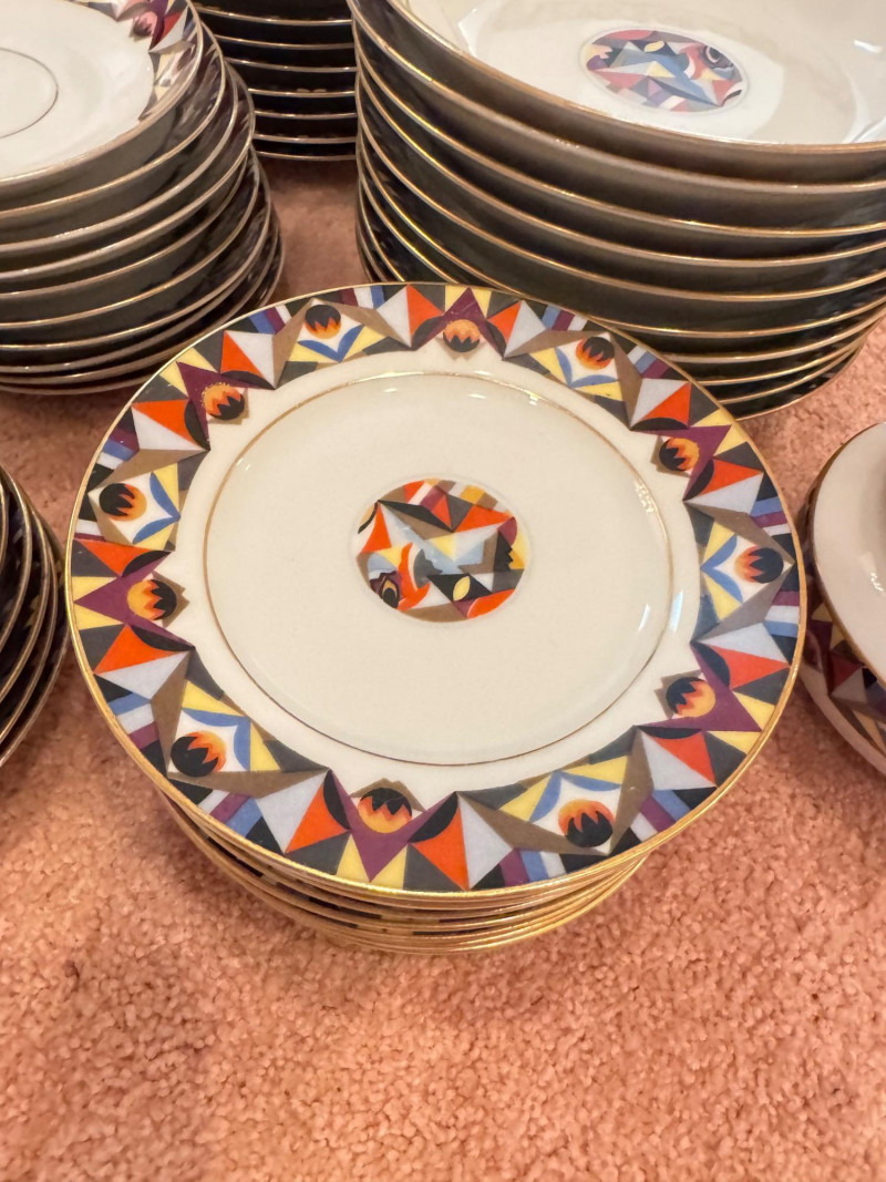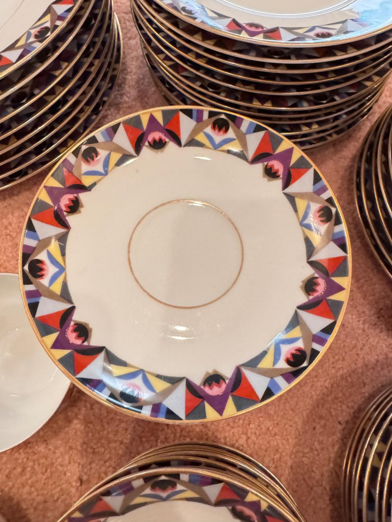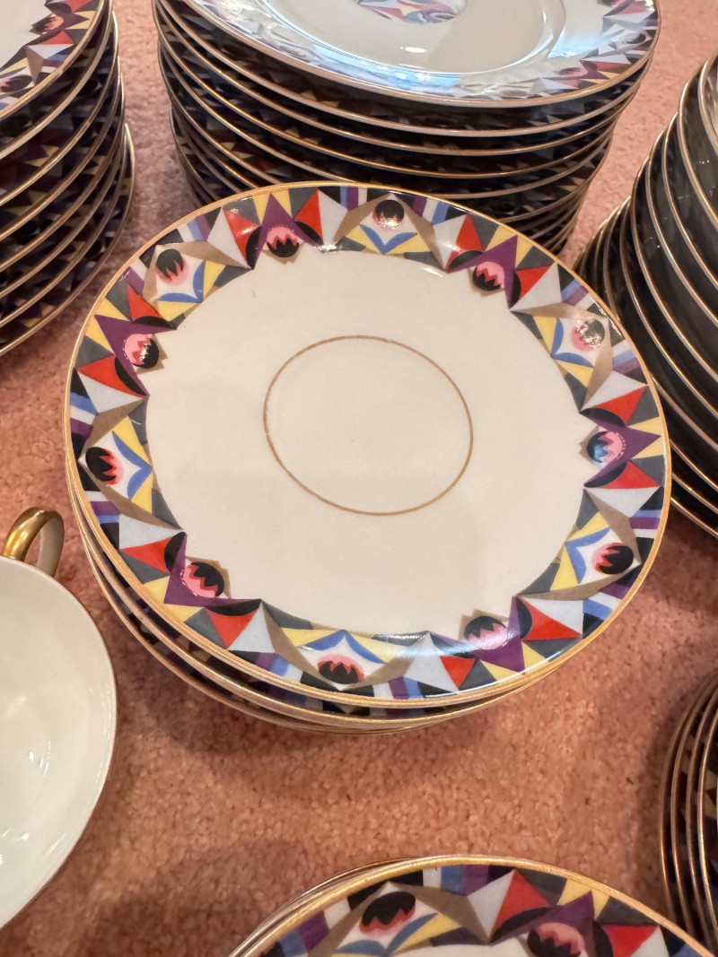 65pc Johann Haviland Bavaria Dinnerware – Geometric Multicolor Pattern. 65-piece porcelain dinnerware set by Johann Haviland Bavaria, multicolor geometric border with gold trim. Condition: Some pieces show hairline cracks (see photos). Gold trim wear possible due to age.