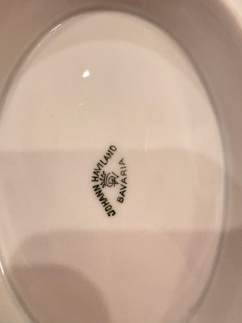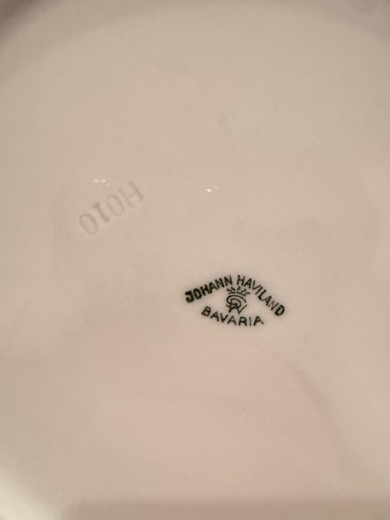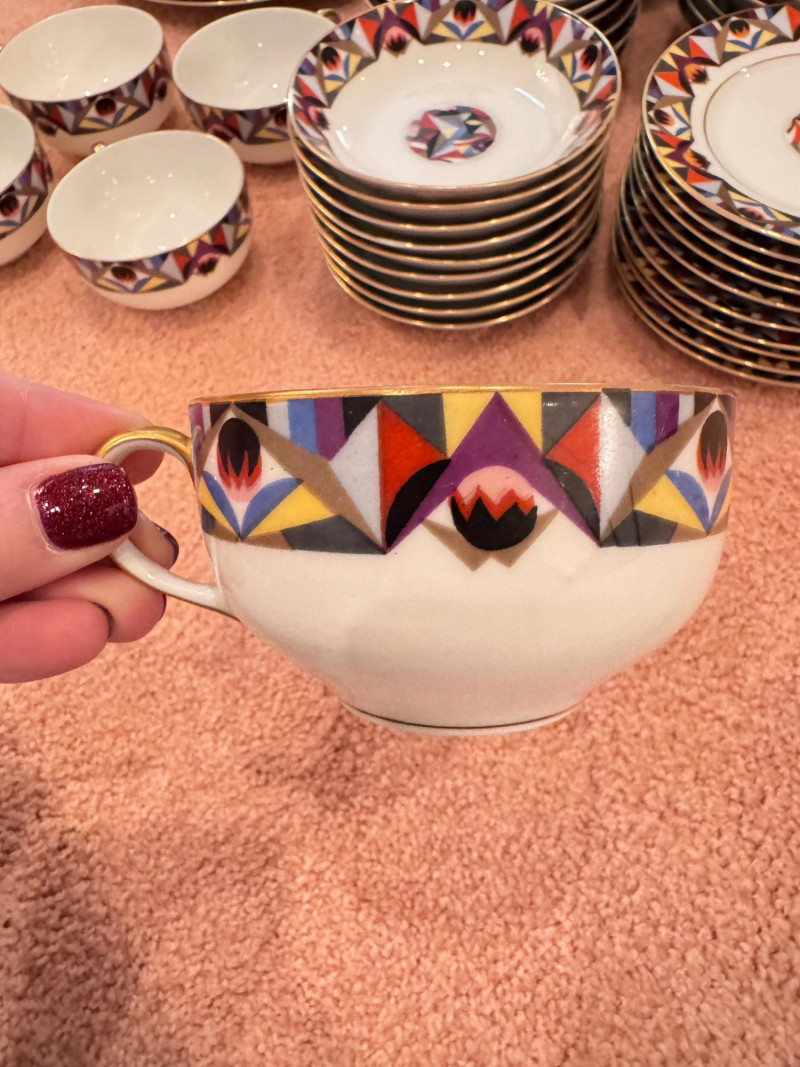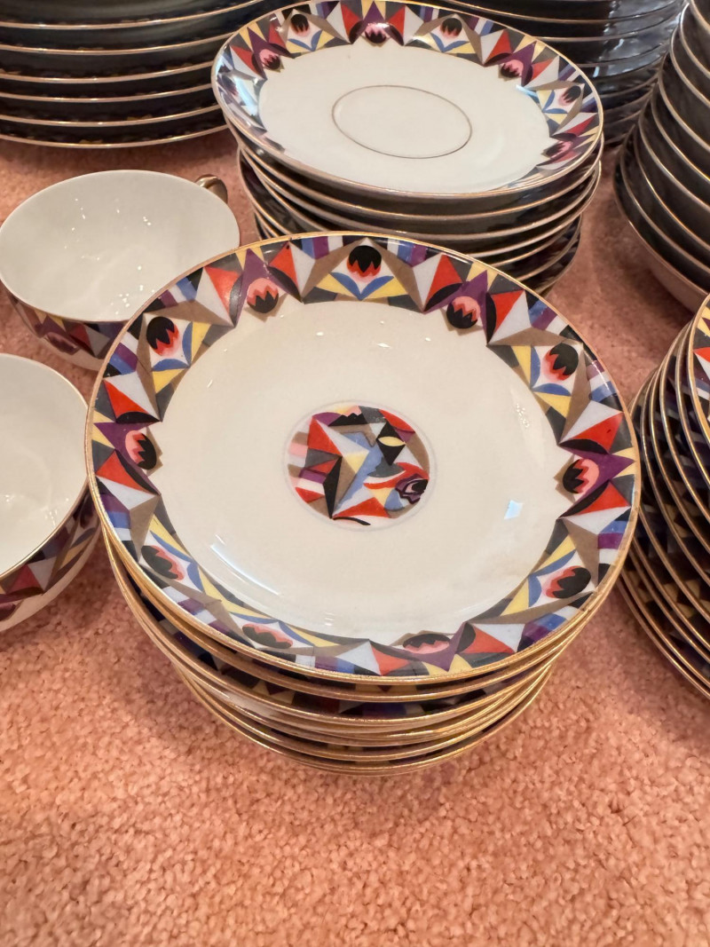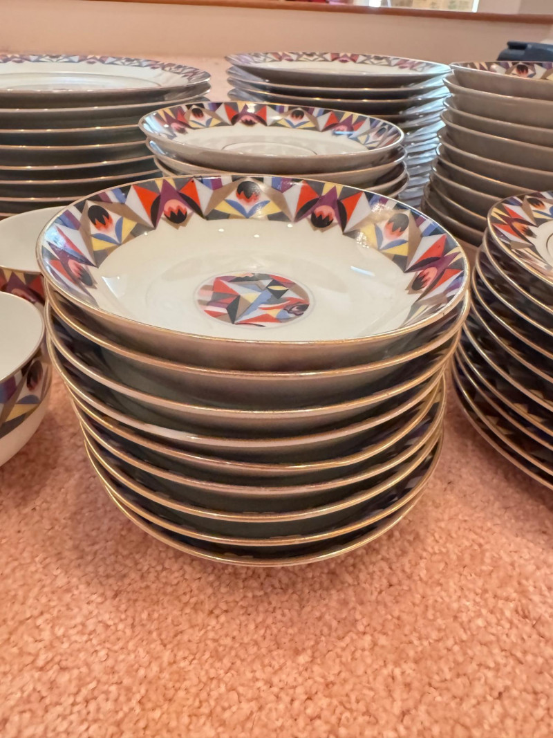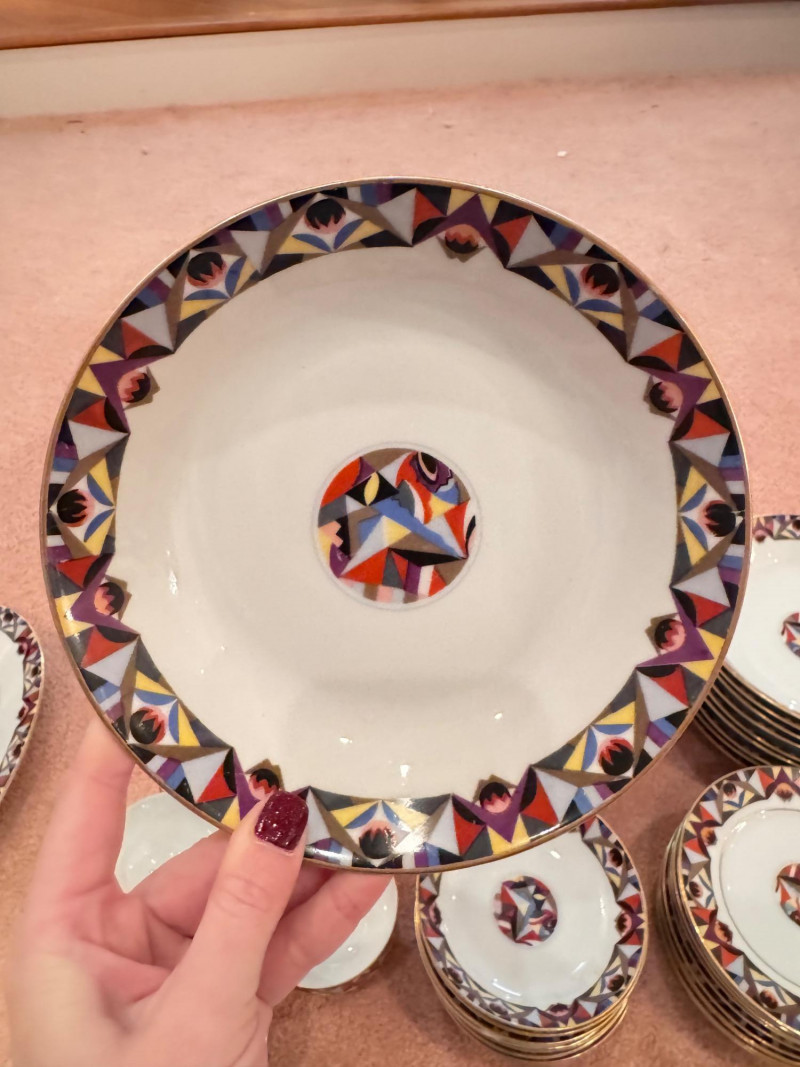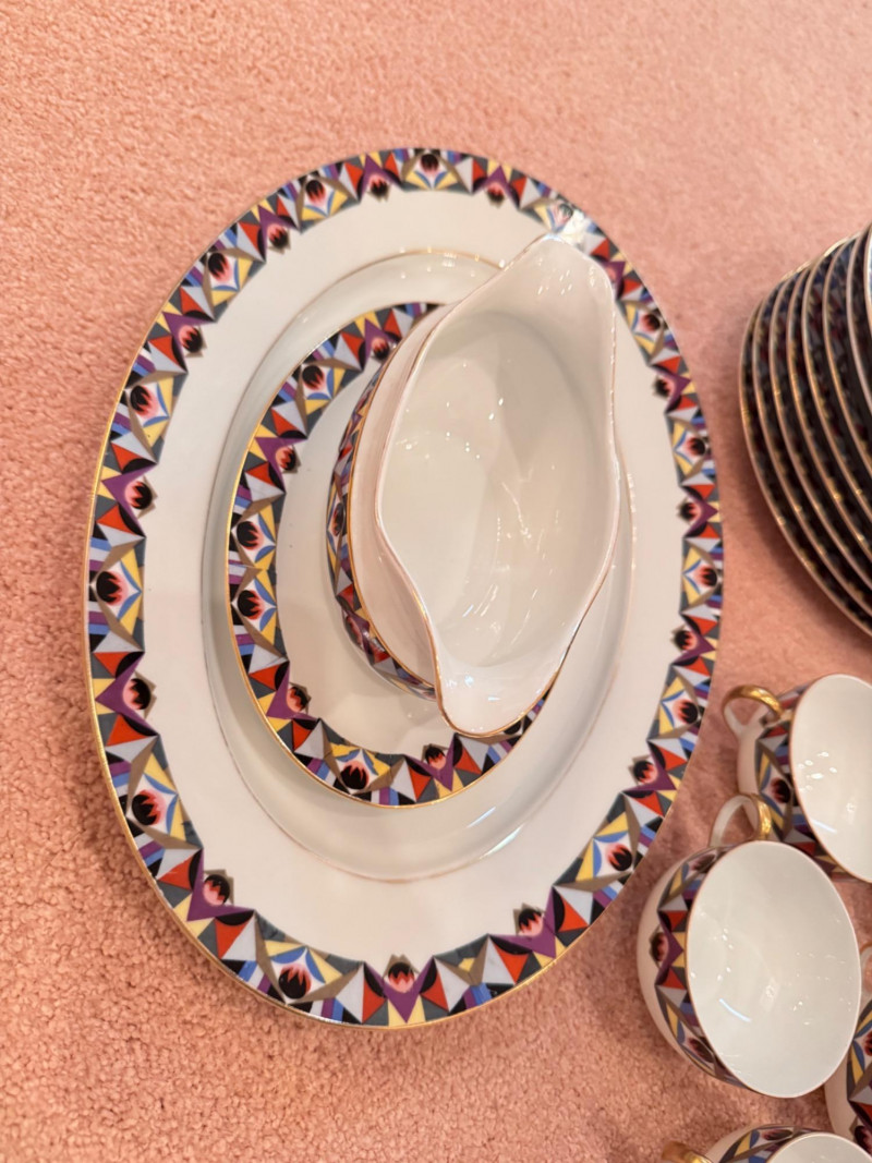 65pc Johann Haviland Bavaria Dinnerware – Geometric Multicolor Pattern. 65-piece porcelain dinnerware set by Johann Haviland Bavaria, multicolor geometric border with gold trim. Condition: Some pieces show hairline cracks (see photos). Gold trim wear possible due to age.