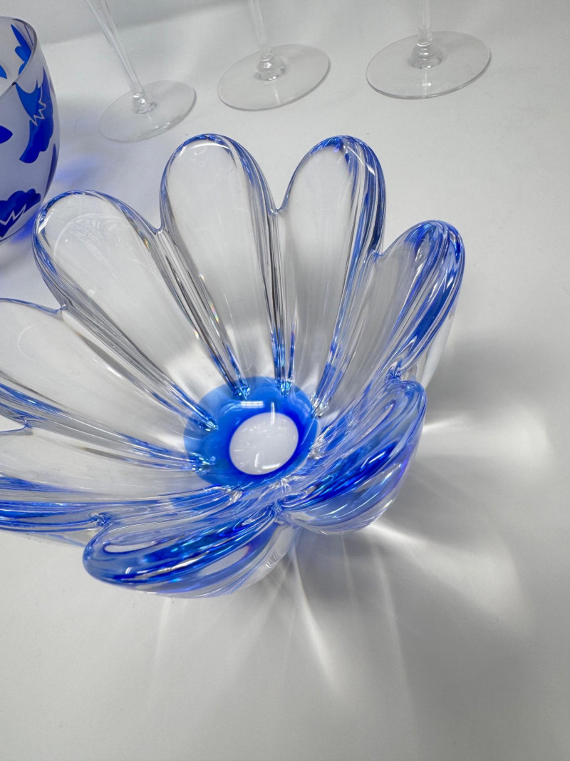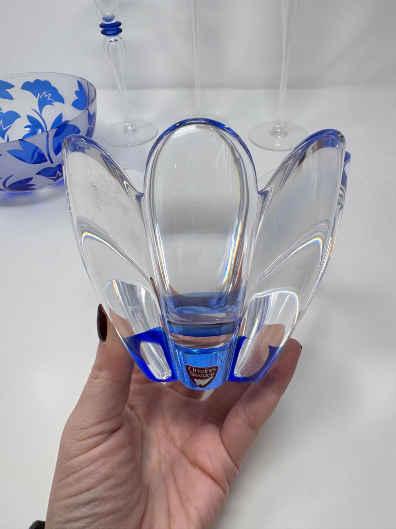 Heavy clear crystal with vivid cobalt blue base; retains original Orrefors sticker and etched signature.