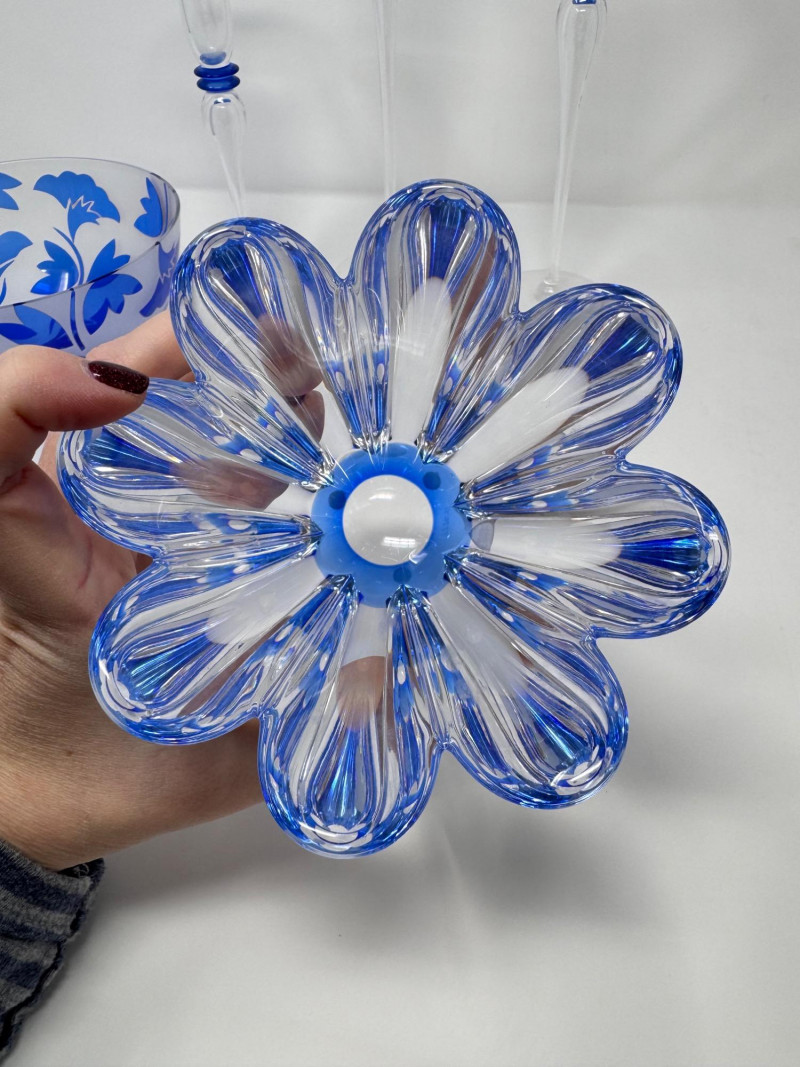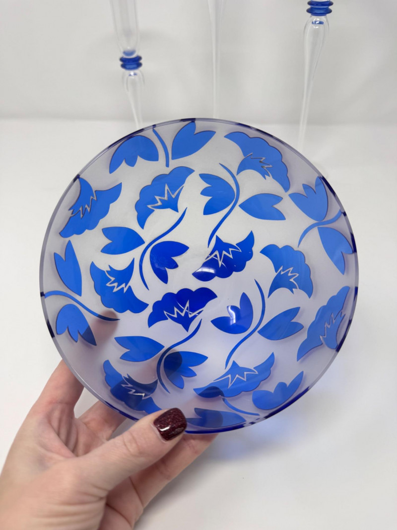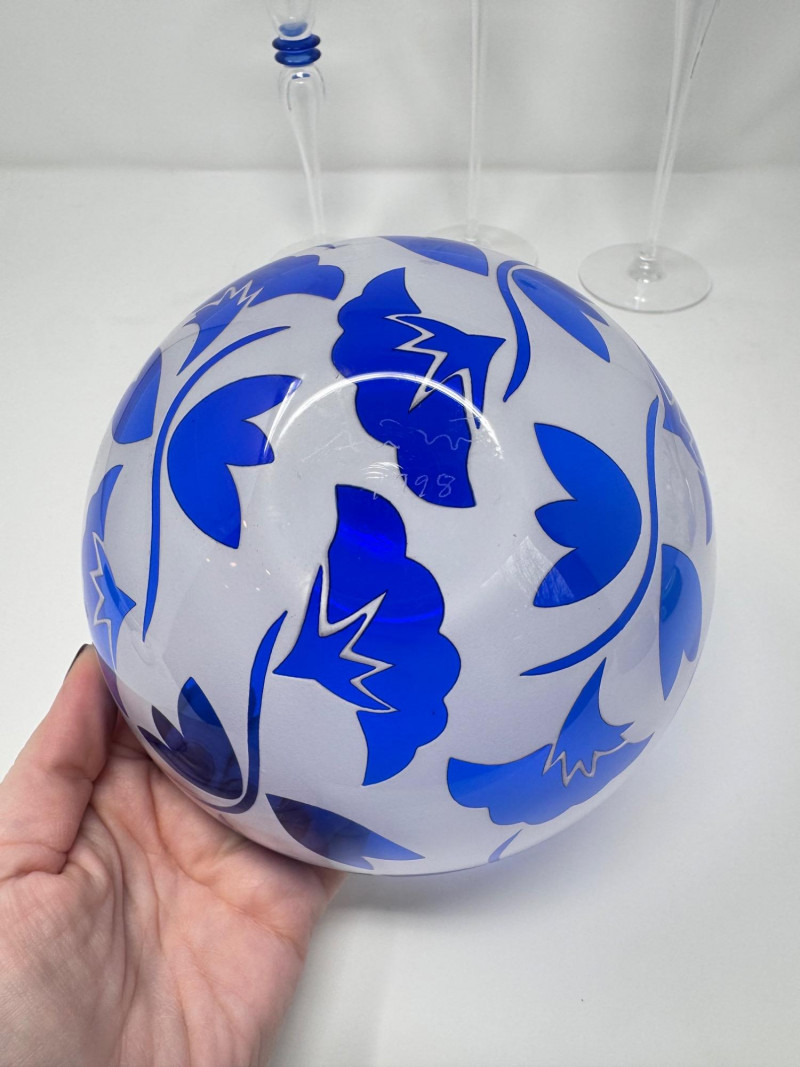 Frosted and clear glass with deep blue floral overlays; artist-signed on bottom (1998).