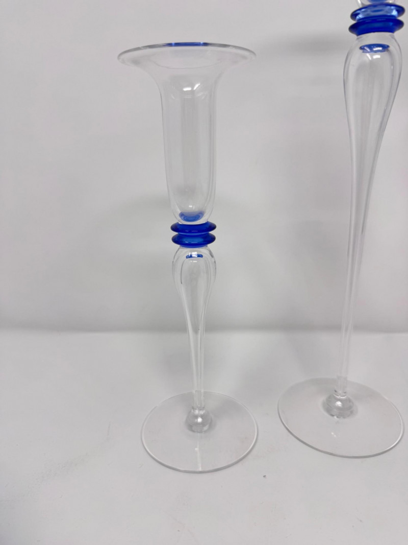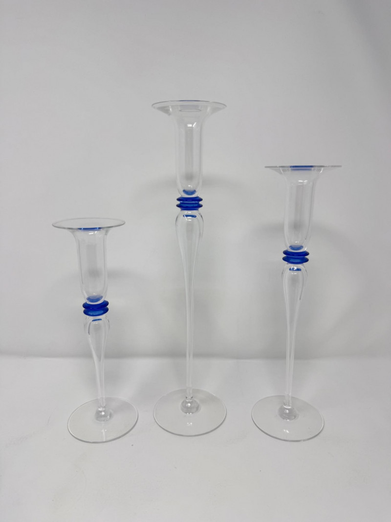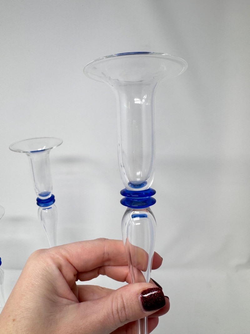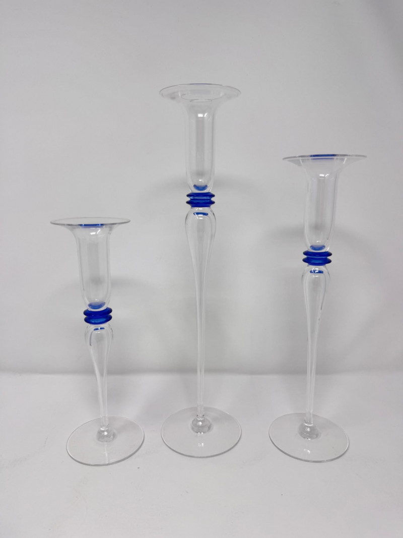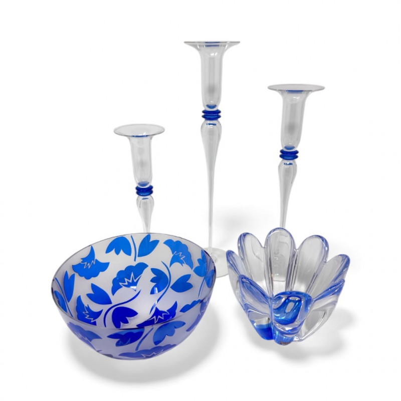 Orrefors Bowl, Signed Cut-Glass Bowl & Blue Blown Glass Candlesticks. Three Hand-Blown Glass Candlesticks – clear with cobalt blue accents; heights approx. 8", 10", and 12". Orrefors Sweden Crystal Bowl – 4" tall x 5" wide. Signed Blue Floral Cut-Glass Bowl – 6.5" wide x 3.5" tall.