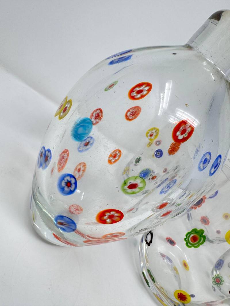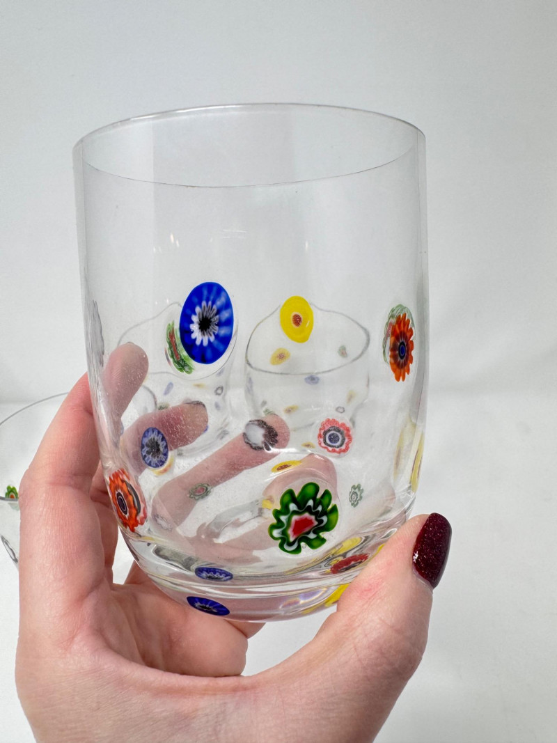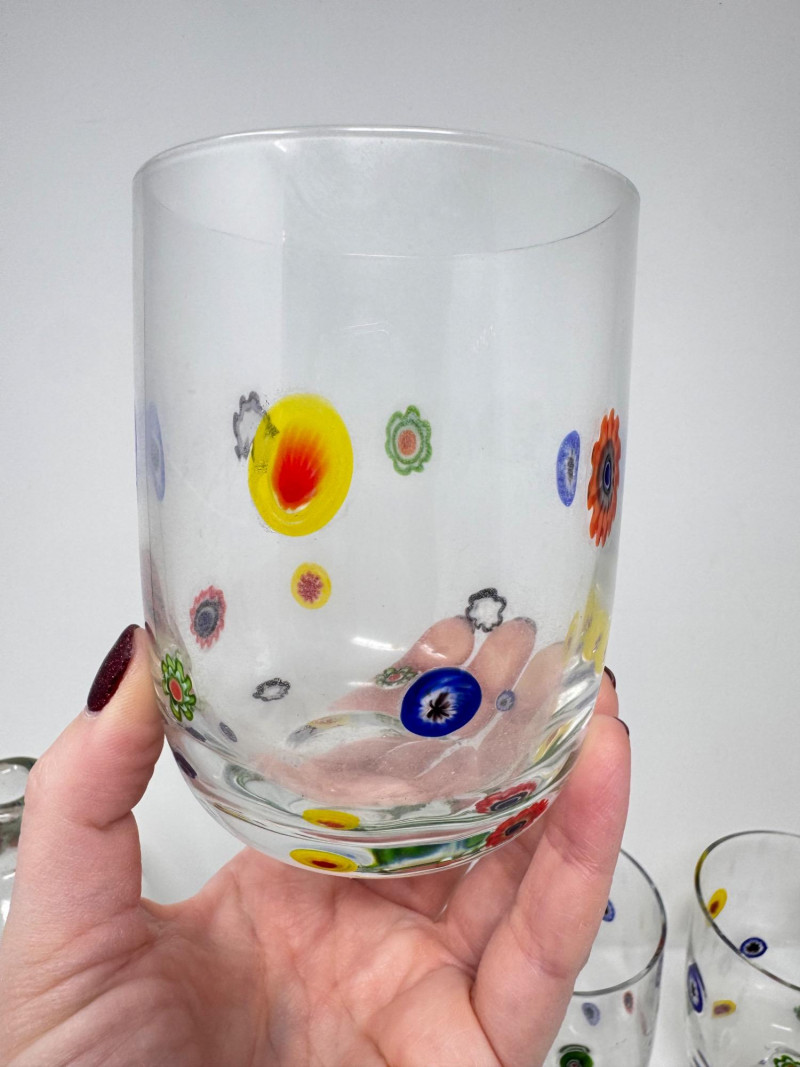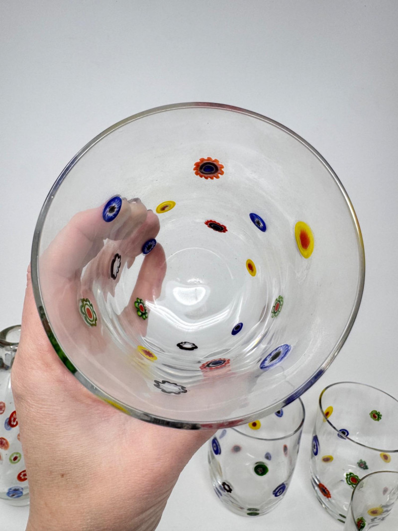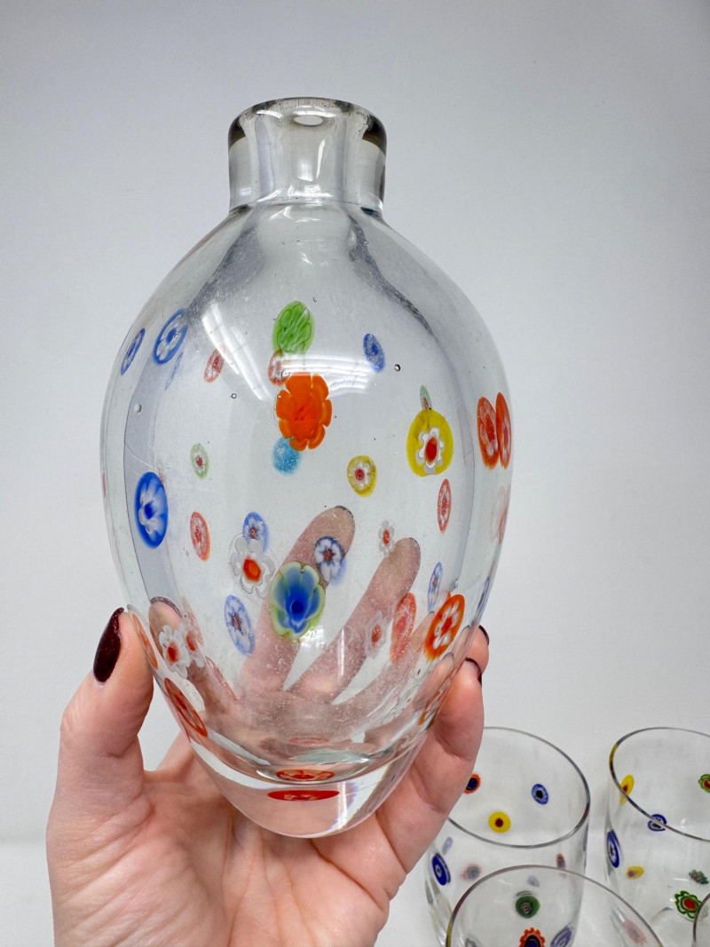 Murano Style Clear Millefiori Vase w/ 4 Matching Glasses – 5 Pc Set.
