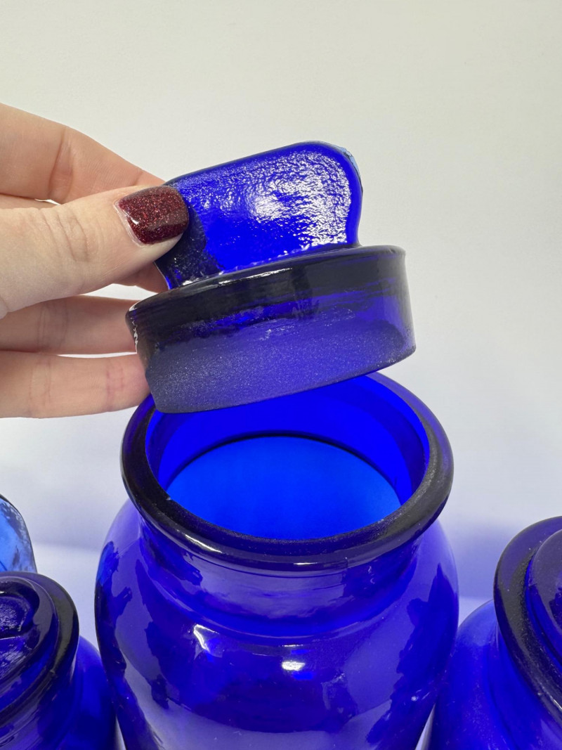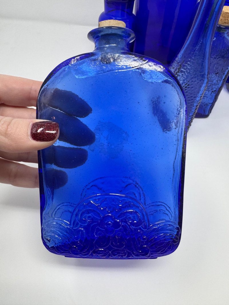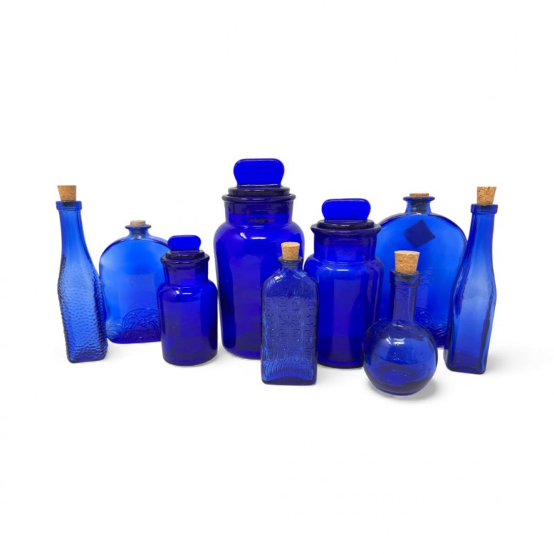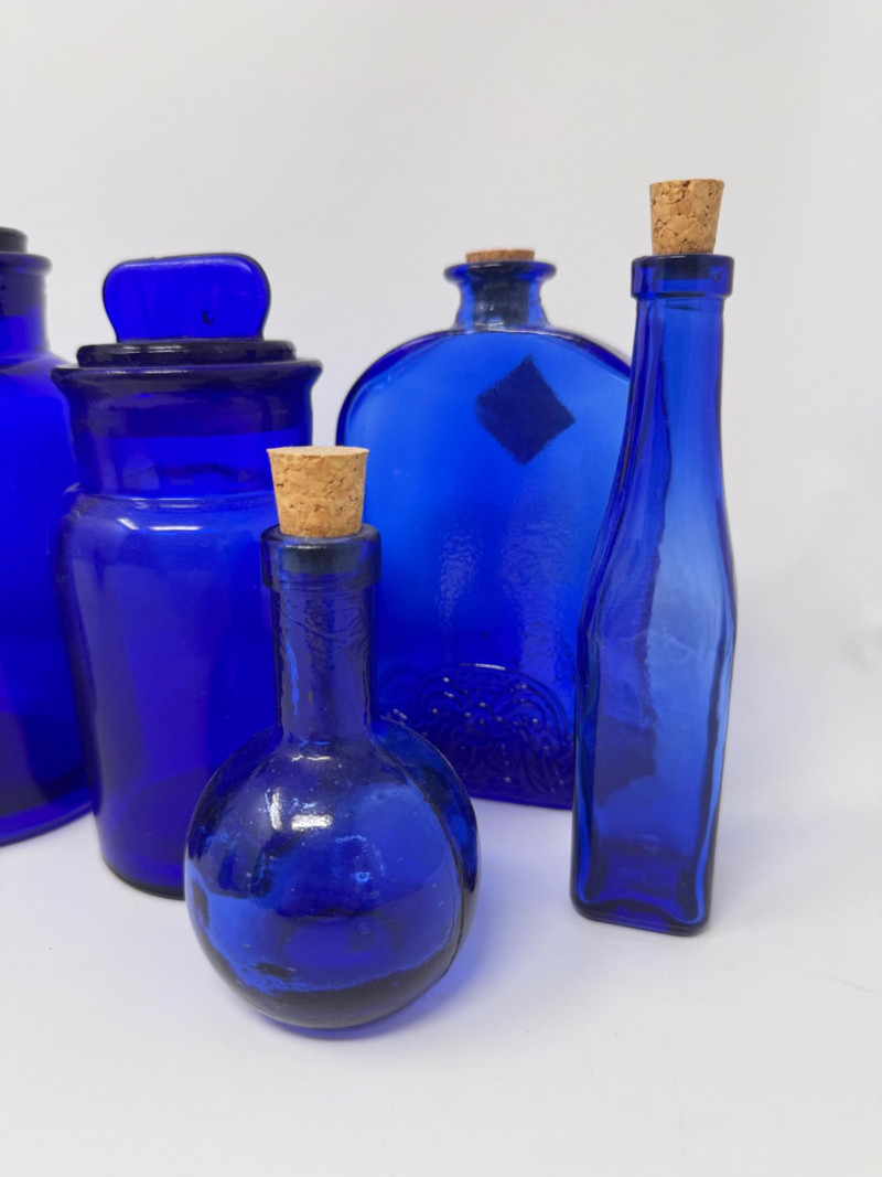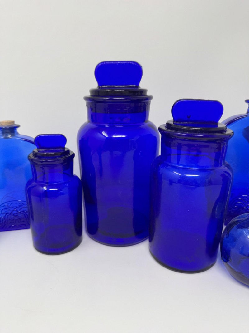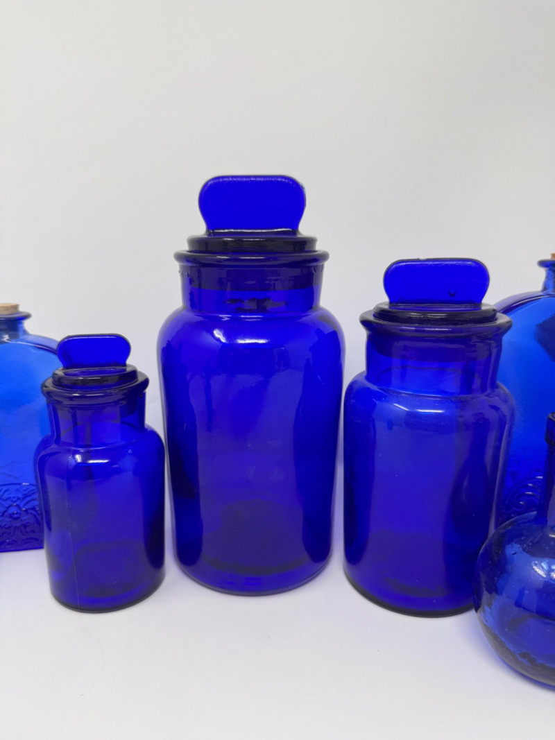 Vintage Cobalt Blue Glass Bottle & Canister Lot – 9 Pieces. Set of 9 vintage cobalt blue glass bottles & canisters