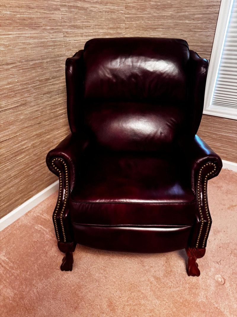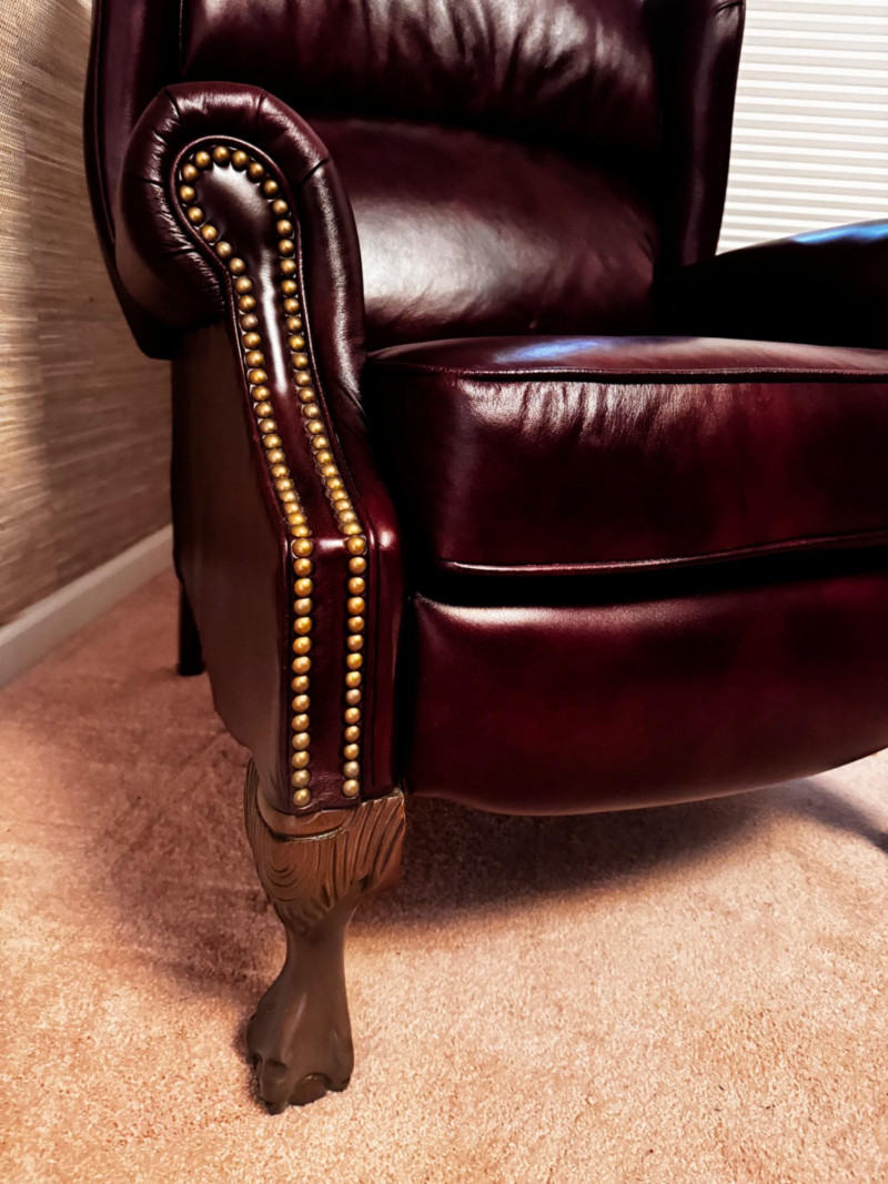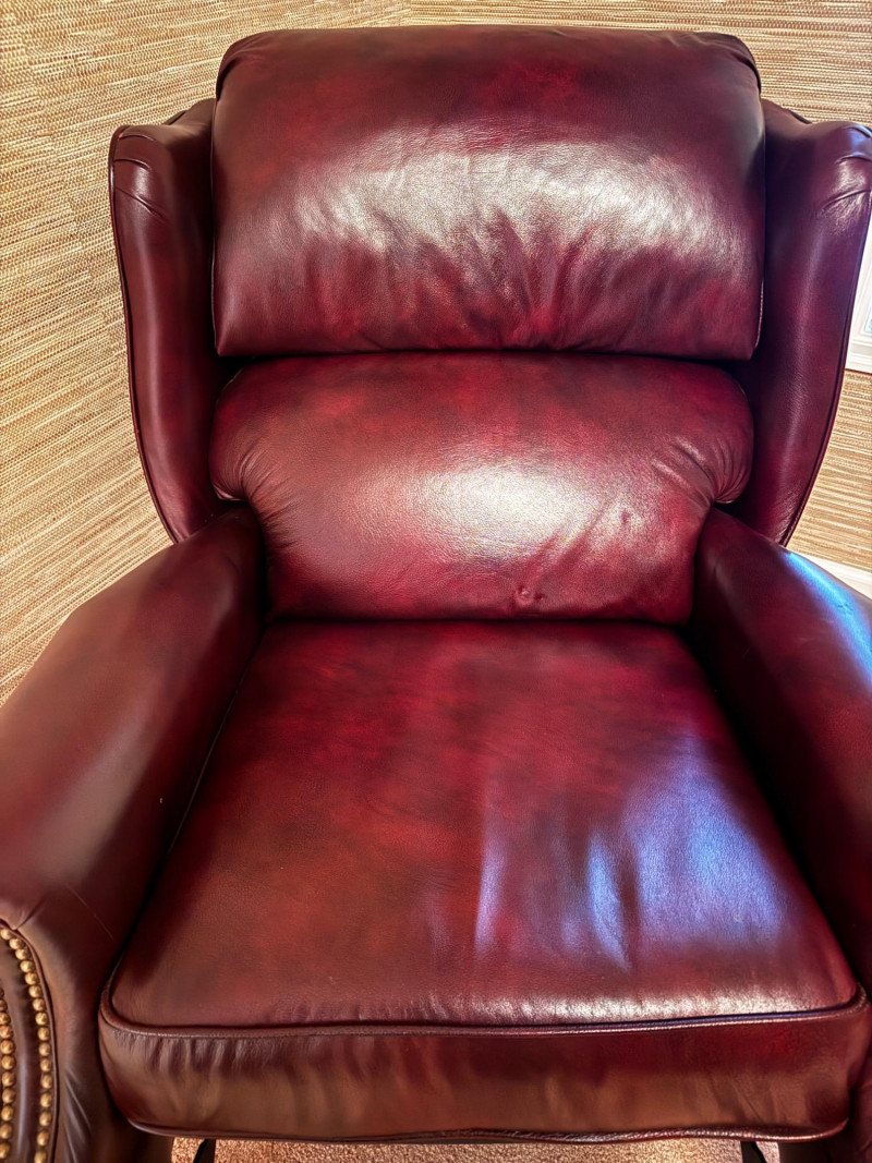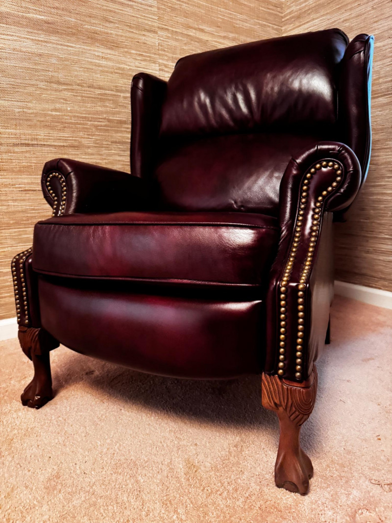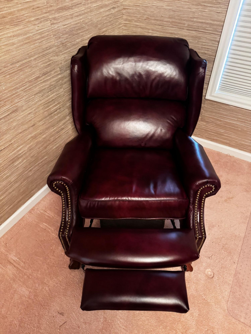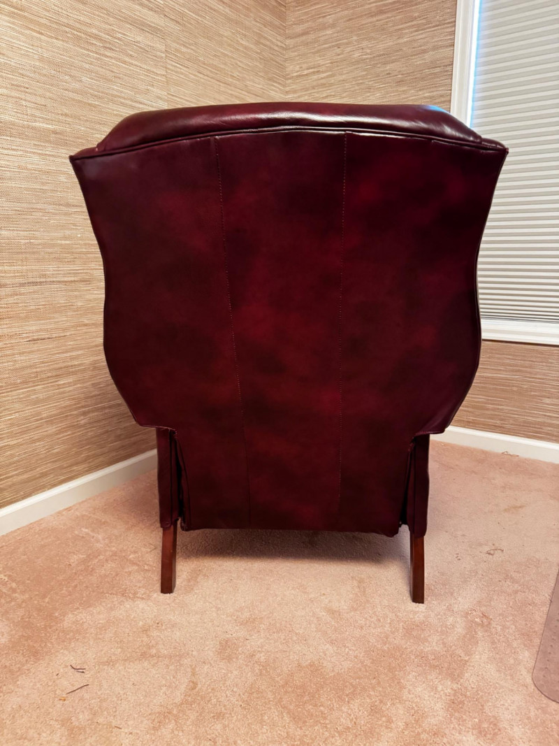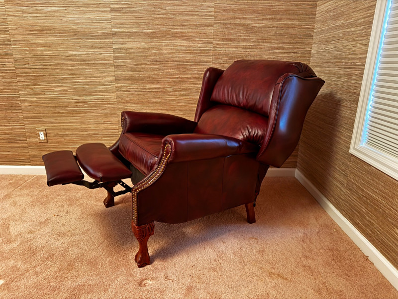 La-Z-Boy Mahogany Leather Wingback Recliner Bidding on this lot is an agreement that: (1.) You will have at least 2 capable, able bodied persons to lift and load at a minimum. (2.) You will bring a hand truck and/or any other tools needed to remove this item. If these steps are not followed your item will be forfeit and no refund given.