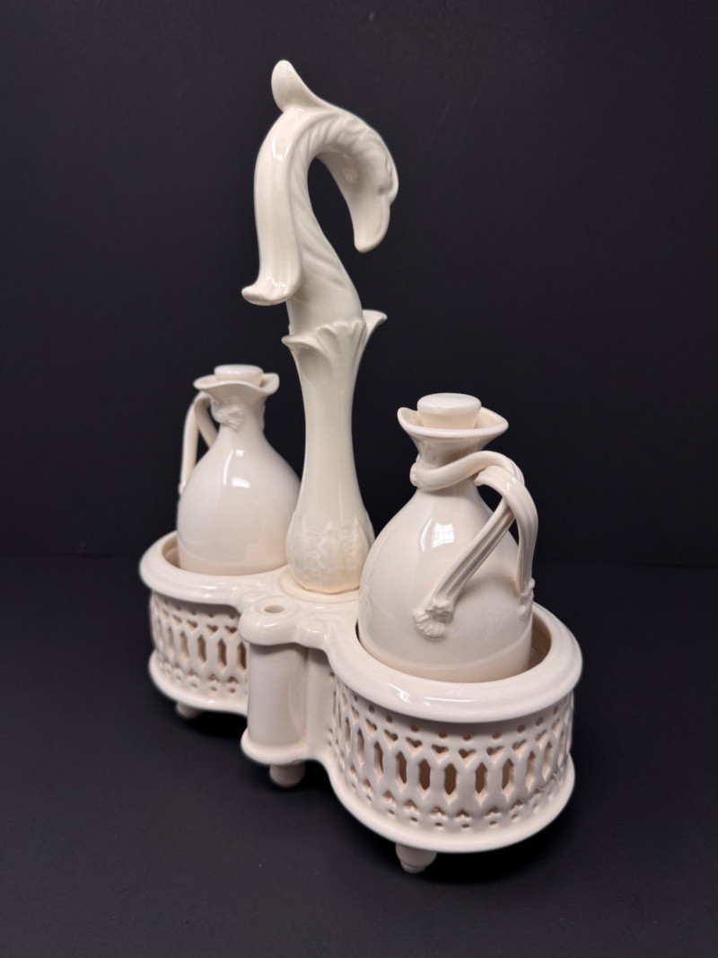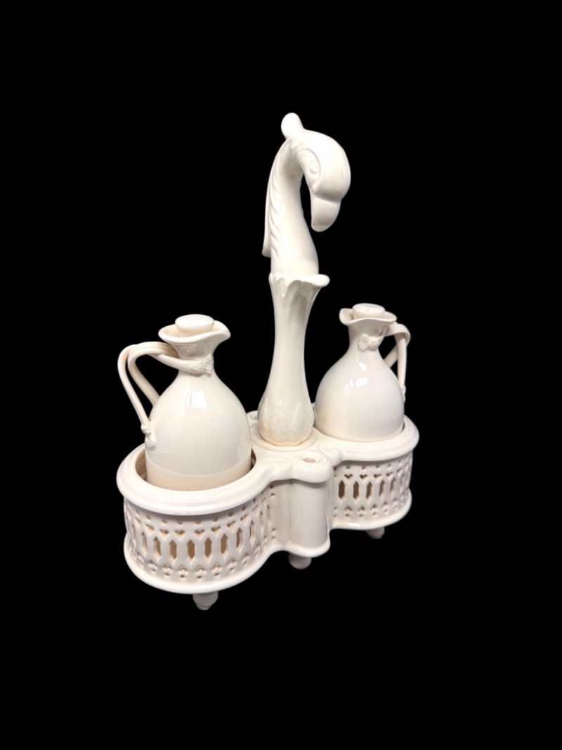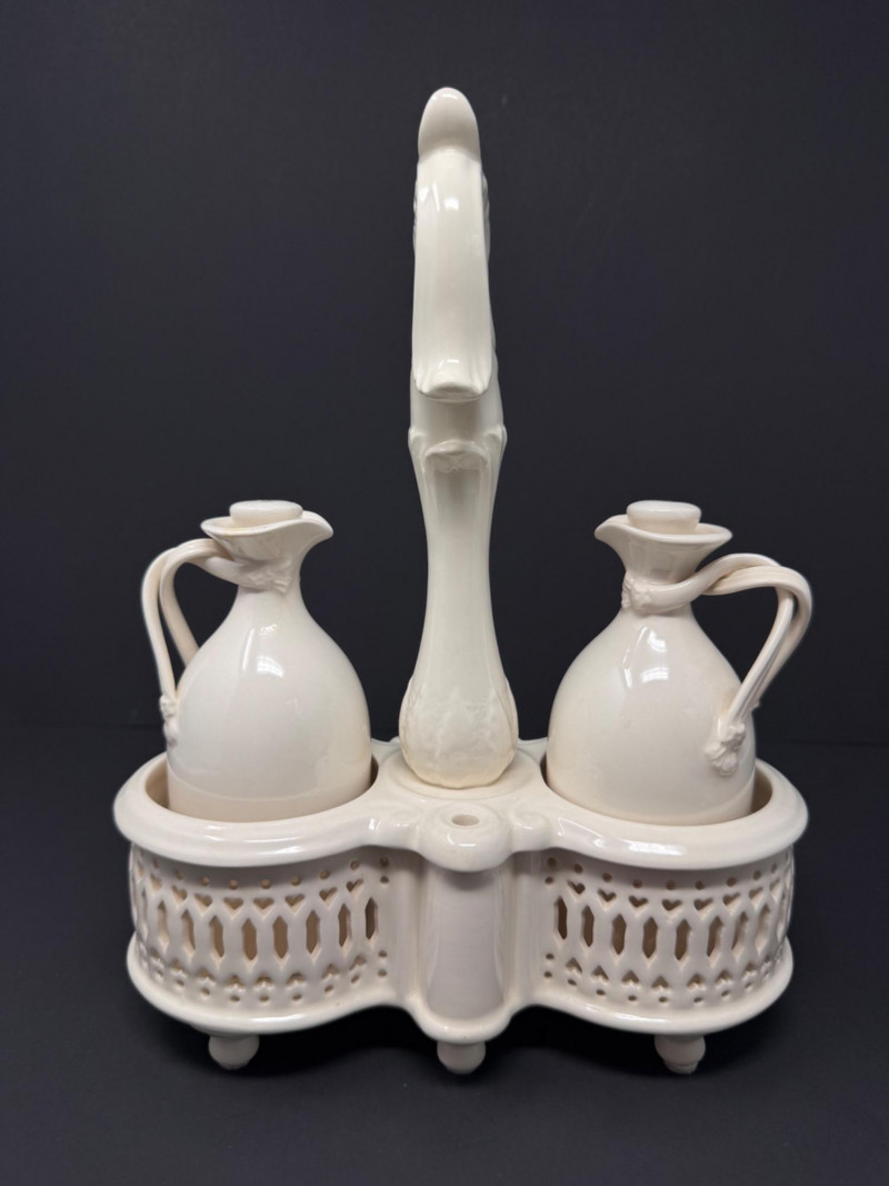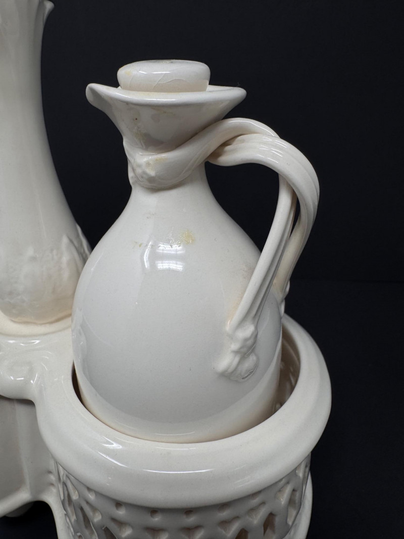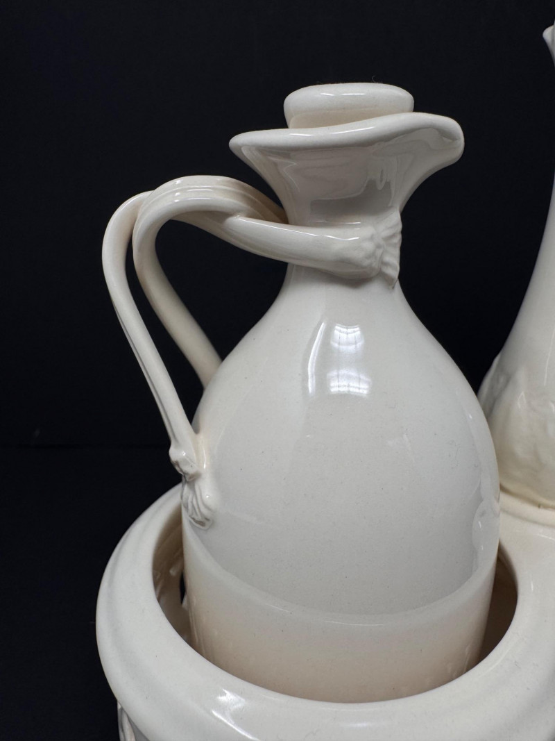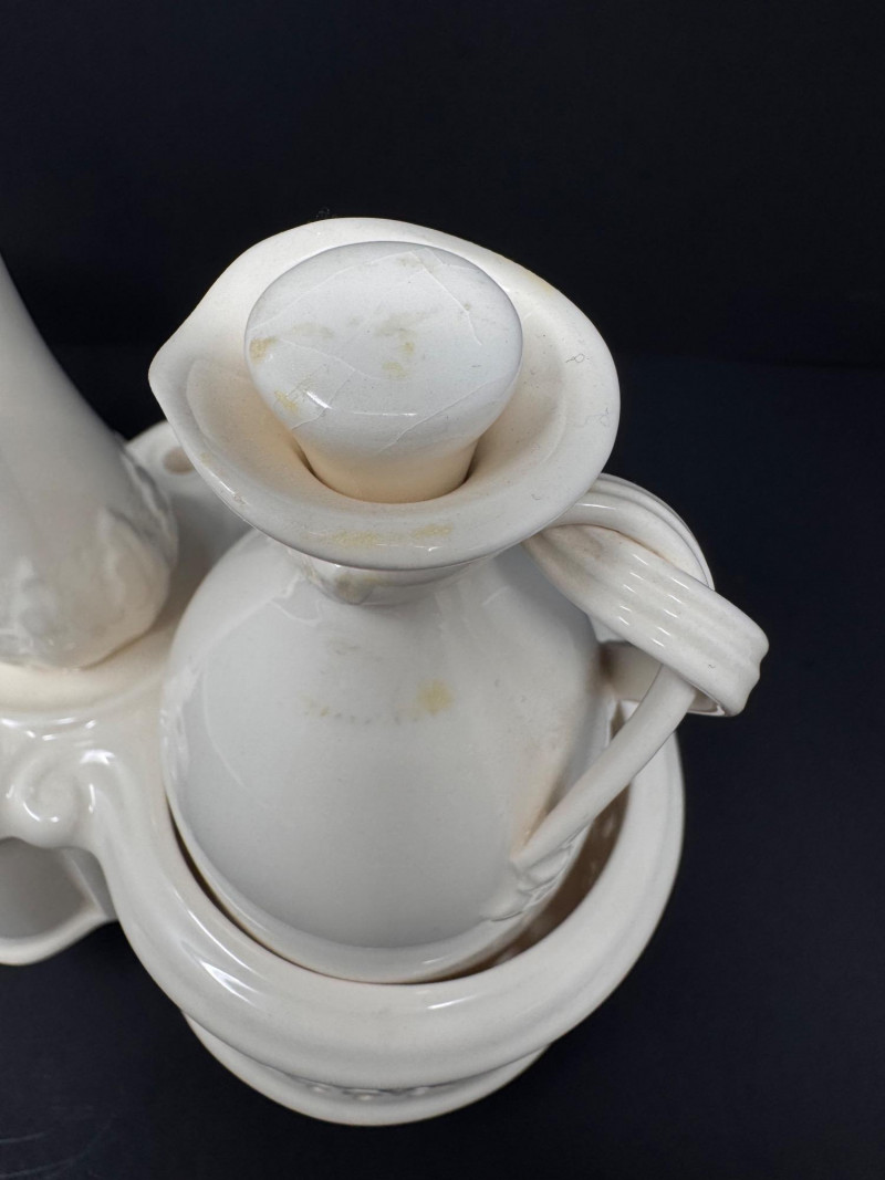 Vintage Leeds Pottery Creamware Oil & Vinegar Set w/ Stand – 3 Pieces,