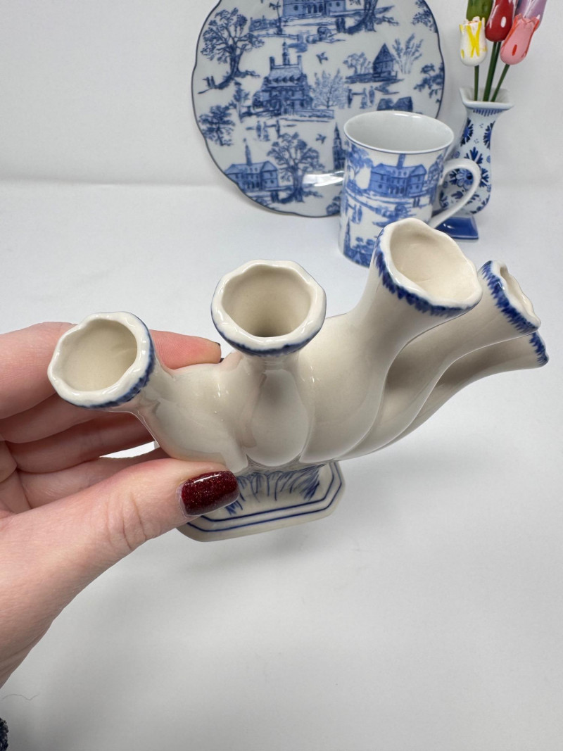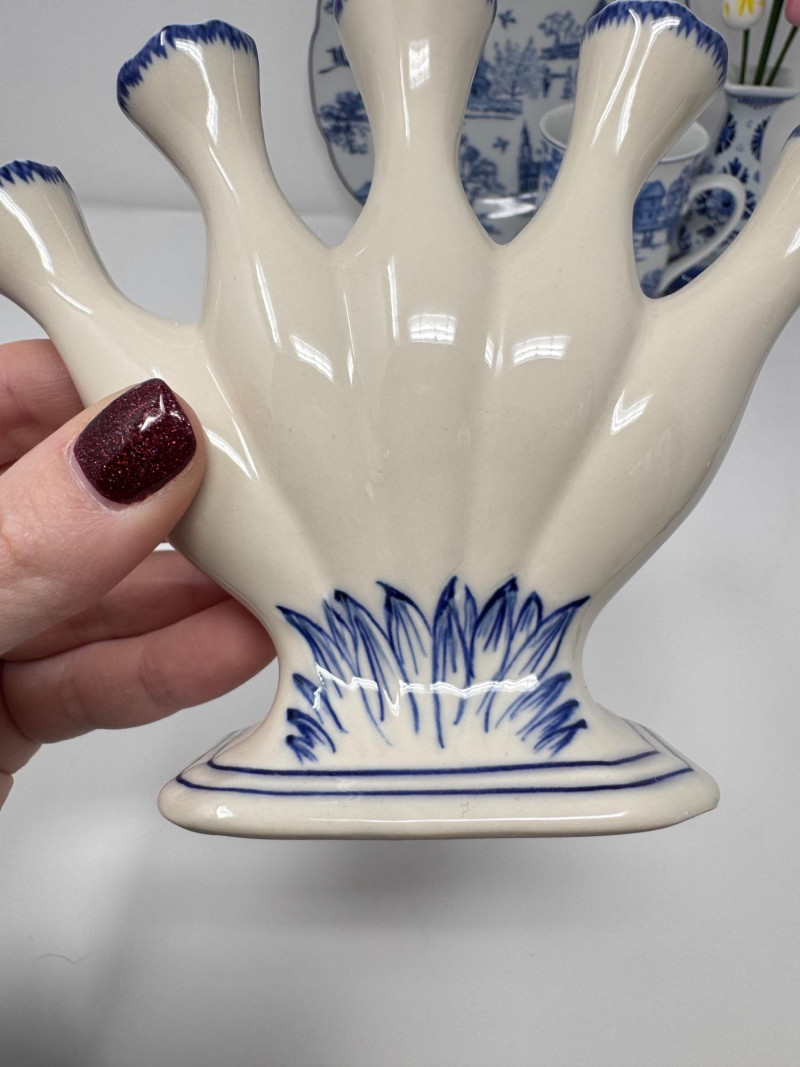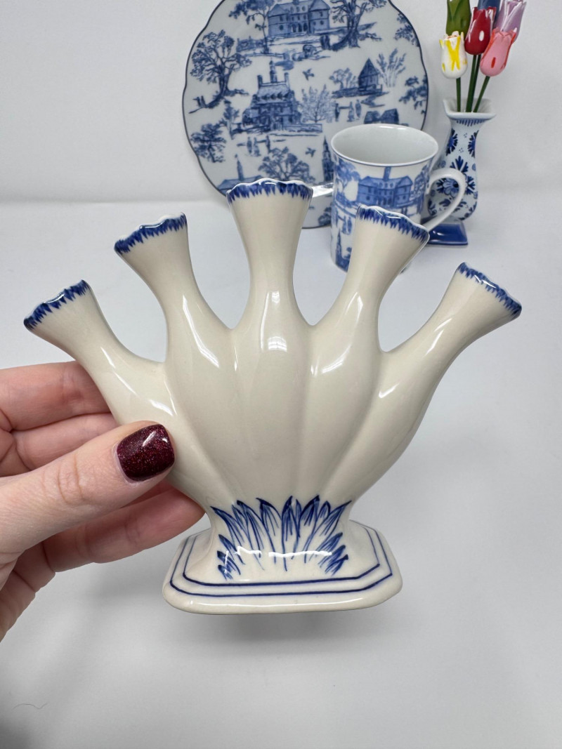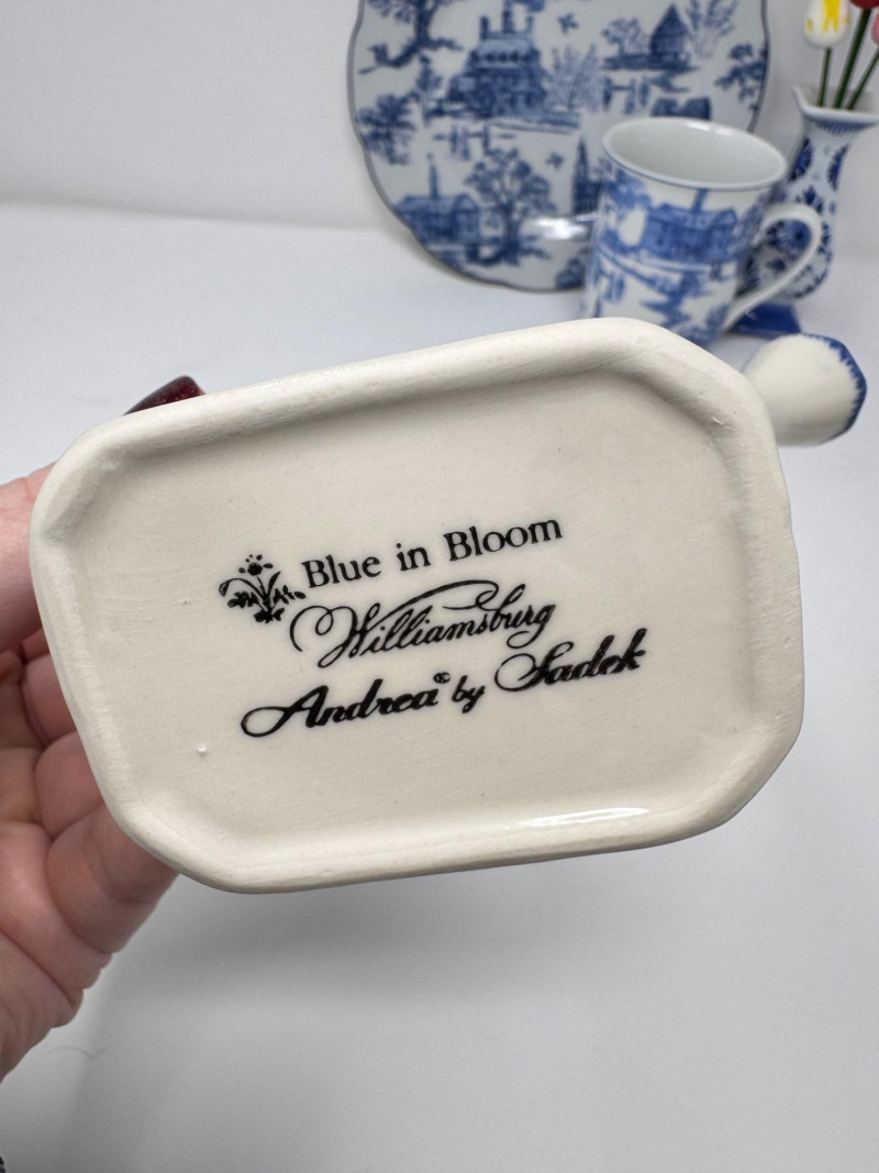 Royal Delft Bud Vase, Andrea by Sadek Blue Multi-Stem Vase, & More. Approx. 4.5" tall (about 7.5" with wooden tulips) Ceramic multi-stem vase marked Andrea by Sadek – Blue in Bloom Approx. 5.5" wide and 5" tall Marked Colonial Williamsburg – Williamsburg Townscape Toile Marked Colonial Williamsburg – Townscape ToileRoyal Delft Bud Vase (Koninklijke Porceleyne Fles)