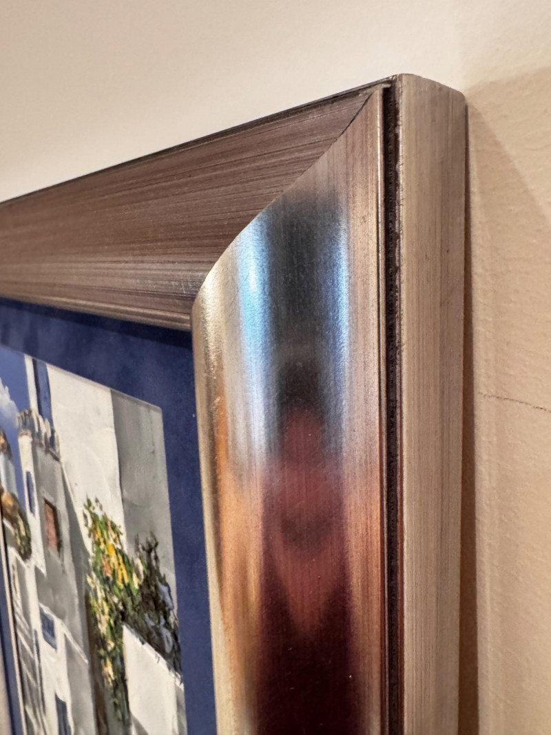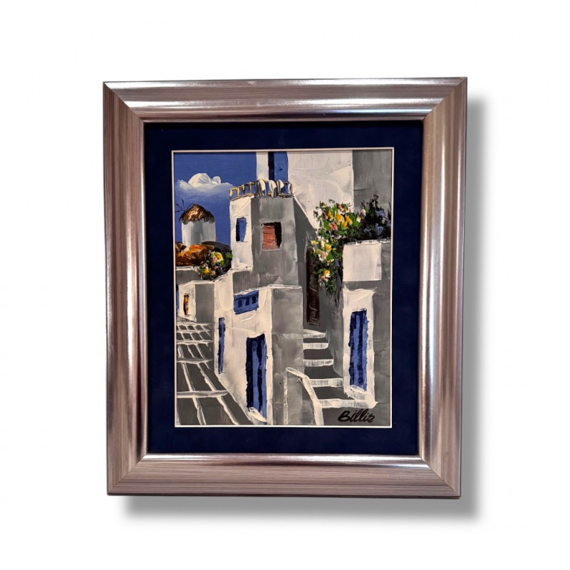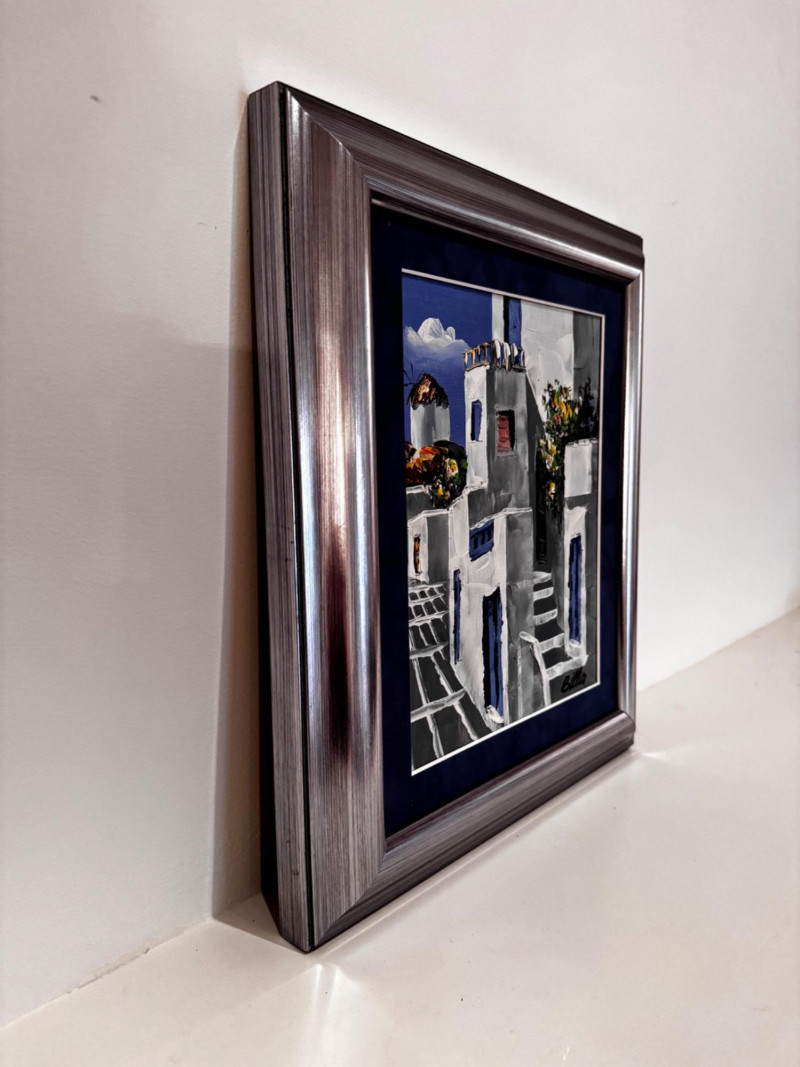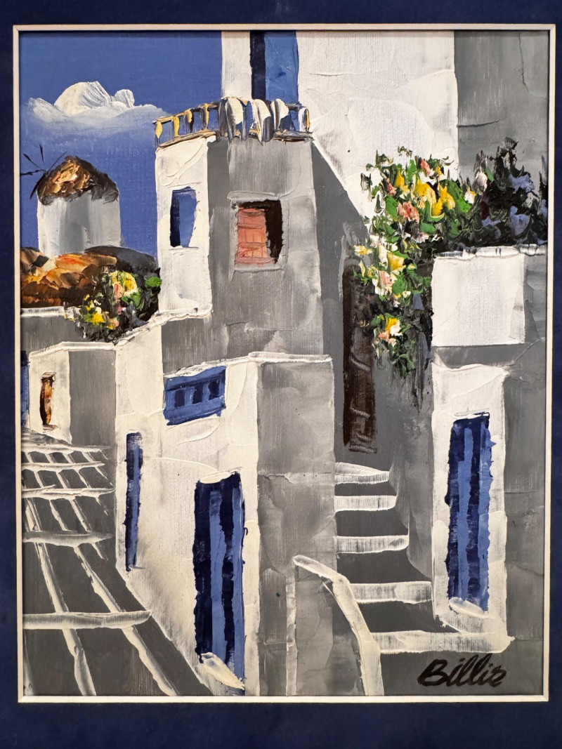 Framed Santorini-Style Mediterranean Street Scene Signed Billis.