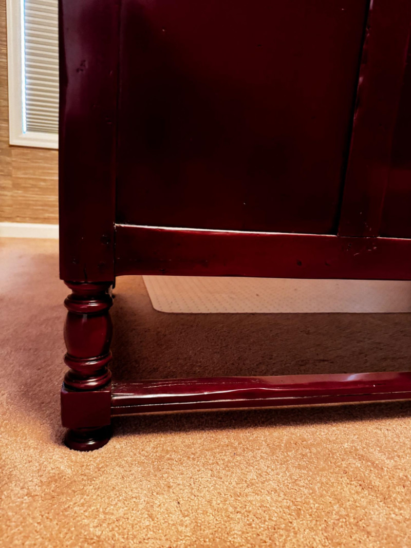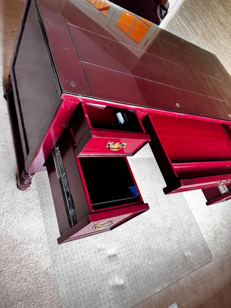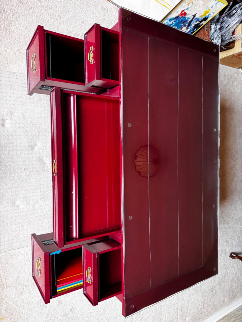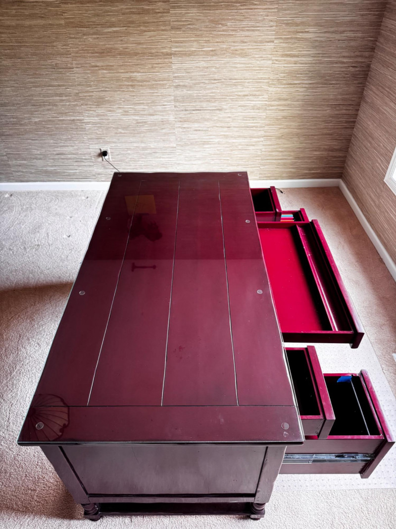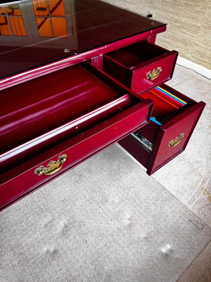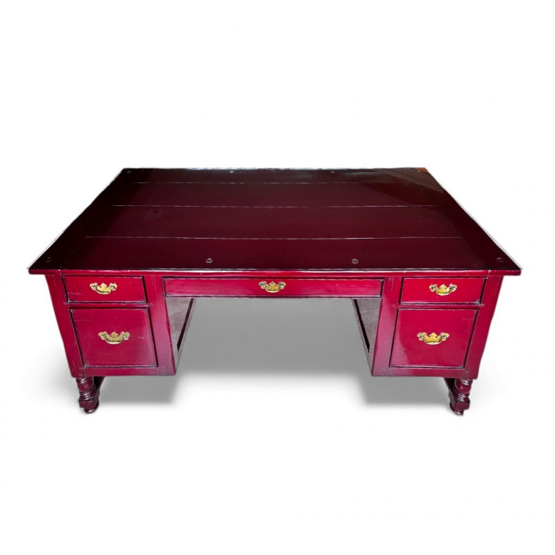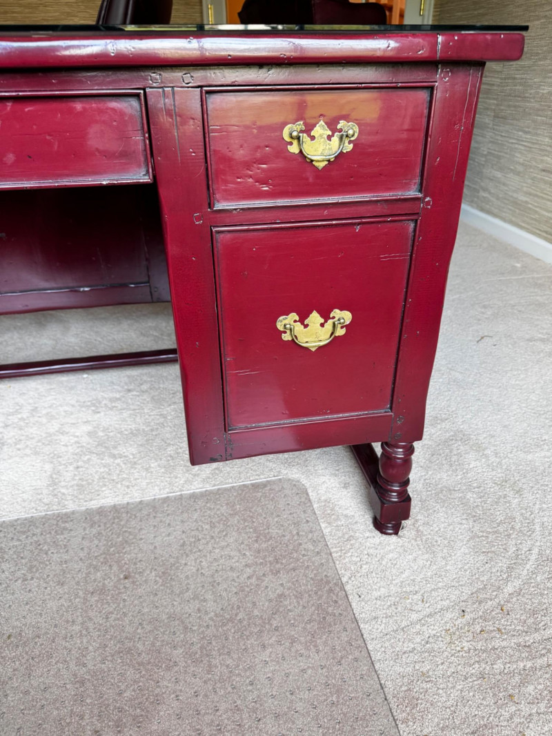 Deep Red Lacquered Wood Office Desk w/ Brass Pulls.