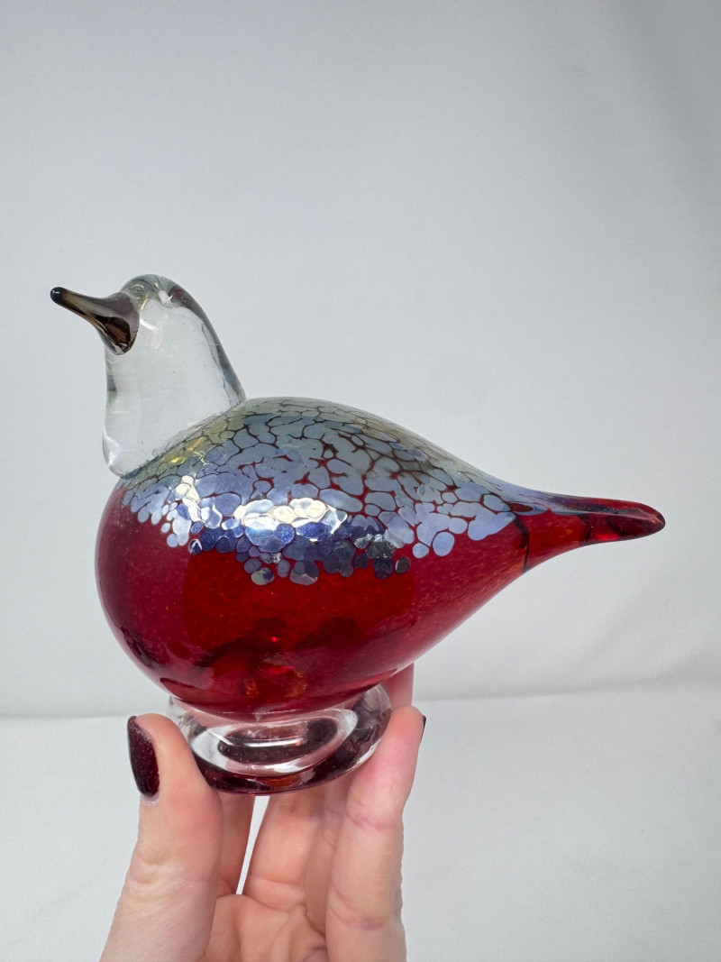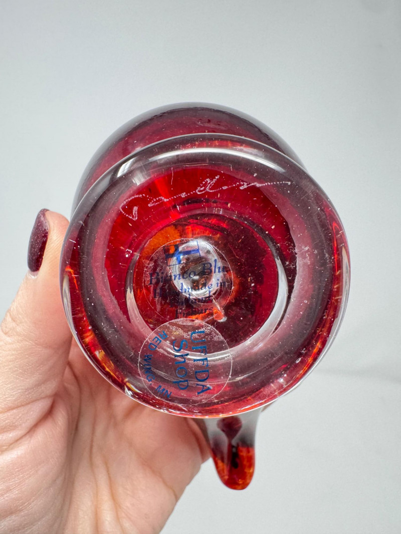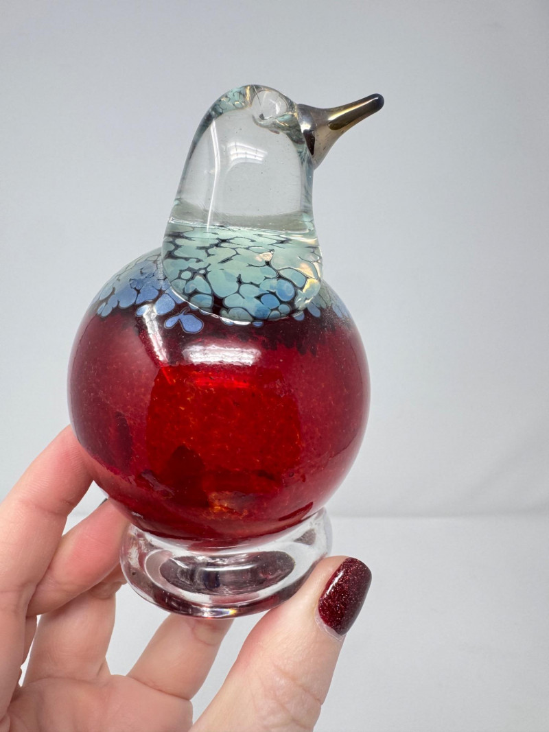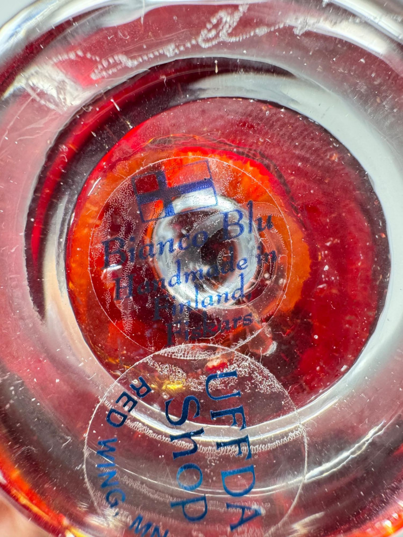 Bianco Blu Finland Glass Bird & Grant Randolph Signed Apple. Two-piece art glass set including one Finnish bird sculpture and one signed apple paperweight. Bianco Blu blown glass bird, handmade in Finland Measures 5" wide x 4.25" tall Retains original Bianco Blu label Grant Randolph signed red glass apple Measures 2" tall Signed on base