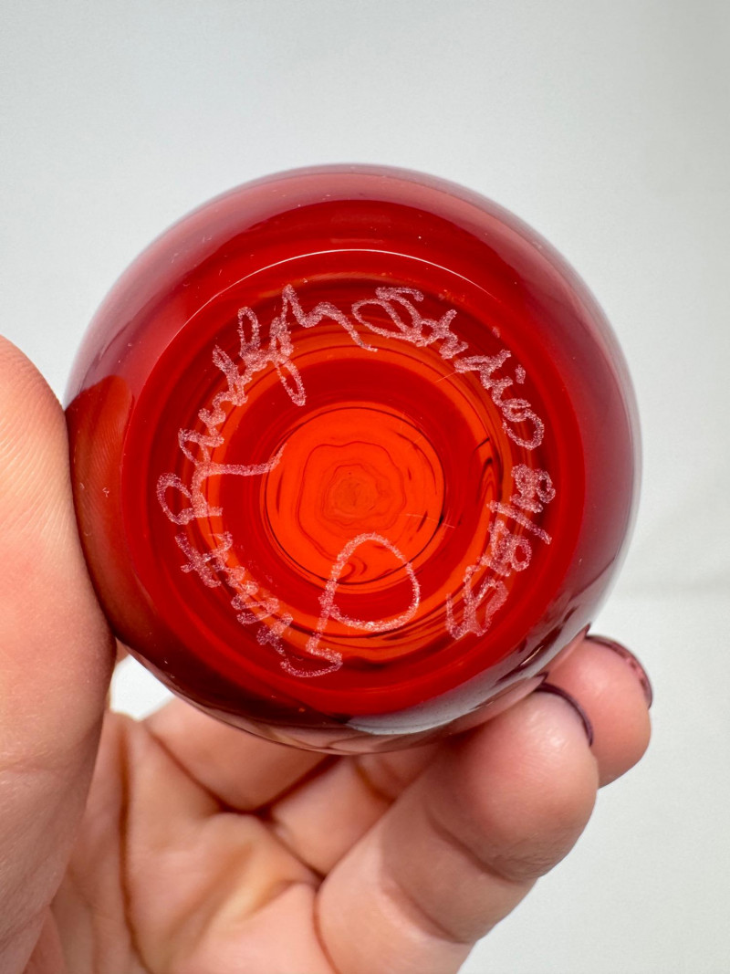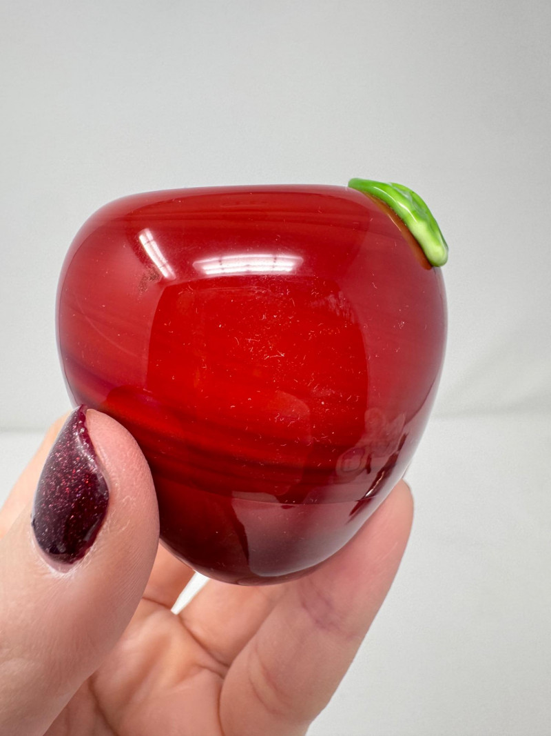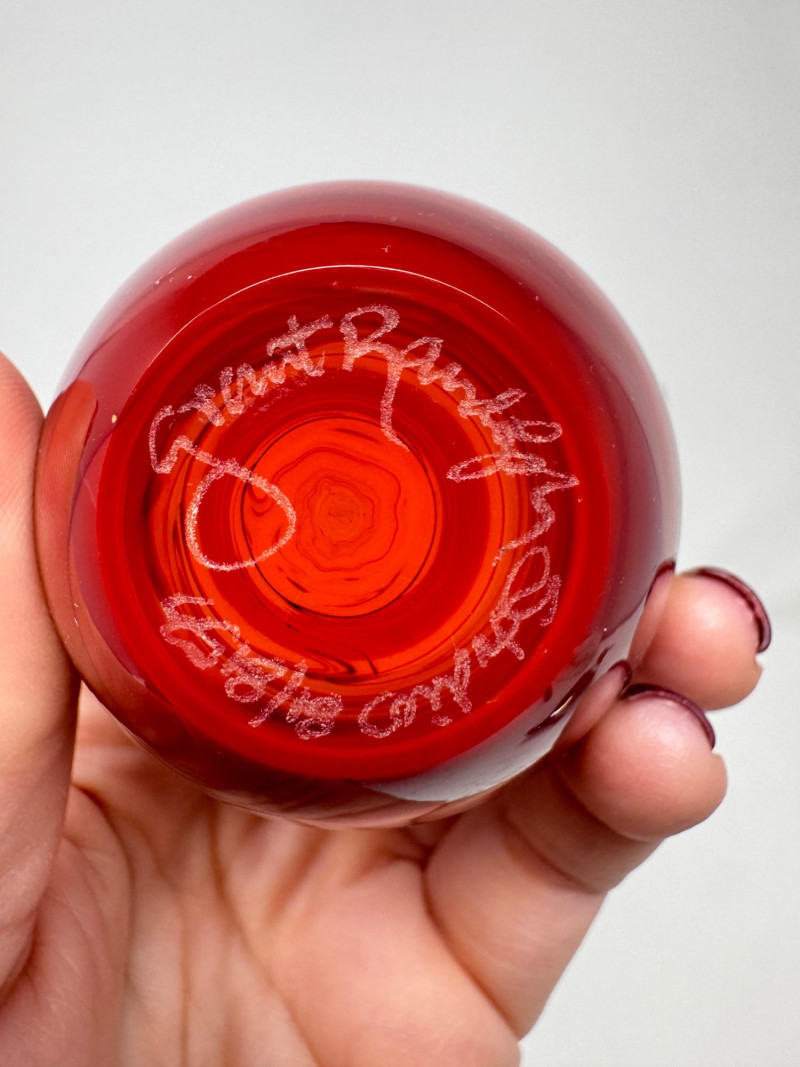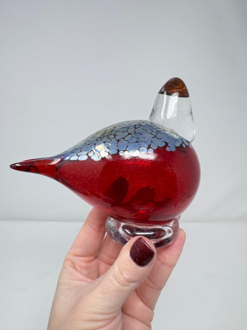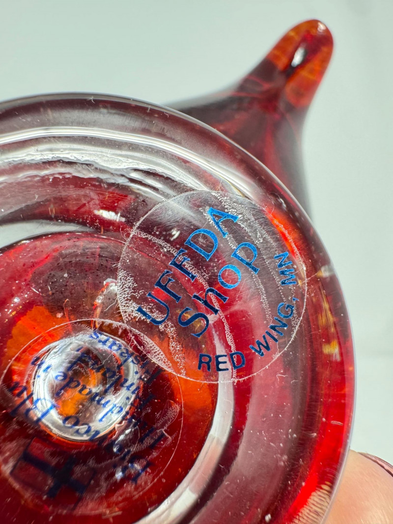 Bianco Blu Finland Glass Bird & Grant Randolph Signed Apple. Two-piece art glass set including one Finnish bird sculpture and one signed apple paperweight. Bianco Blu blown glass bird, handmade in Finland Measures 5" wide x 4.25" tall Retains original Bianco Blu label Grant Randolph signed red glass apple Measures 2" tall Signed on base