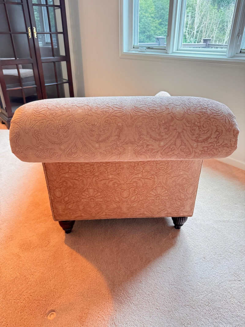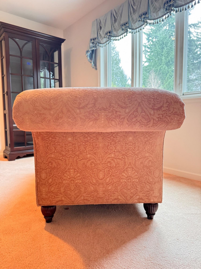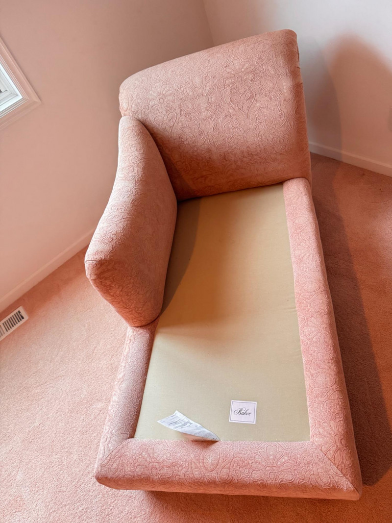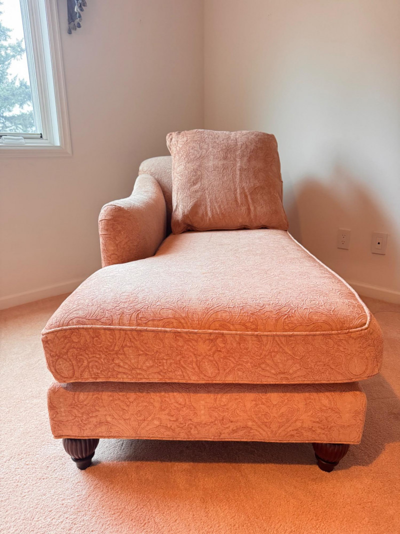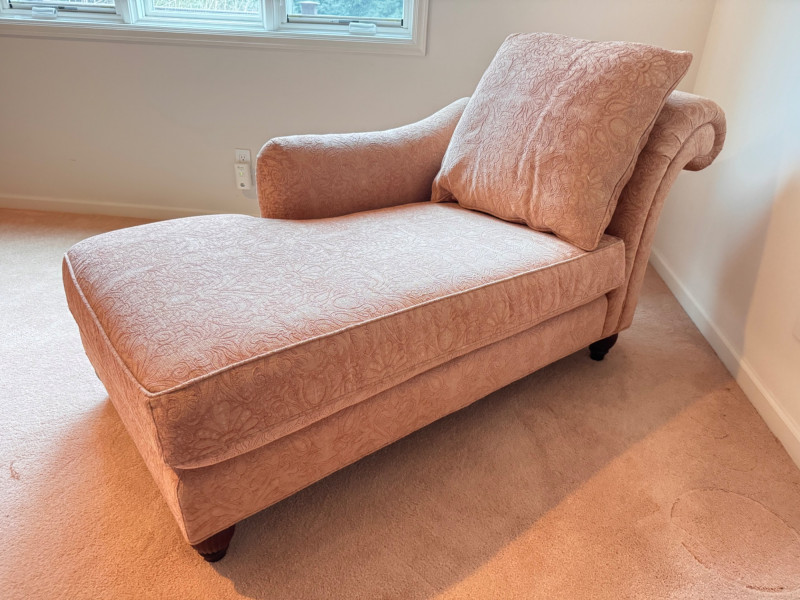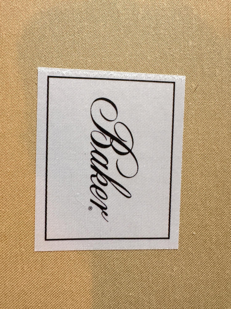 Baker Furniture Upholstered Chaise Lounge Chair. • Carved wood feet with classic Baker styling Bidding on this lot is an agreement that: (1.) You will have at least 2 capable, able bodied persons to lift and load at a minimum. (2.) You will bring a hand truck and/or any other tools needed to remove this item. If these steps are not followed your item will be forfeit and no refund given.