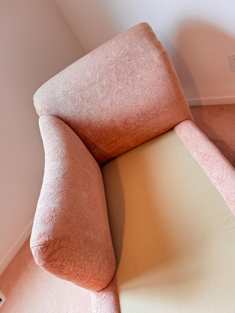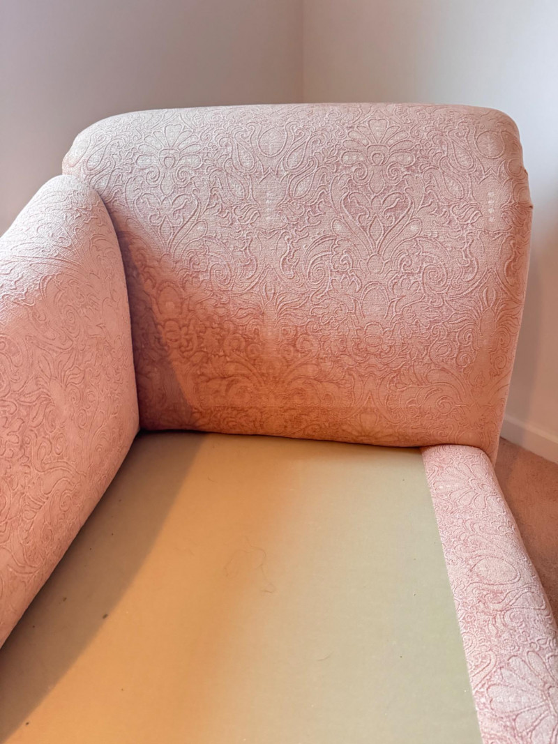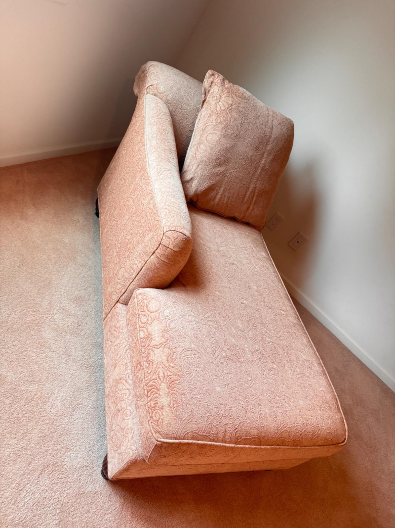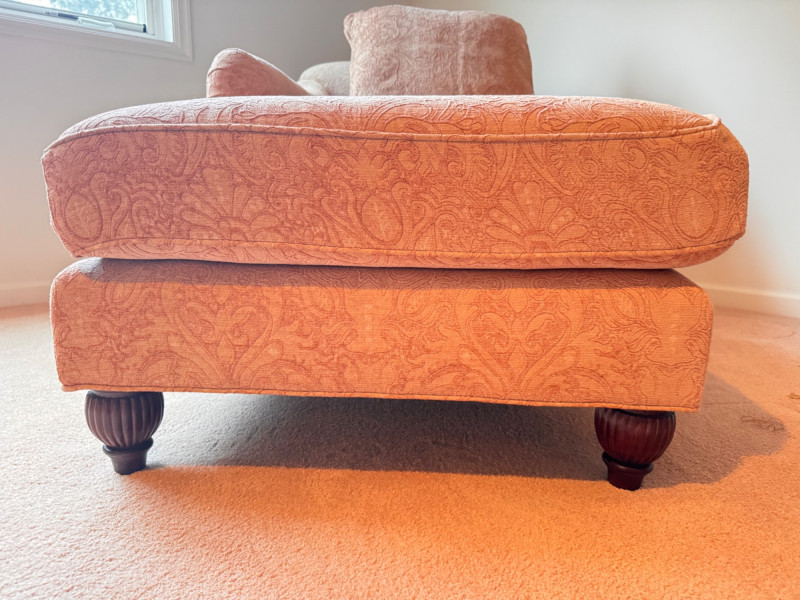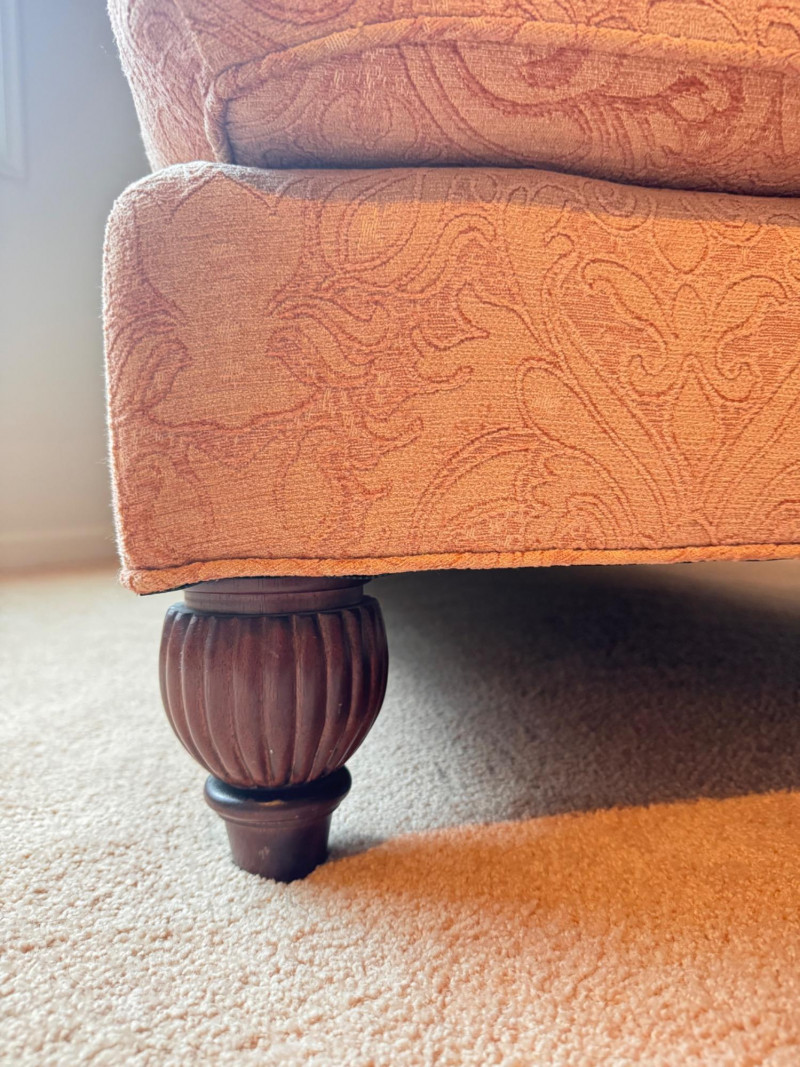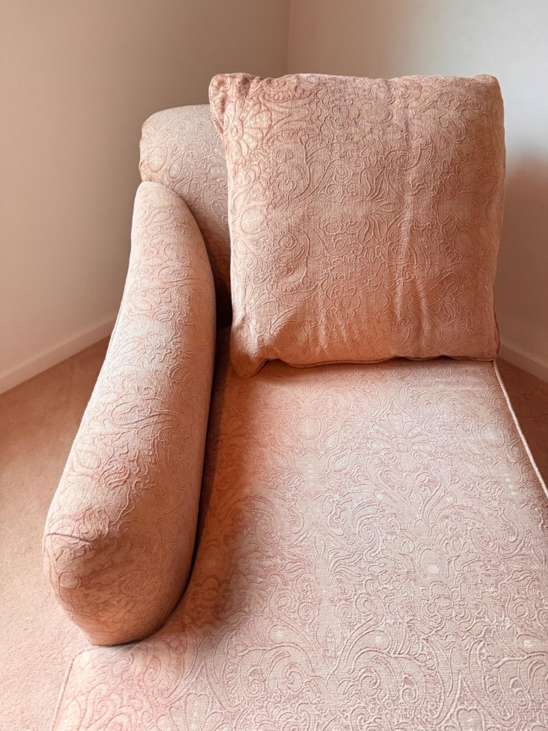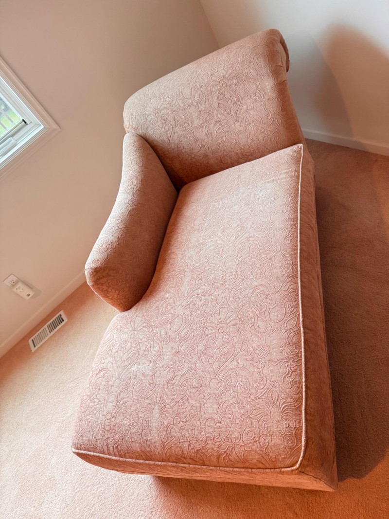 Baker Furniture Upholstered Chaise Lounge Chair. • Carved wood feet with classic Baker styling Bidding on this lot is an agreement that: (1.) You will have at least 2 capable, able bodied persons to lift and load at a minimum. (2.) You will bring a hand truck and/or any other tools needed to remove this item. If these steps are not followed your item will be forfeit and no refund given.