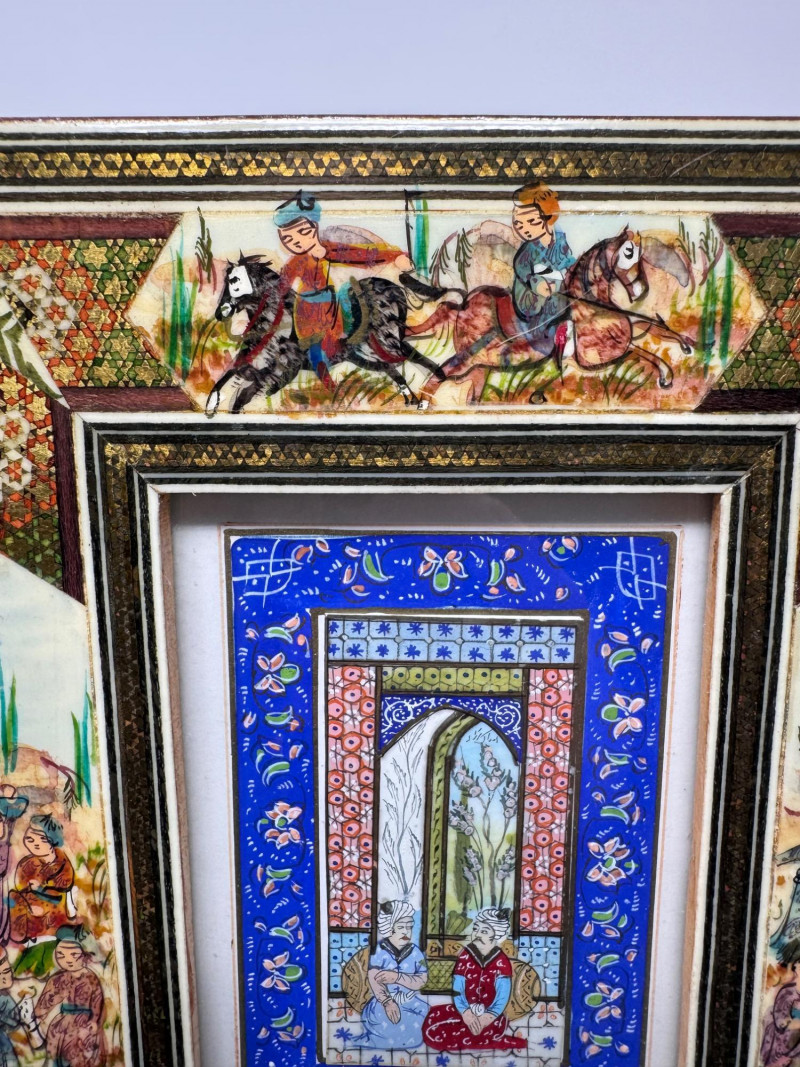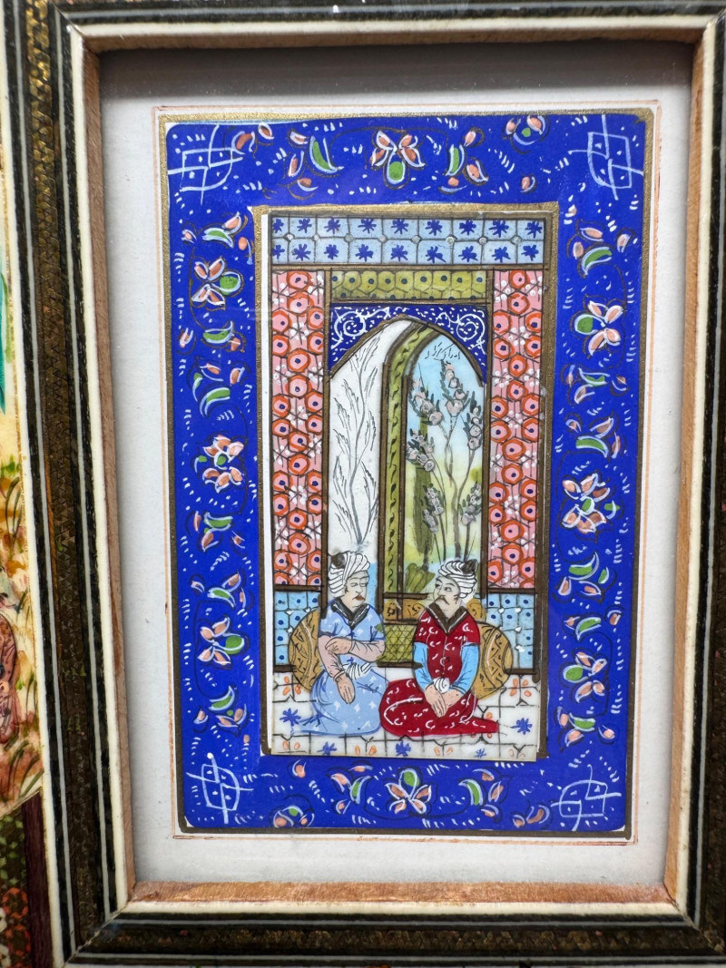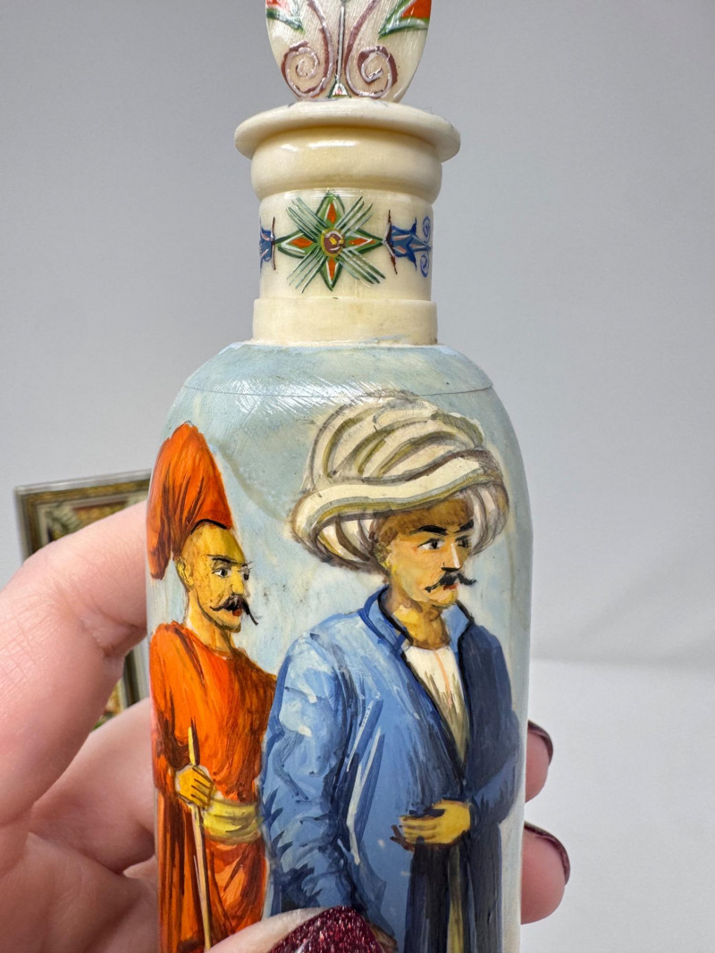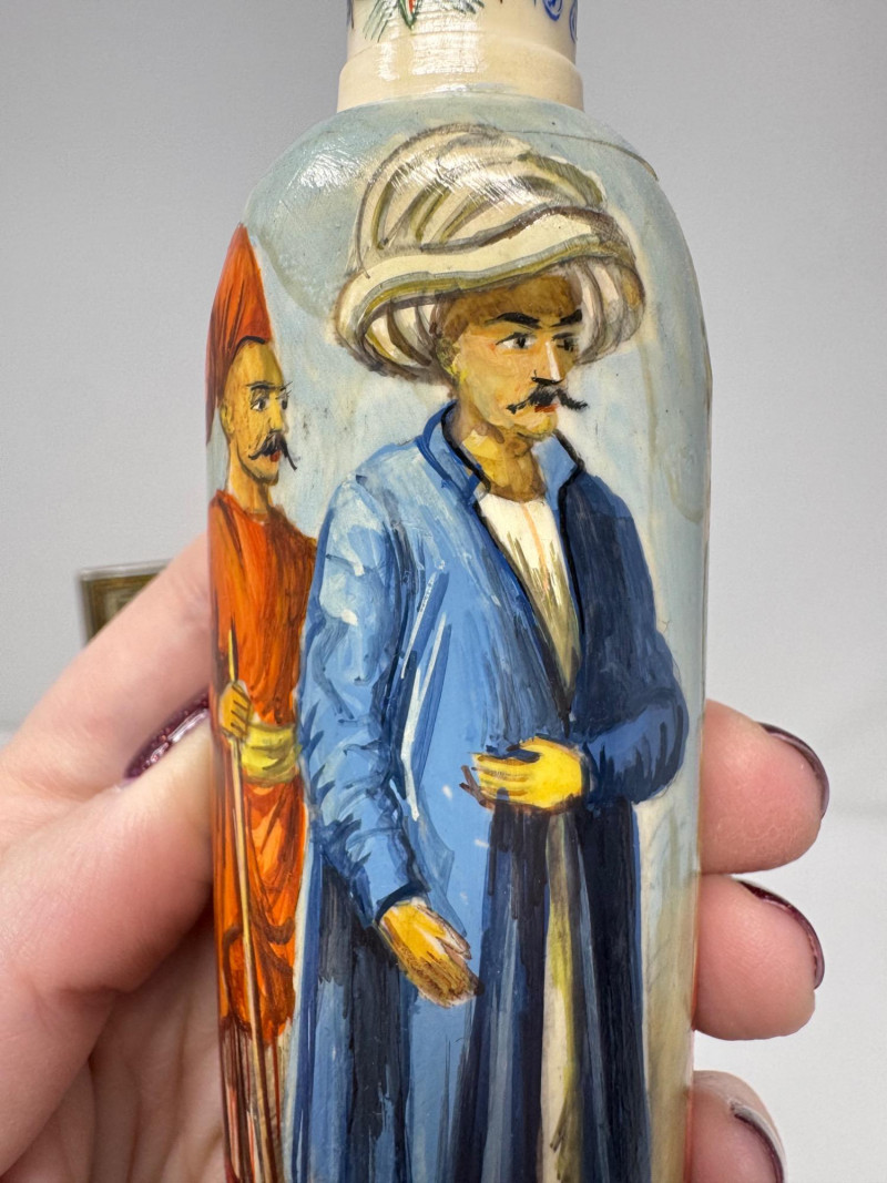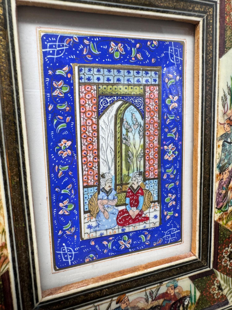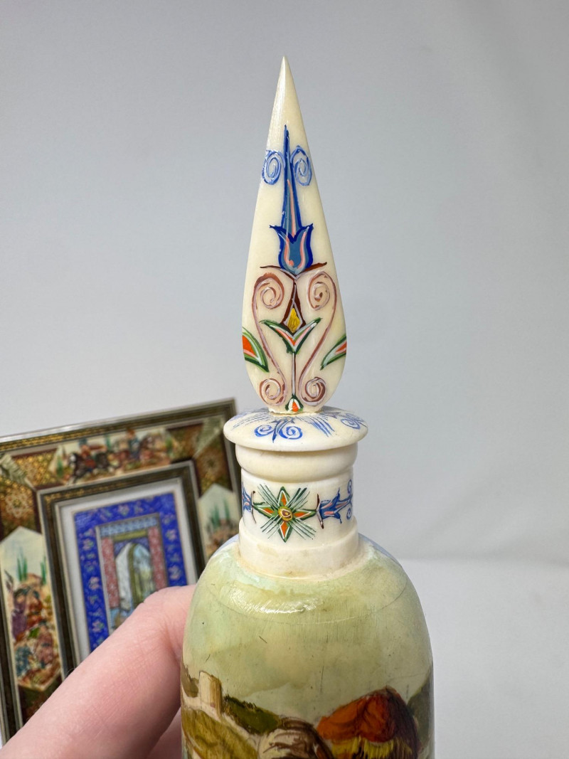 Lot # 117 - Handmade Framed Persian Artwork + 2 Hand-Painted Turkish Bottles