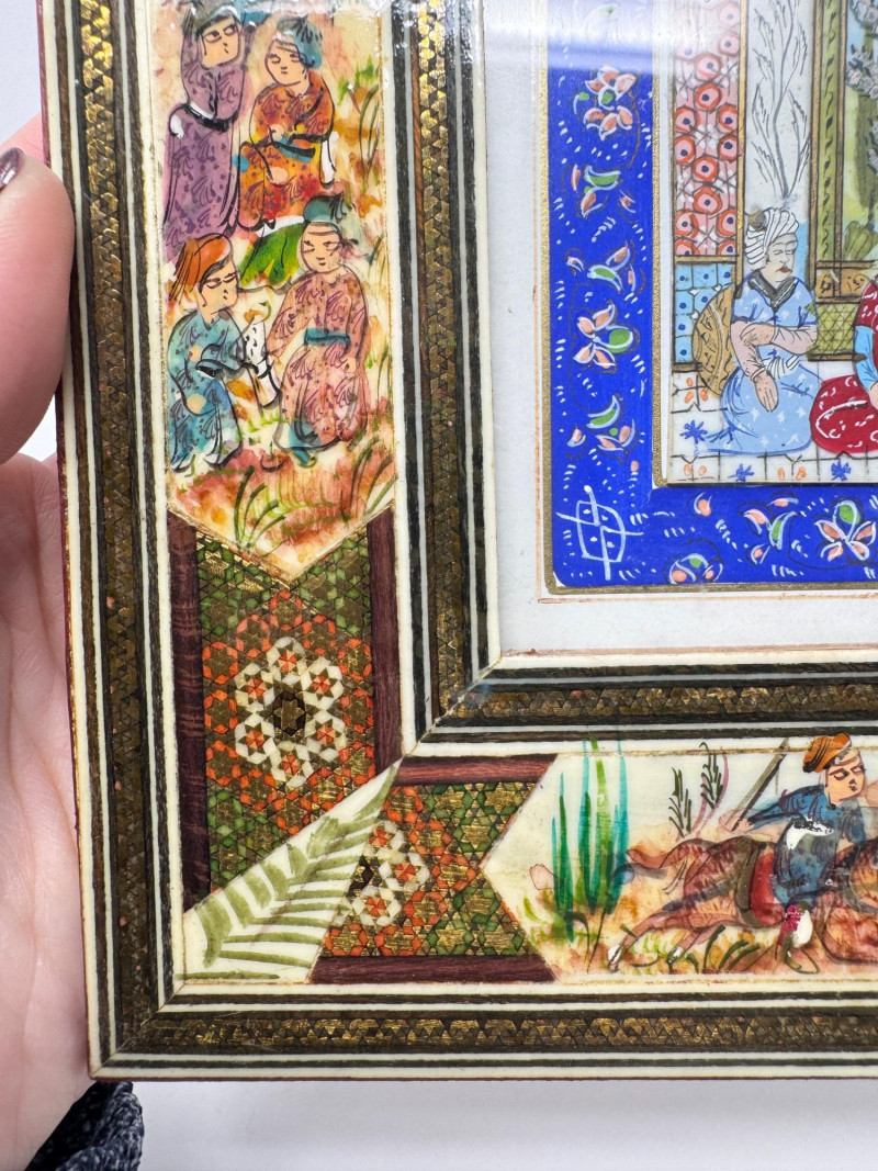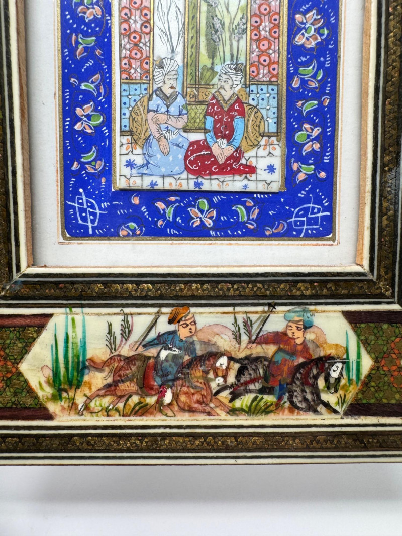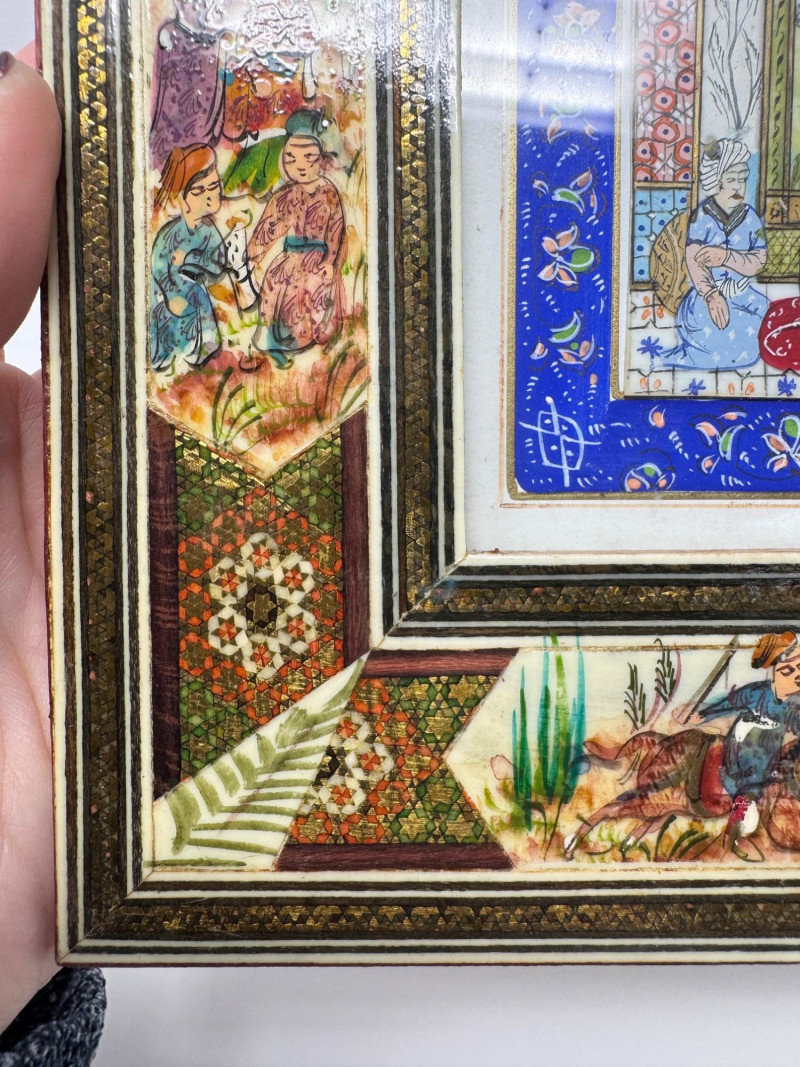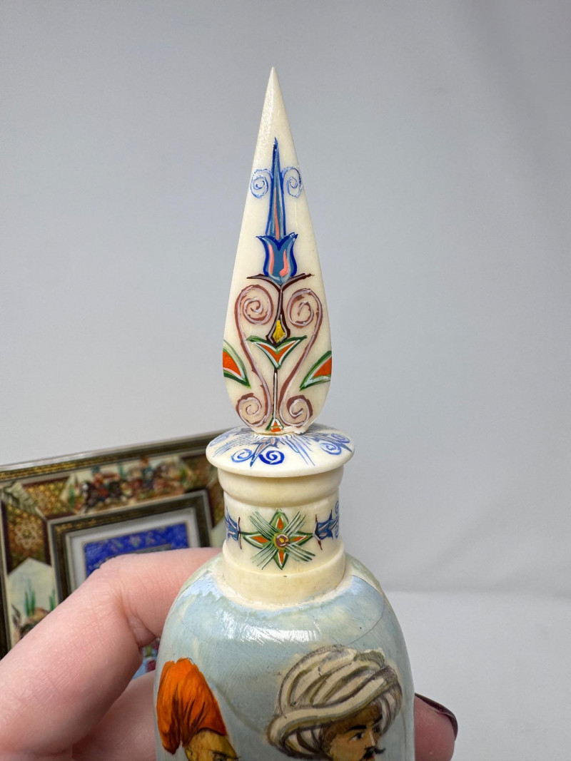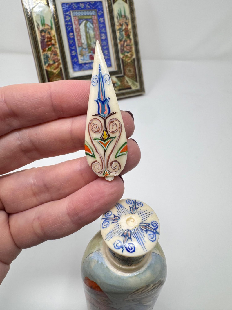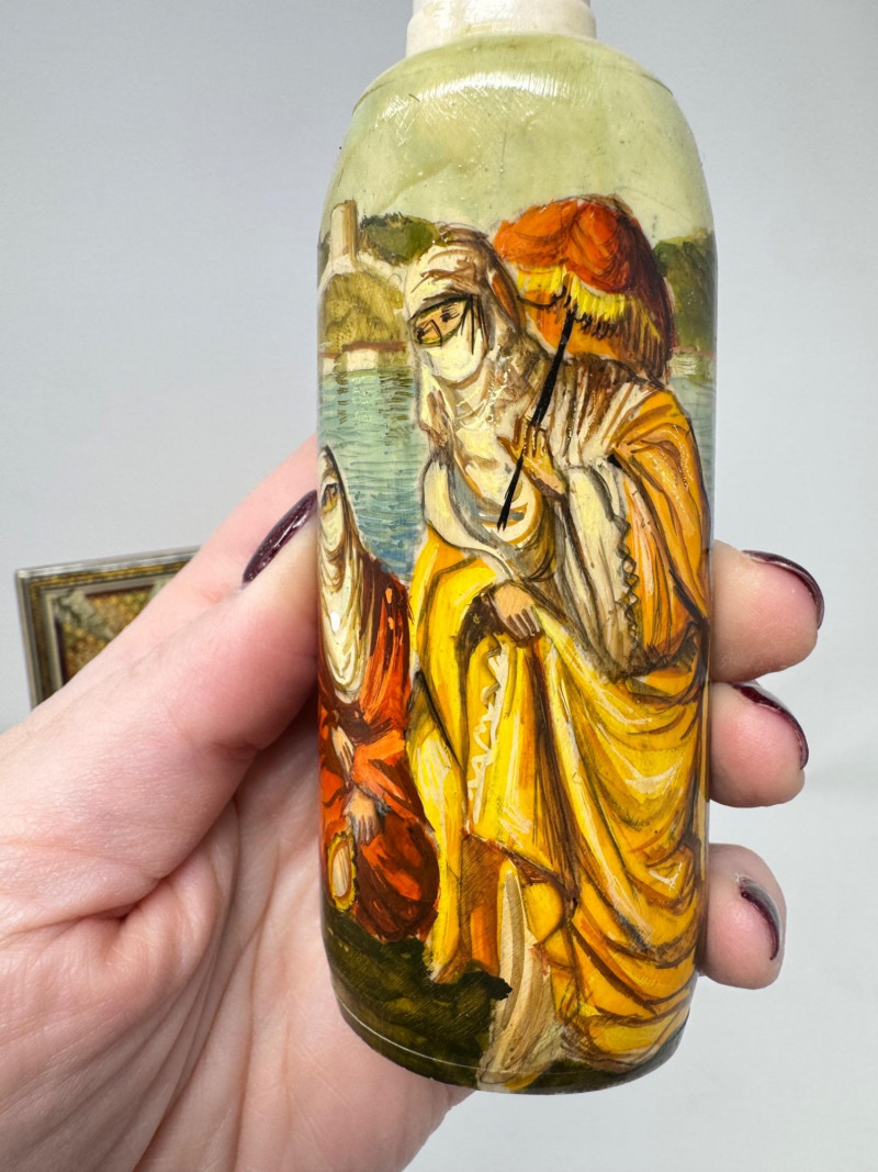 Lot # 117 - Handmade Framed Persian Artwork + 2 Hand-Painted Turkish Bottles