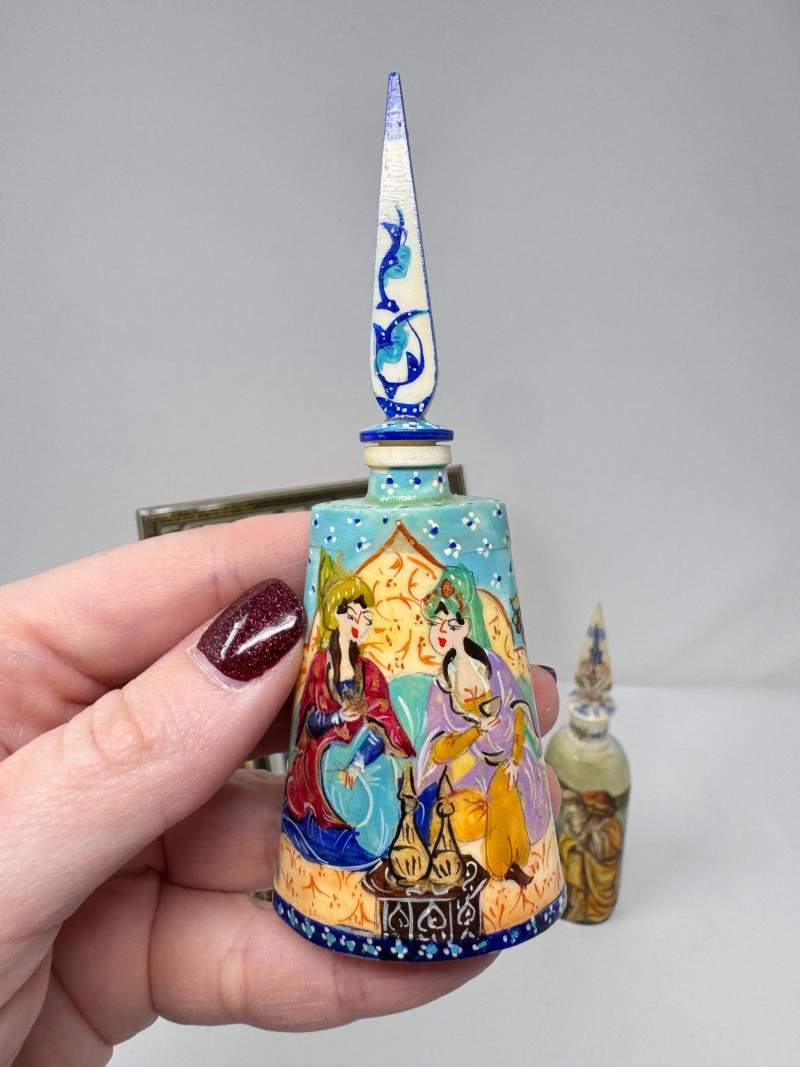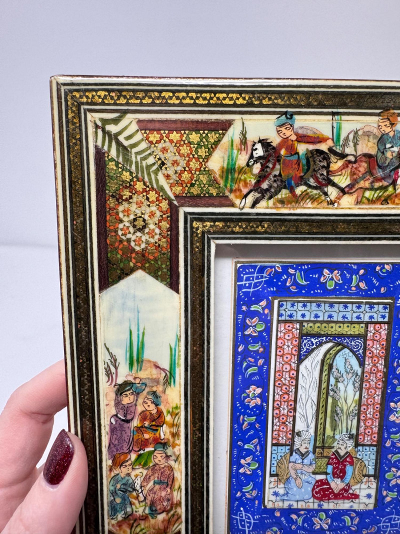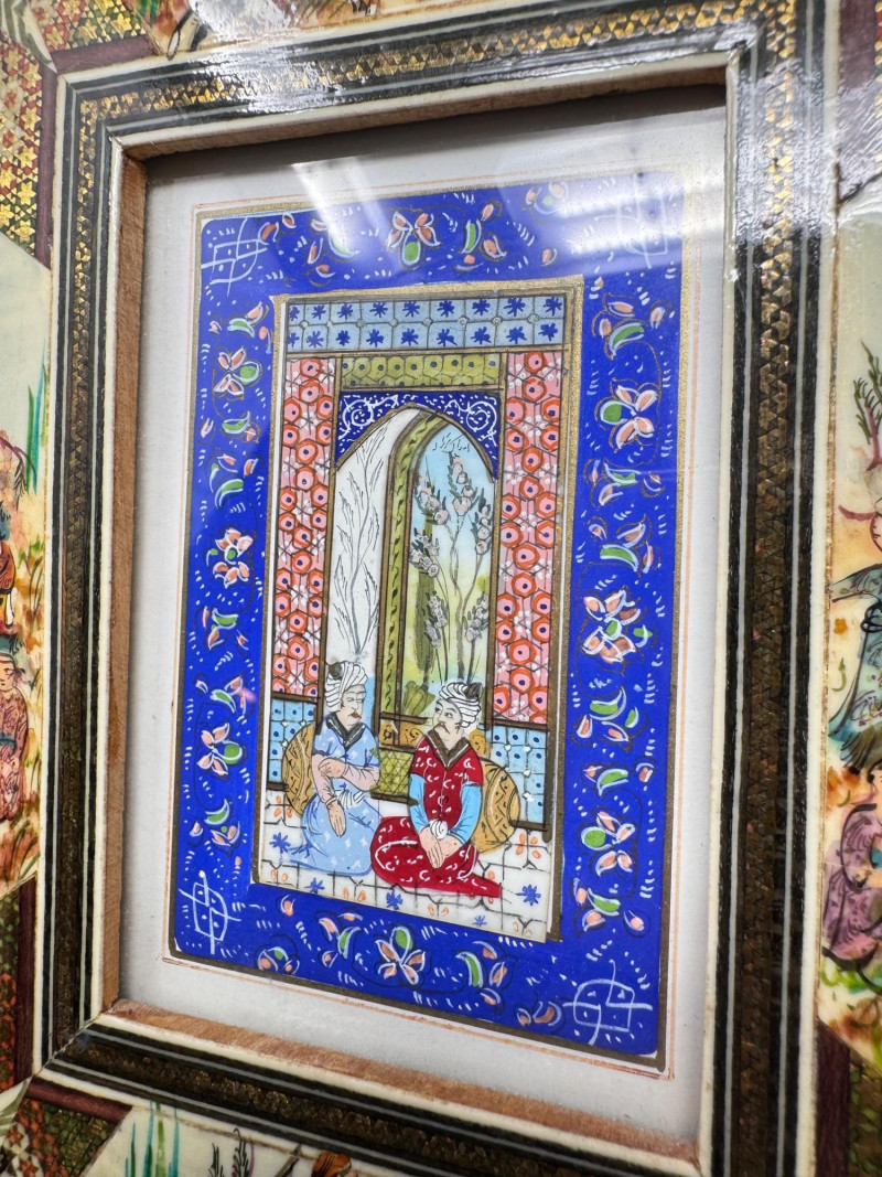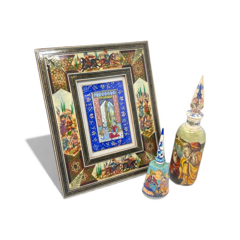 Handmade Framed Persian Artwork + 2 Hand-Painted Turkish Bottles.