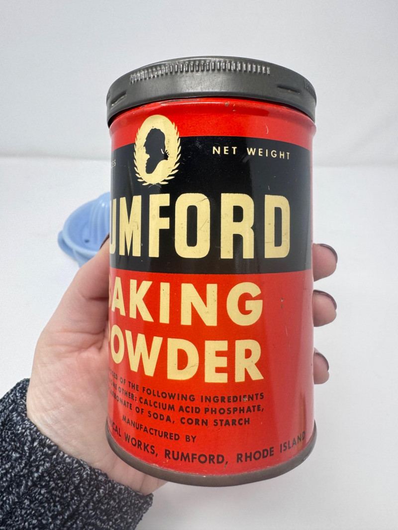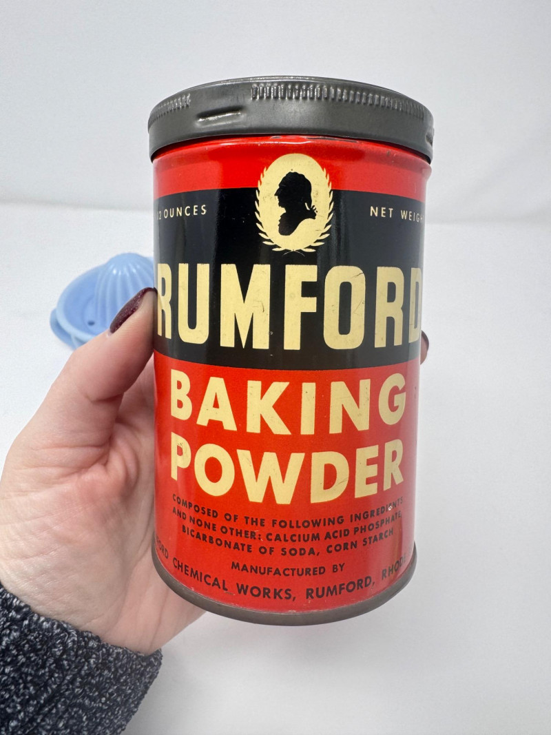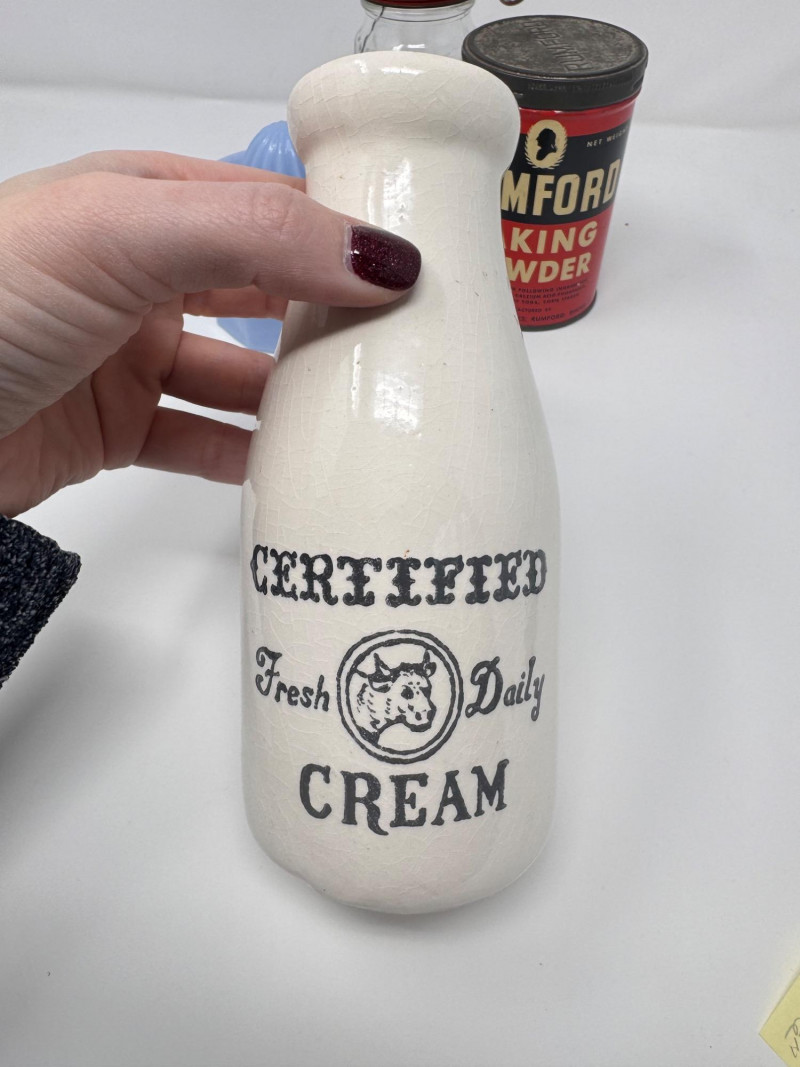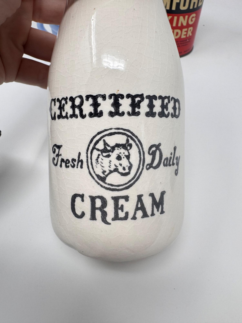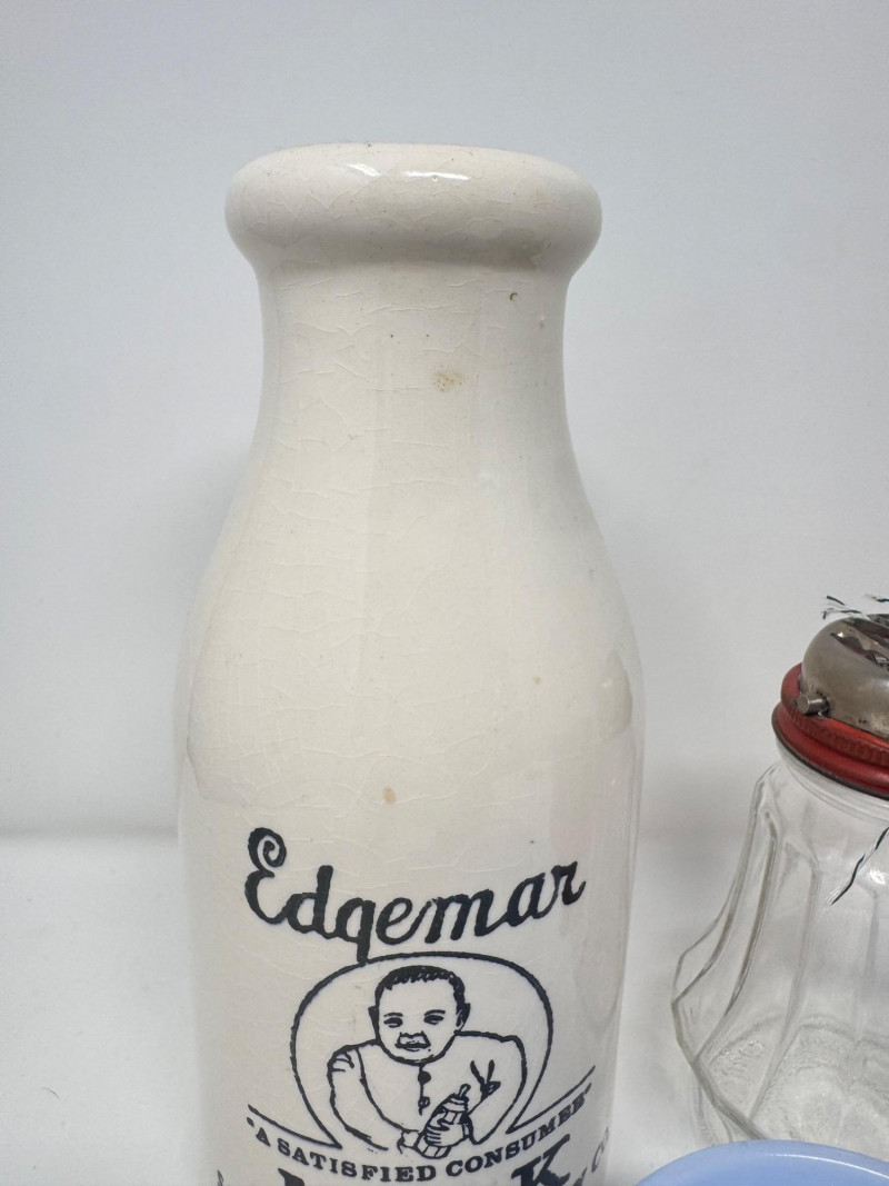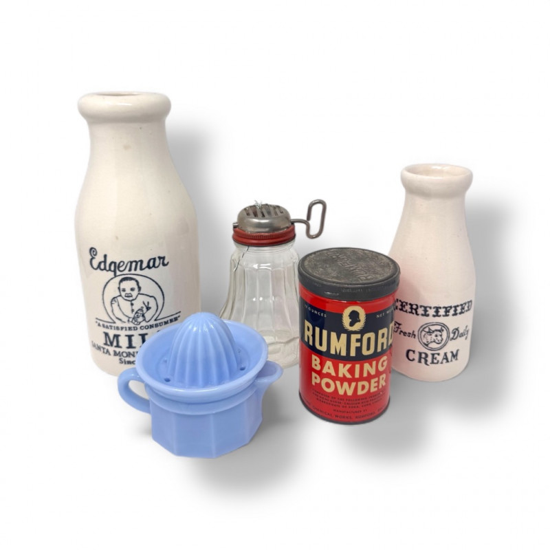 Vintage Delphite Juicer, Milk Bottles, Rumford Tin, & Chopper Grinder.