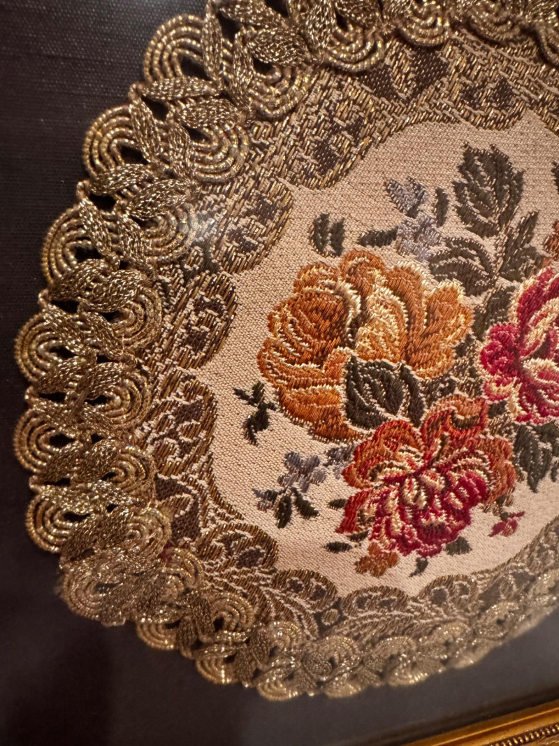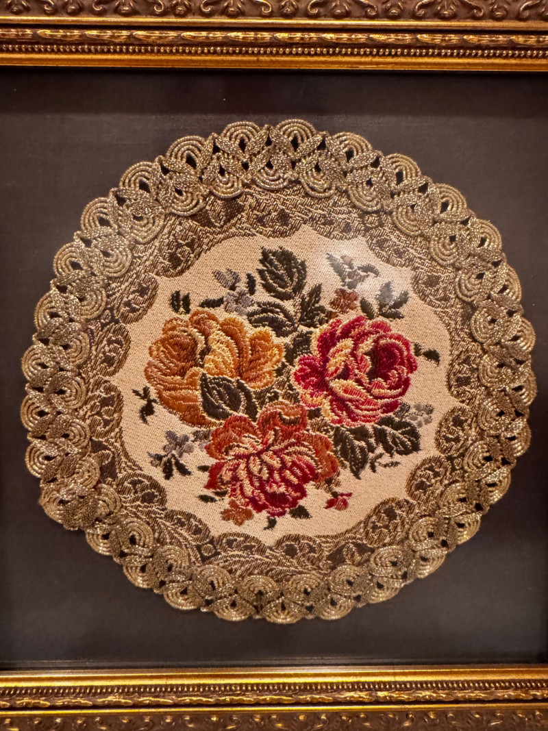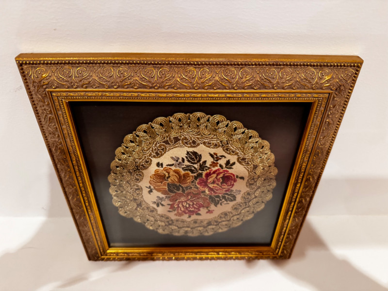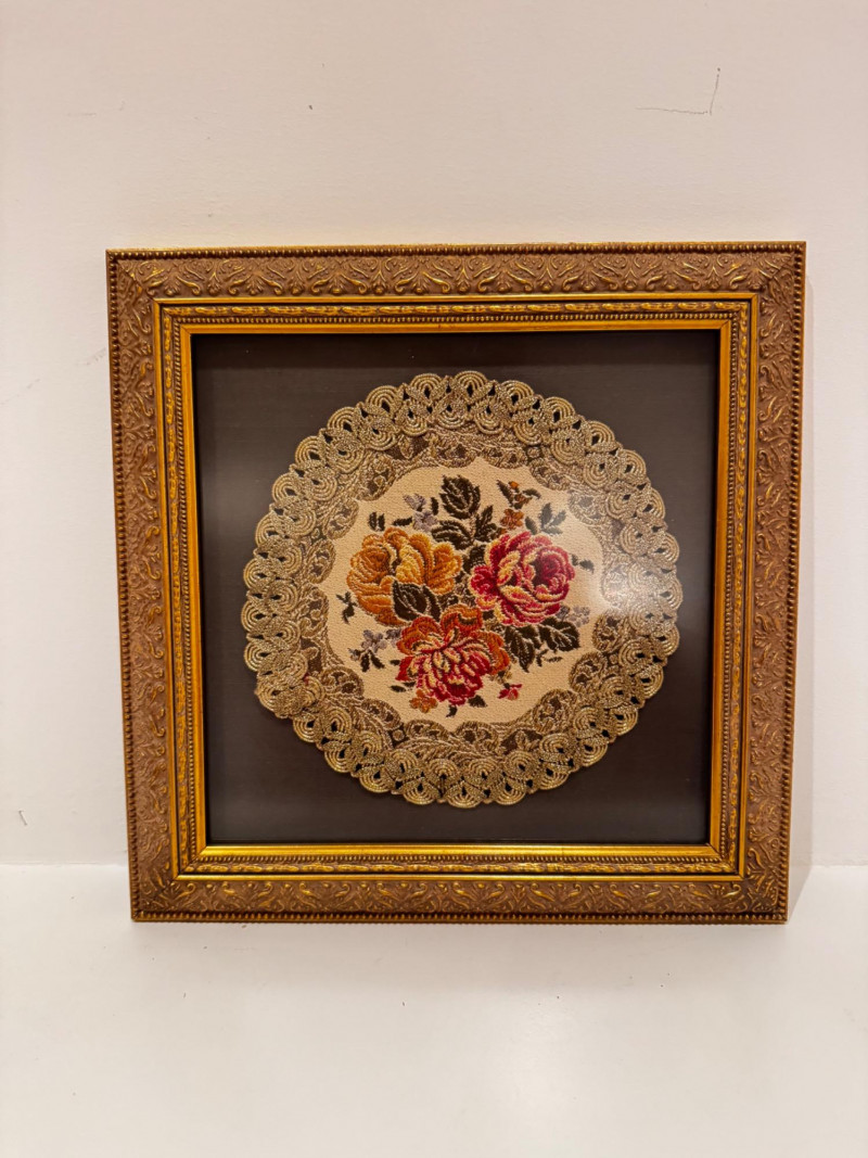 Framed Floral Embroidery Artwork – Ornate Gold Frame.