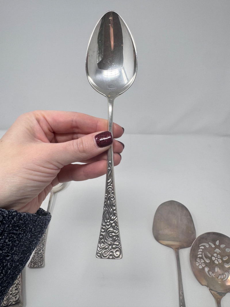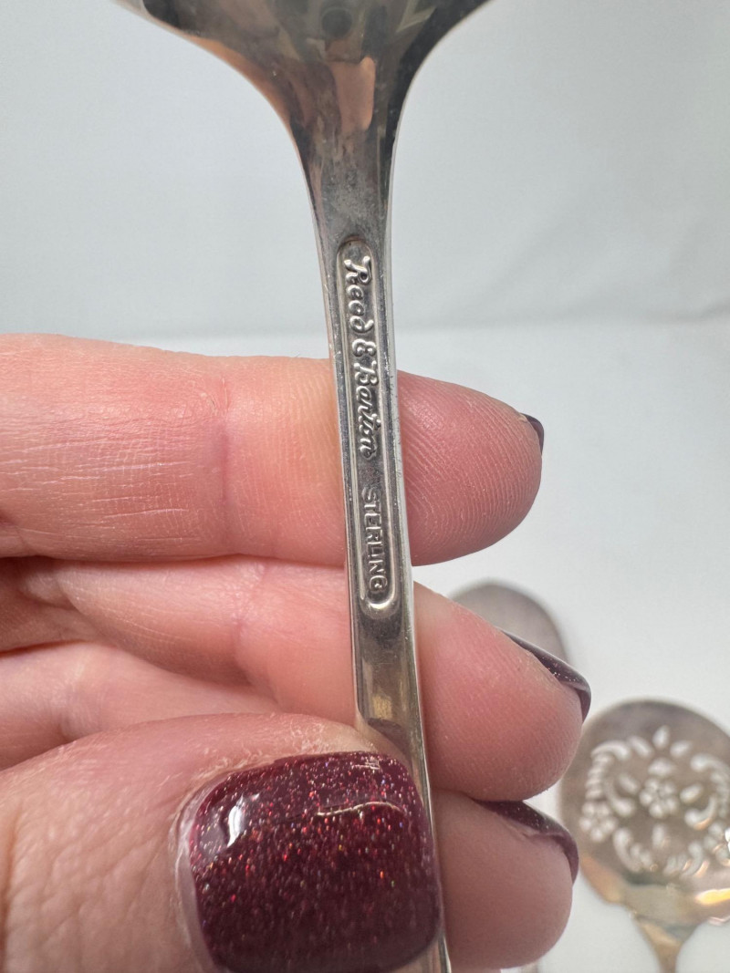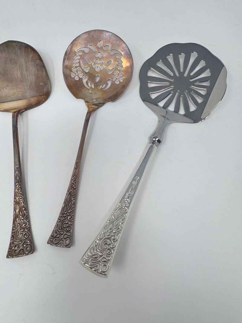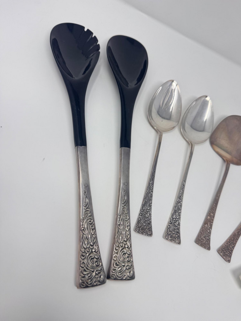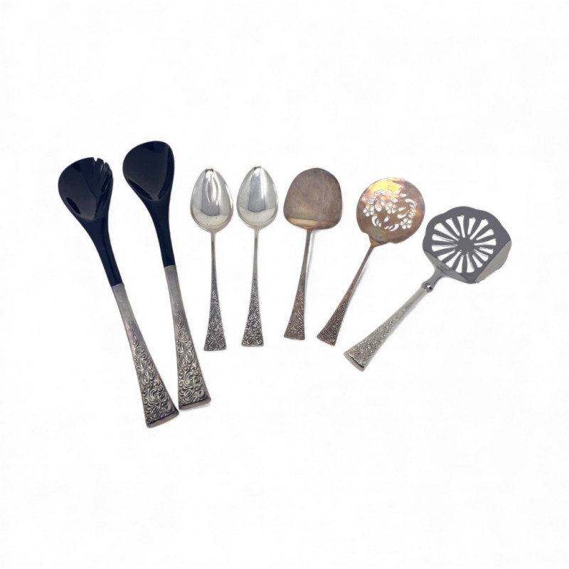 Reed & Barton “Tapestry” Sterling Serving Utensils + Salad Servers. Sterling Serving Utensils (423.49g combined, approx.) Pieces include: Assorted serving spoons Pierced/strainer spoons Serving spatula Additional specialty serving utensils (see photos for all styles) Salad Servers (256.73g combined, approx.) Matching sterling handles Black composite serving ends General Disclaimer:All items are sold as-is. Jewelry, metals, gemstones, and other minerals have not been tested unless specifically noted. No guarantees are made regarding metal content, gemstone type, or origin. Refunds will not be issued based on identification, classification, or perceived quality.