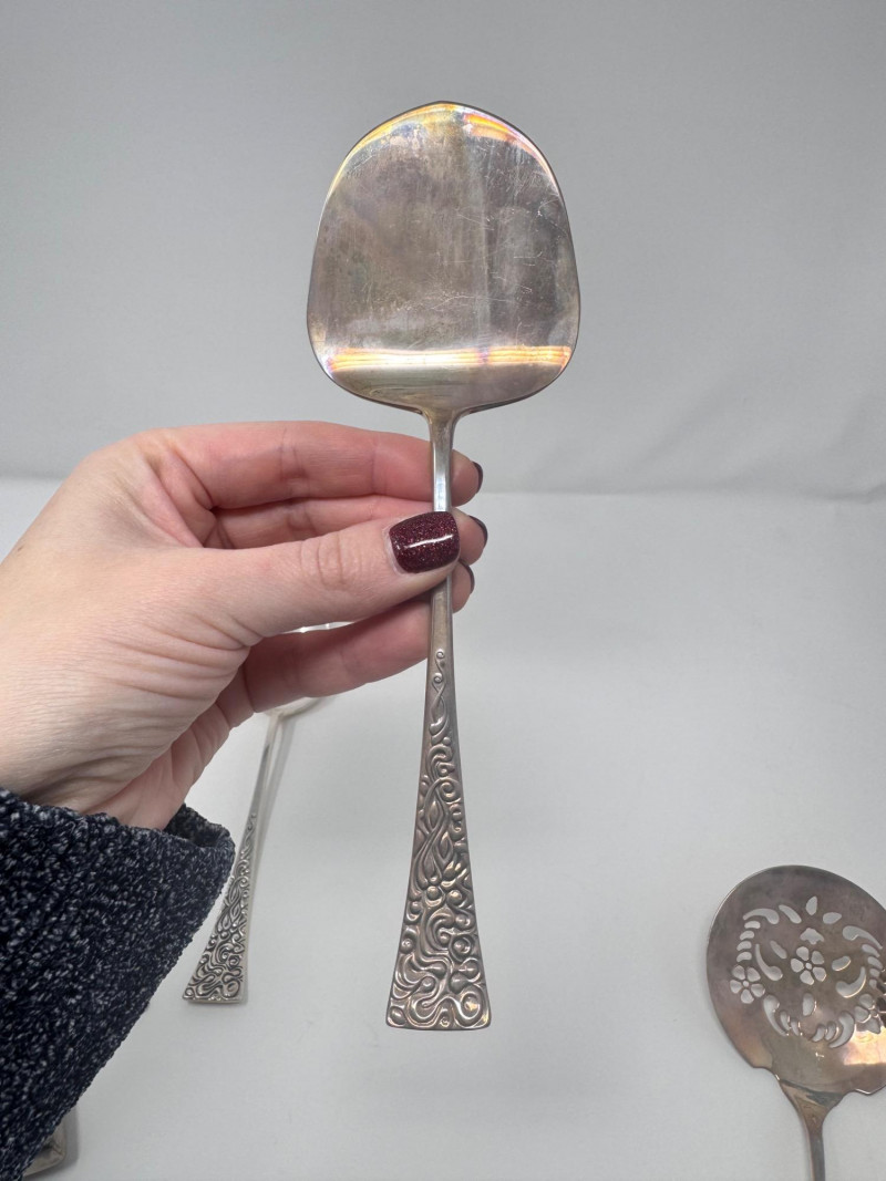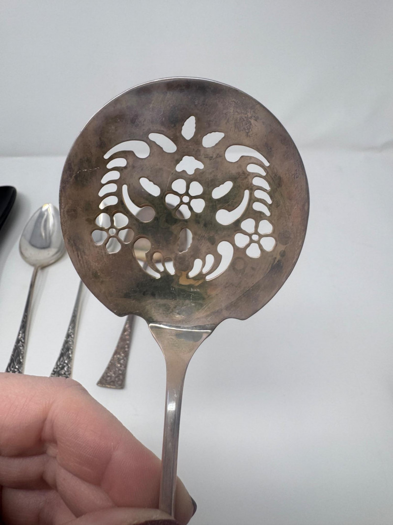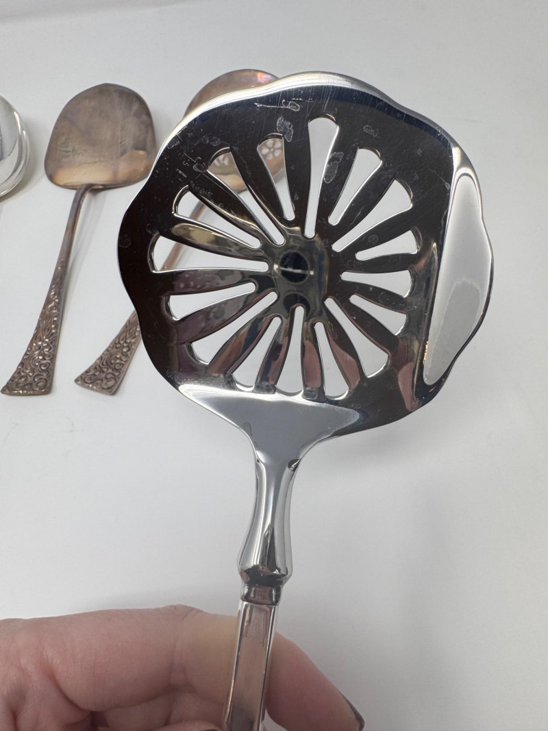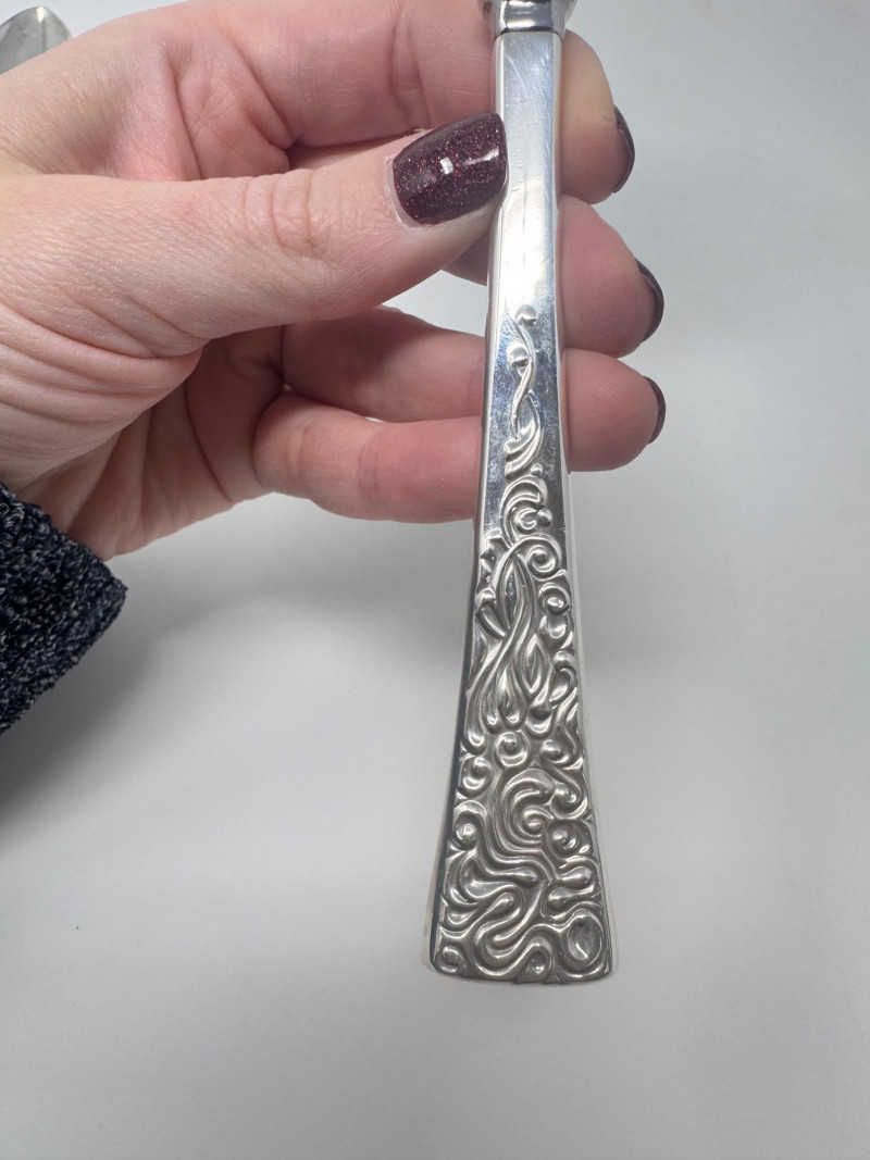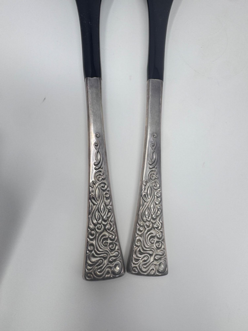 Reed & Barton “Tapestry” Sterling Serving Utensils + Salad Servers. Sterling Serving Utensils (423.49g combined, approx.) Pieces include: Assorted serving spoons Pierced/strainer spoons Serving spatula Additional specialty serving utensils (see photos for all styles) Salad Servers (256.73g combined, approx.) Matching sterling handles Black composite serving ends General Disclaimer:All items are sold as-is. Jewelry, metals, gemstones, and other minerals have not been tested unless specifically noted. No guarantees are made regarding metal content, gemstone type, or origin. Refunds will not be issued based on identification, classification, or perceived quality.