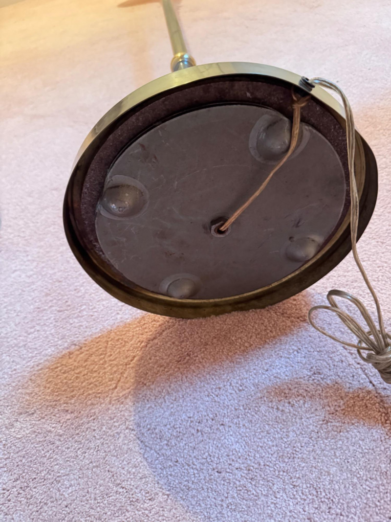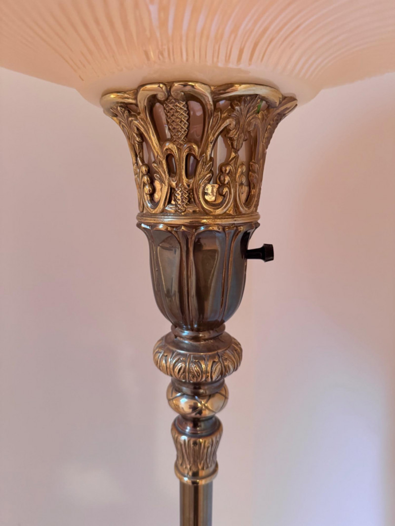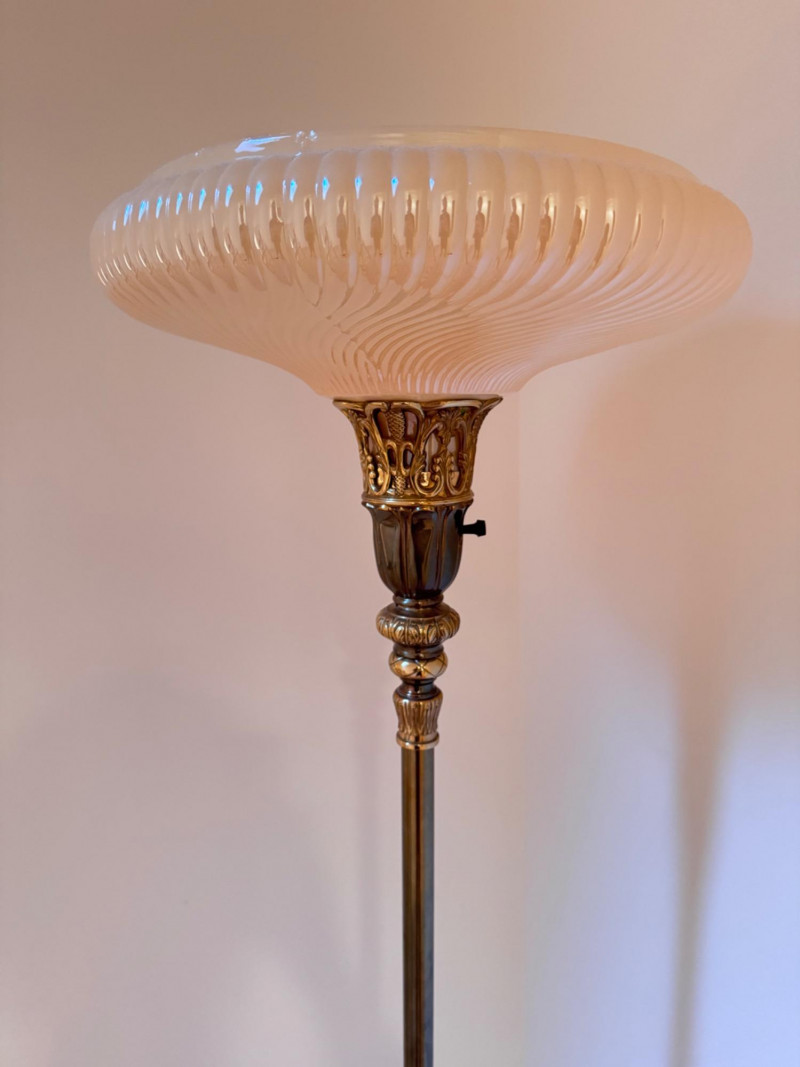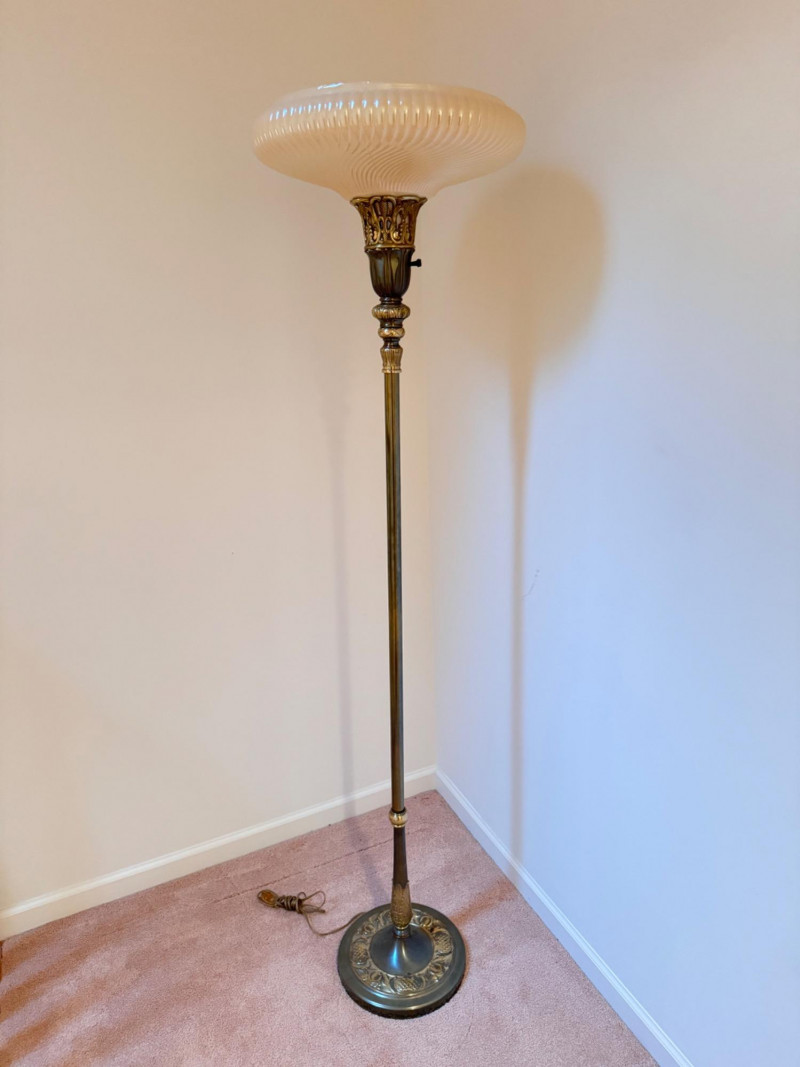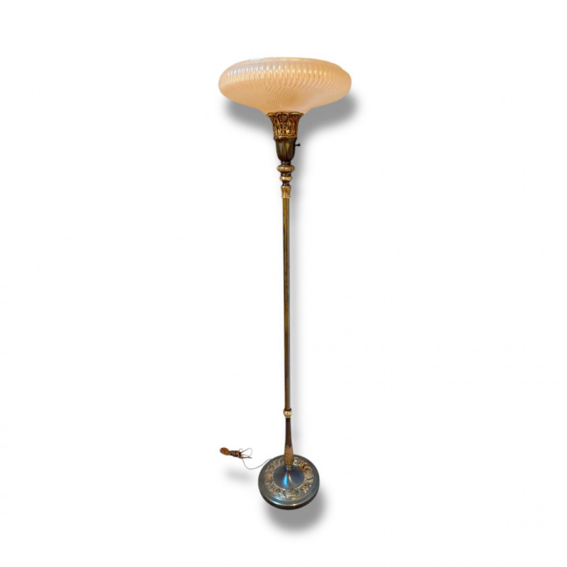 Vintage Brass Torchiere Floor Lamp w/ Frosted Glass Shade. • Stands 65” tall