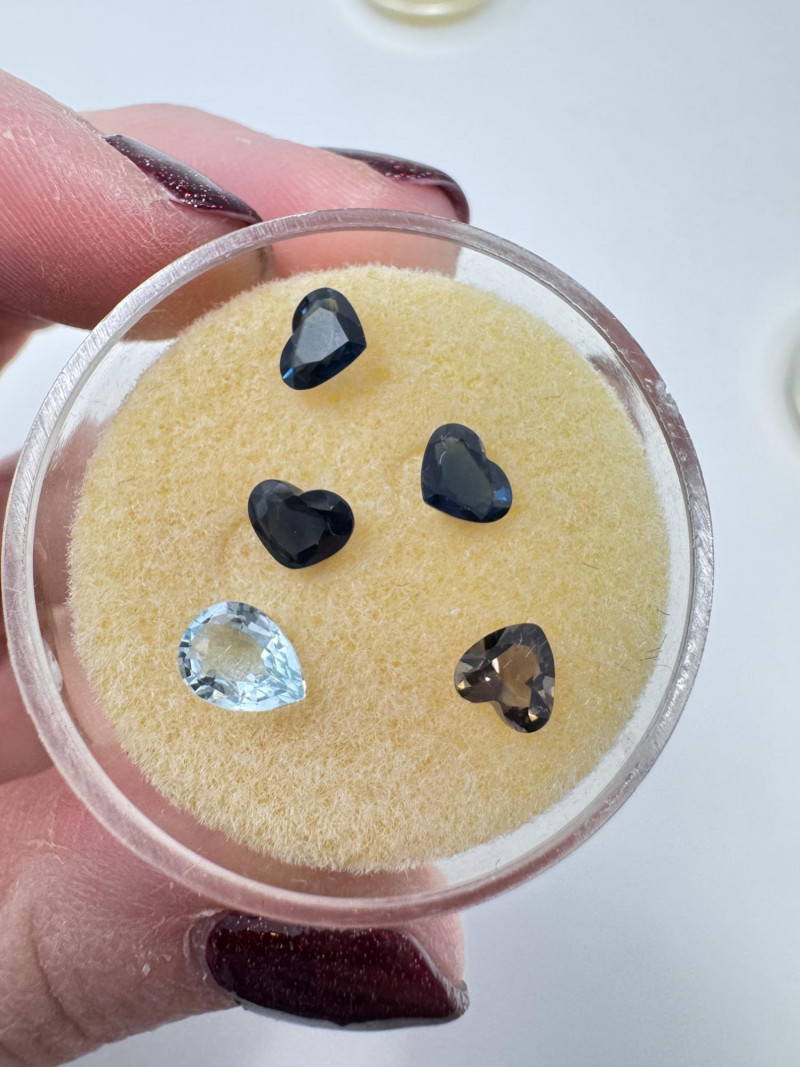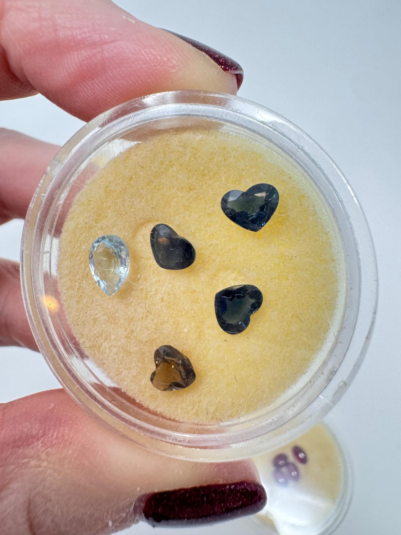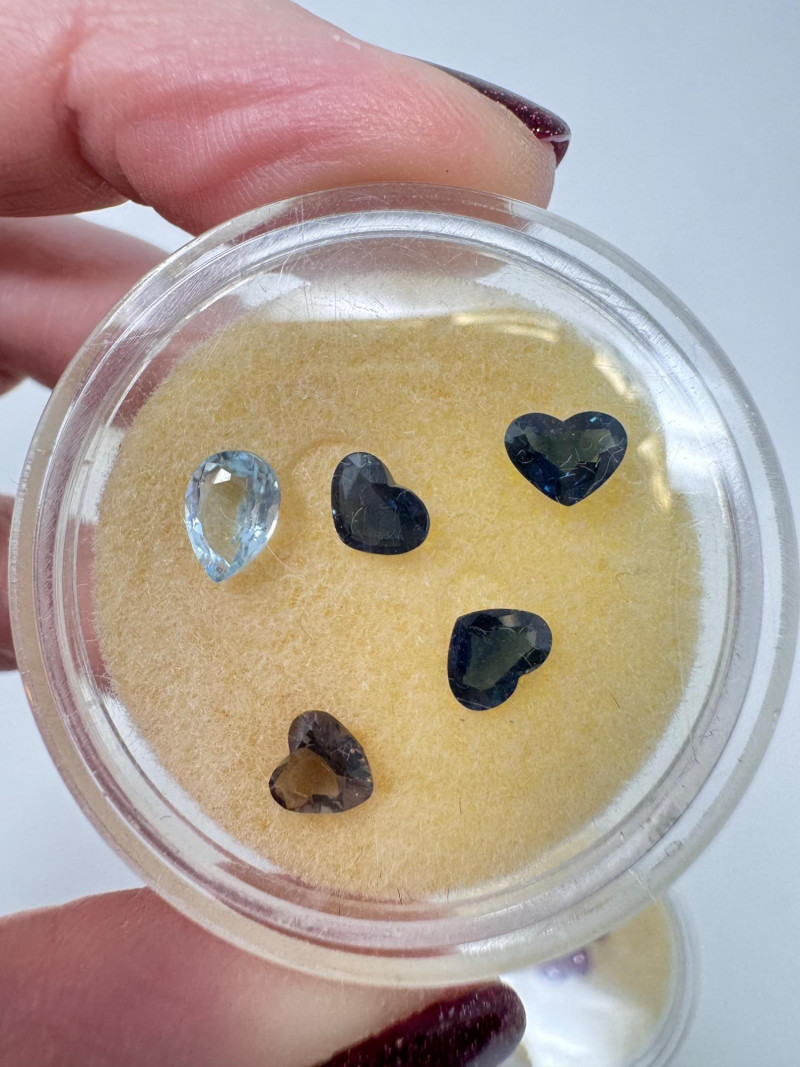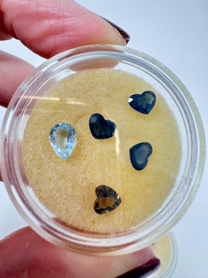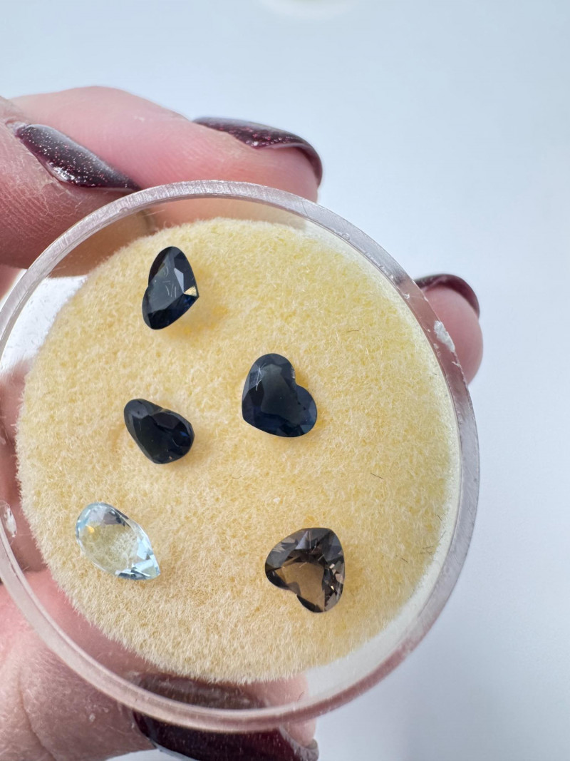 Mixed Cut Gemstones – Amethyst, Aquamarine, Blue Hearts, Garnet. Amethyst pear-cut gemstone – approx. 0.45 ct Amethyst round-cut gemstone – approx. 0.45 ct Aquamarine pear-cut gemstone – approx. 0.85 ct Blue heart-cut stones – approx. 1.7 cts combined Possibly sapphire; identification not confirmed Smoky quartz-type stone – approx. 0.25 ct Likely smoky quartz but unverified Four garnet cabochons – approx. 2.45 cts combined