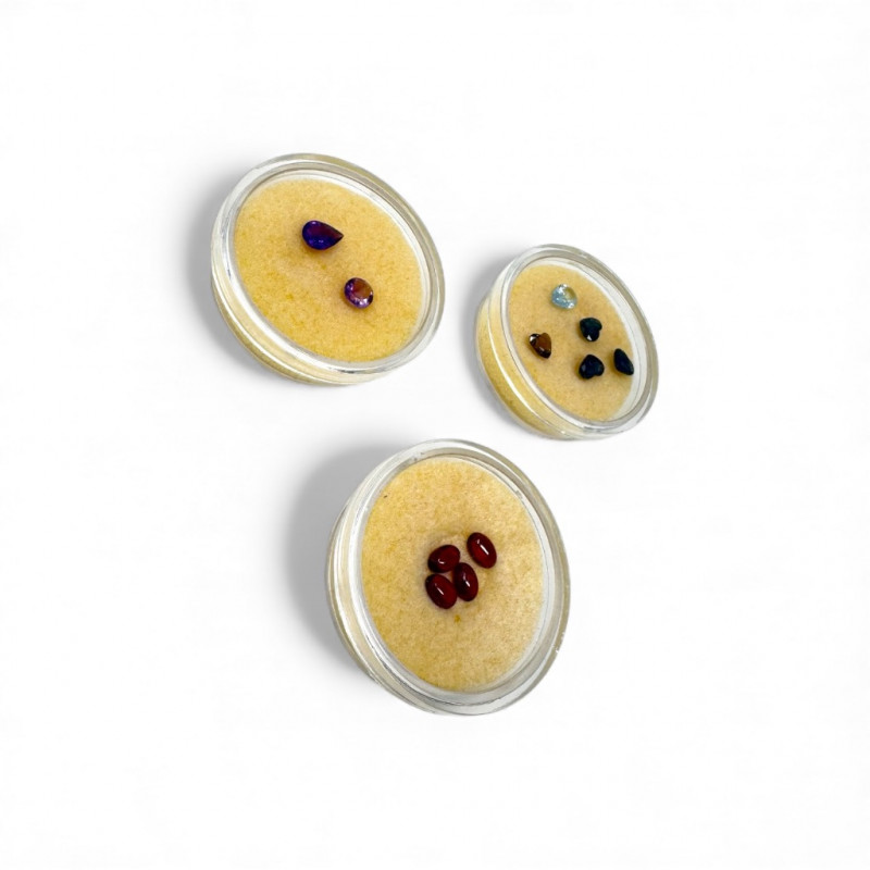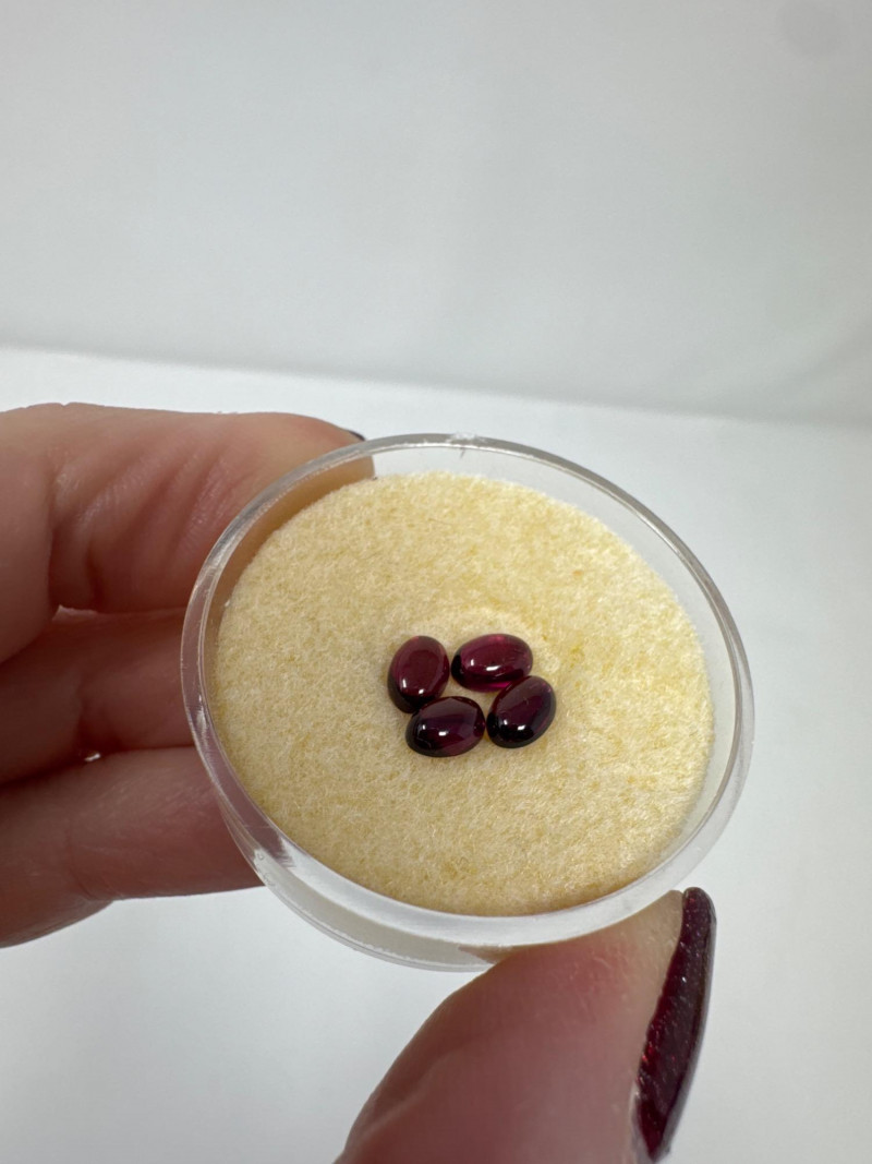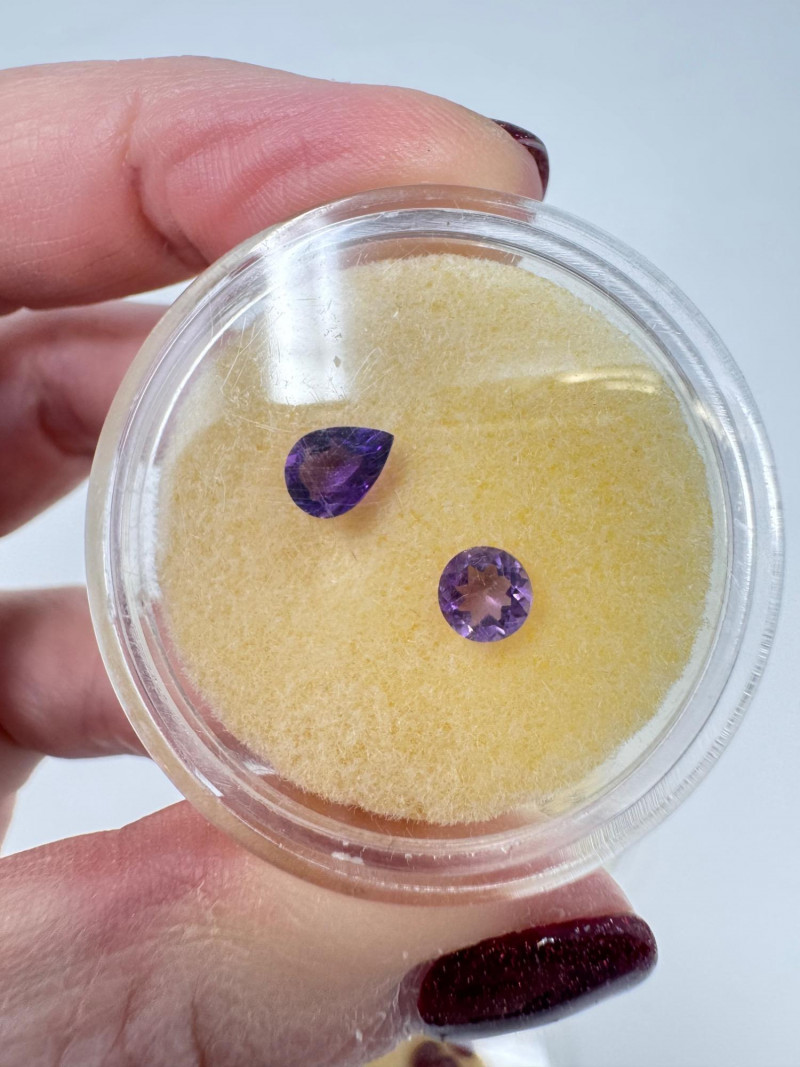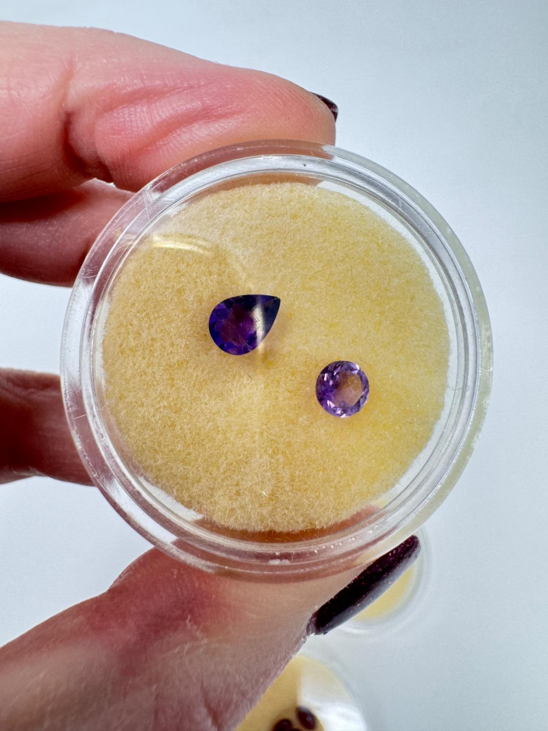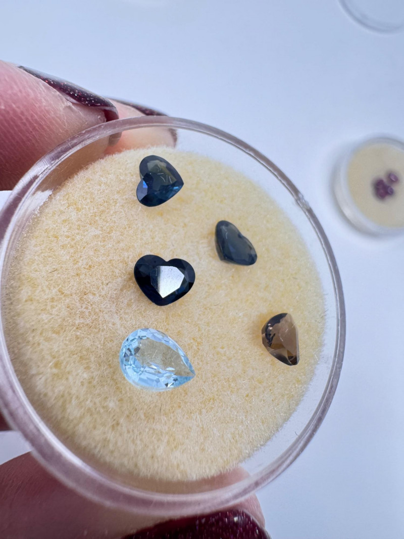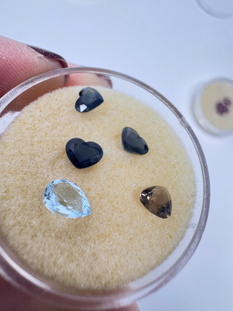 Mixed Cut Gemstones – Amethyst, Aquamarine, Blue Hearts, Garnet. Amethyst pear-cut gemstone – approx. 0.45 ct Amethyst round-cut gemstone – approx. 0.45 ct Aquamarine pear-cut gemstone – approx. 0.85 ct Blue heart-cut stones – approx. 1.7 cts combined Possibly sapphire; identification not confirmed Smoky quartz-type stone – approx. 0.25 ct Likely smoky quartz but unverified Four garnet cabochons – approx. 2.45 cts combined