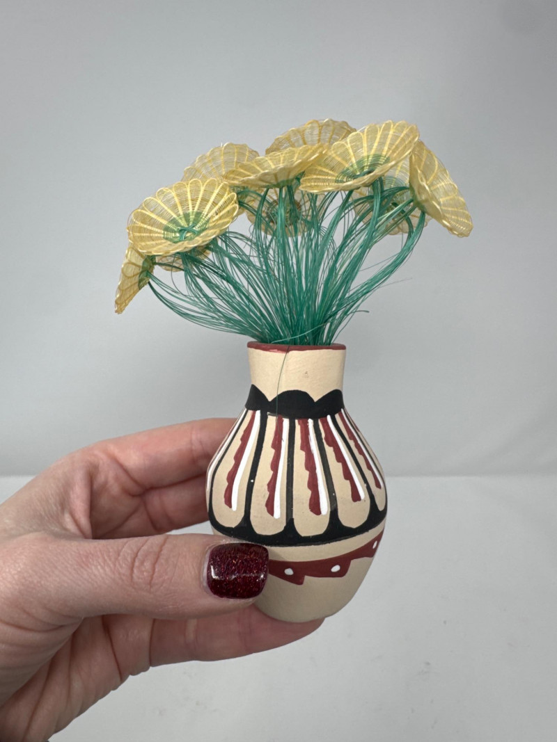 Native Storyteller Pottery Figurines + Floral Vase – Signed Pieces. Collection of storyteller pottery figures. Sizes range from approx. 1” to 5.5” tall