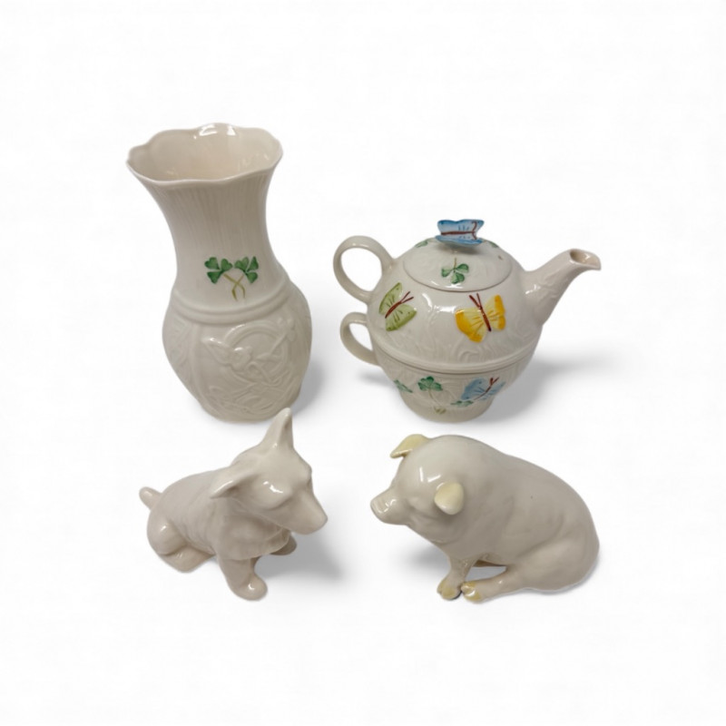 Belleek Irish Porcelain – Iona Vase, Teapot-for-One & Animal Figurines.