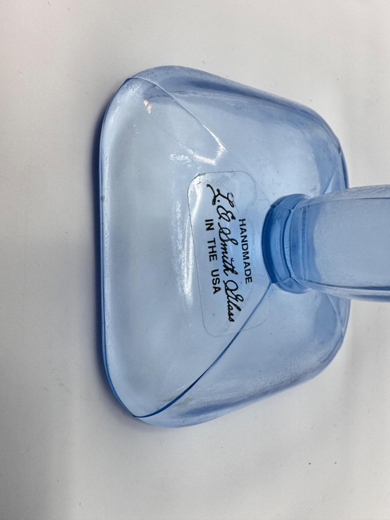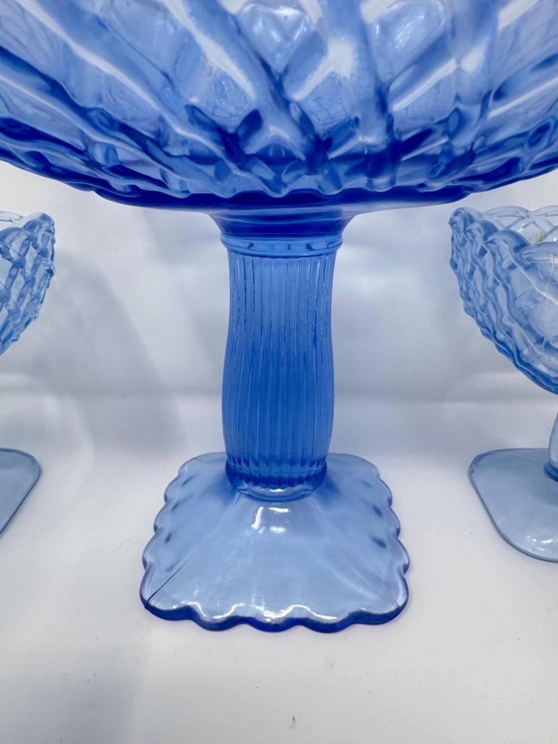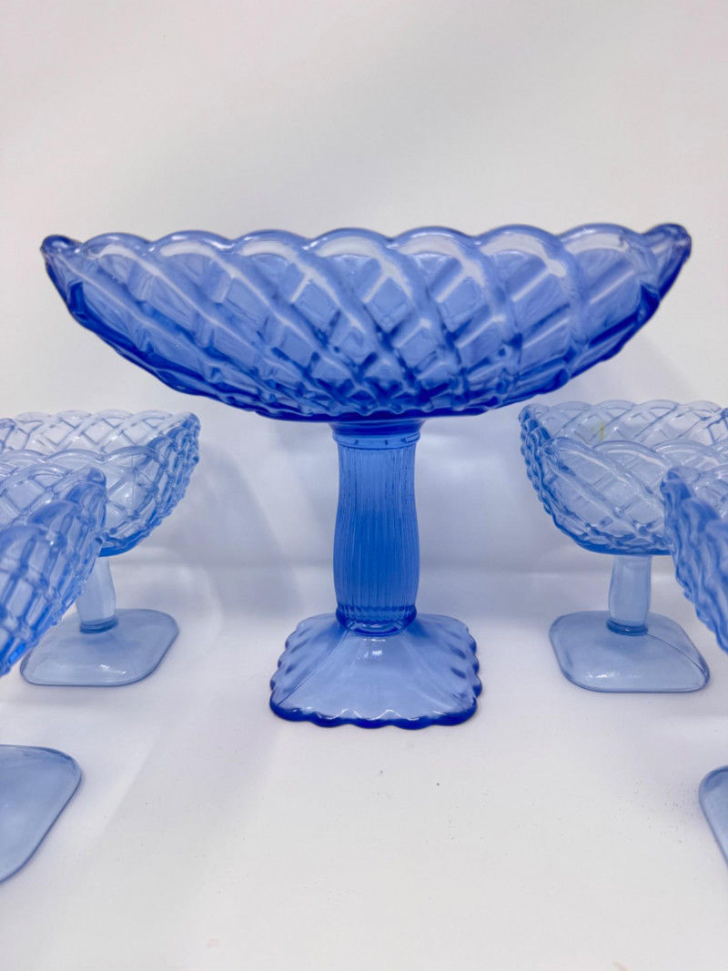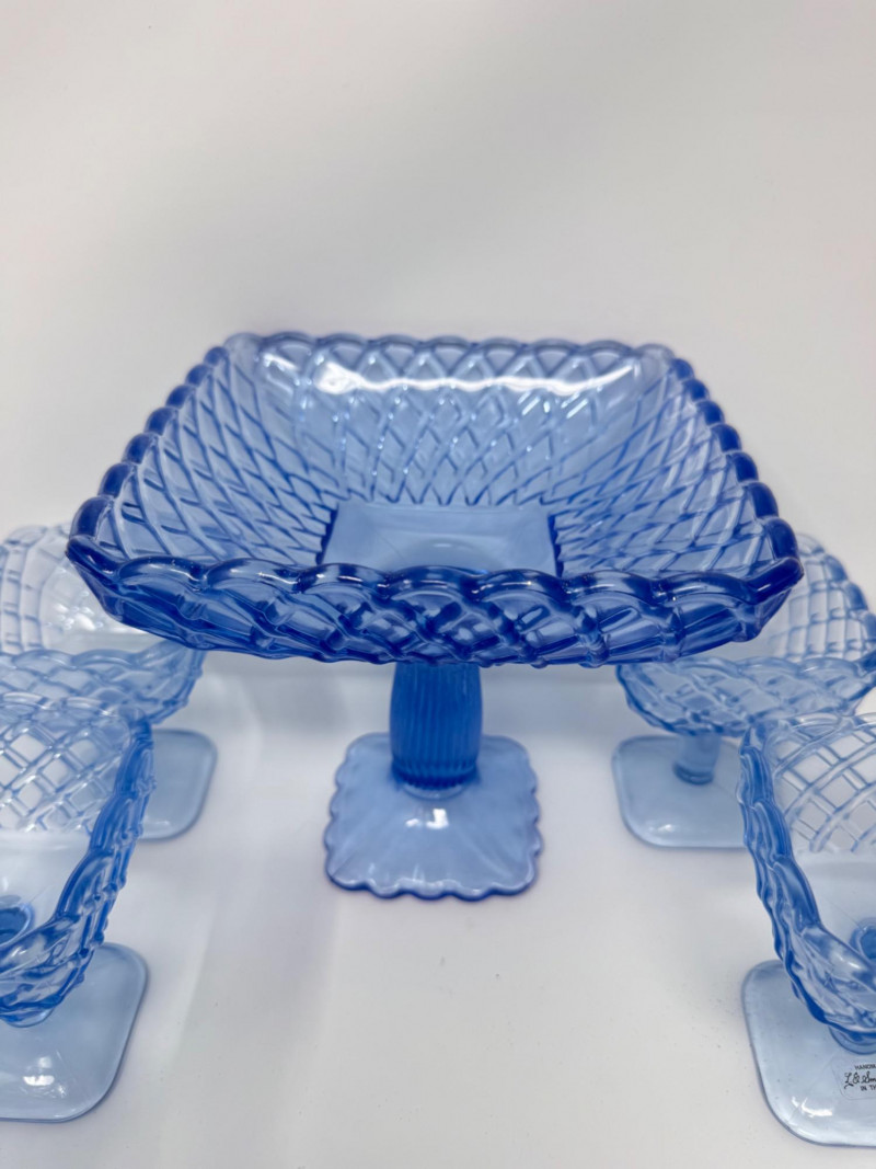 Vintage L.E. Smith Blue Trellis Glass Pedestal Compote + Dessert Dish.