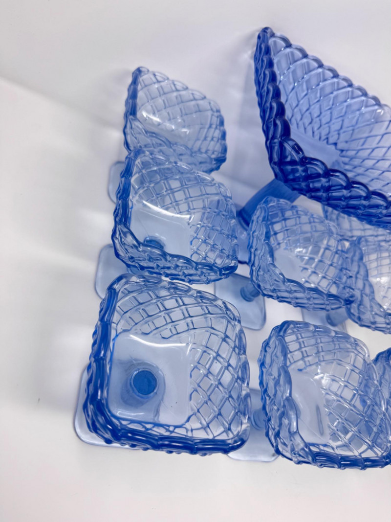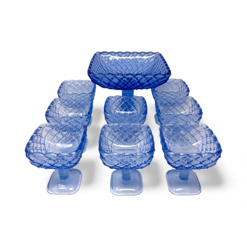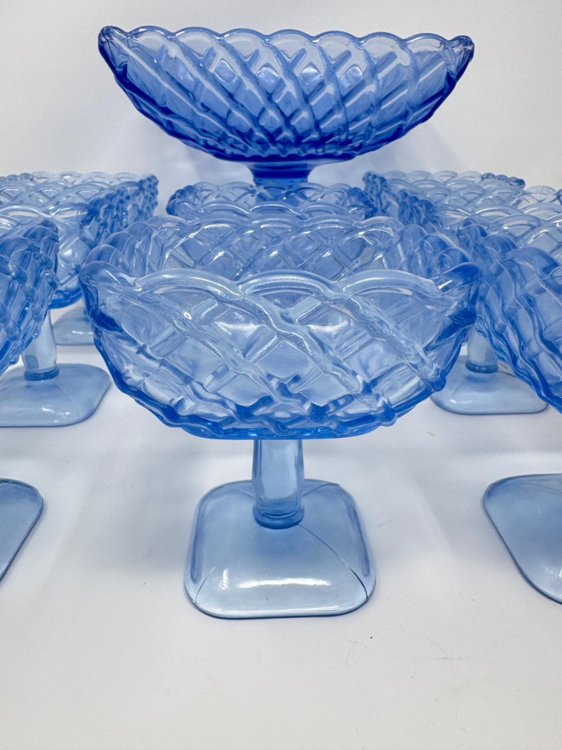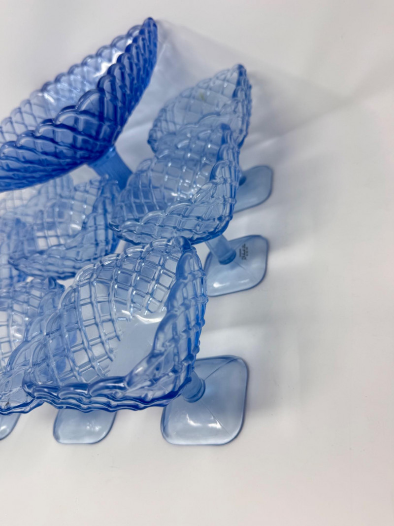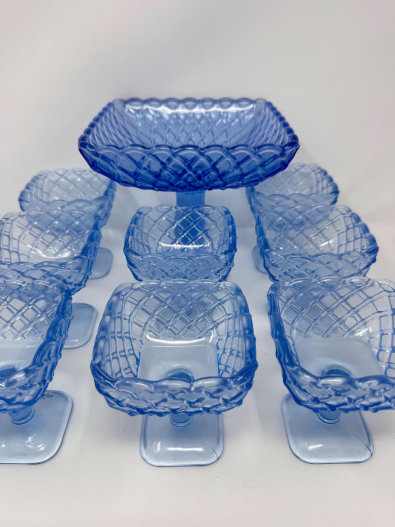 Vintage L.E. Smith Blue Trellis Glass Pedestal Compote + Dessert Dish.