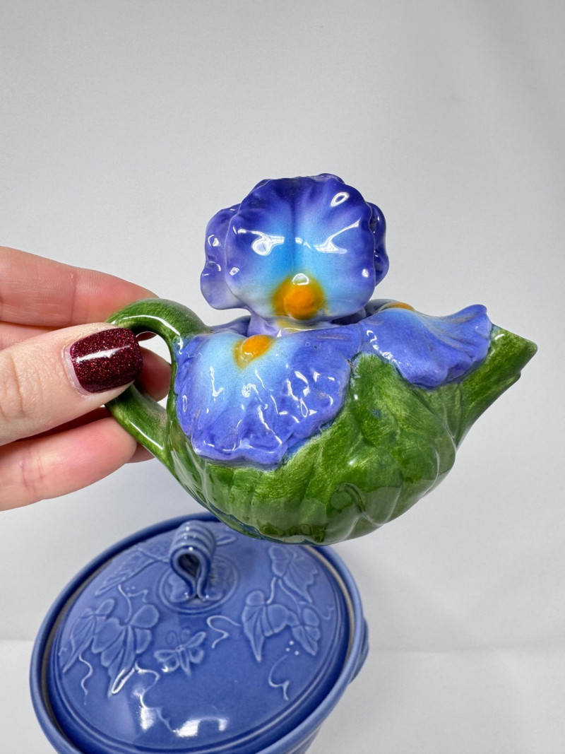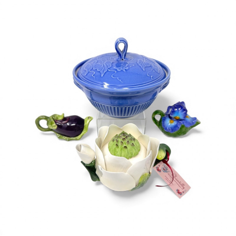Jensen Turnage Pottery Blue Covered Bowl + Mini Teapot Figurines, 4pcs.