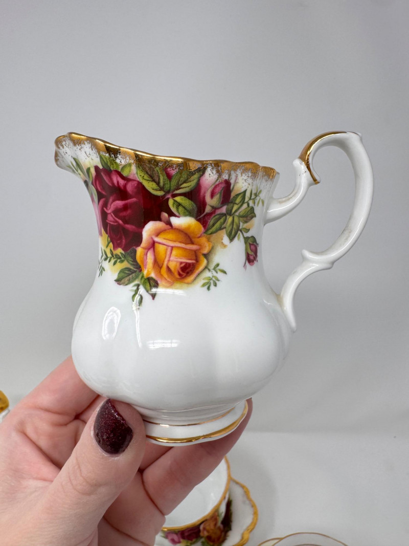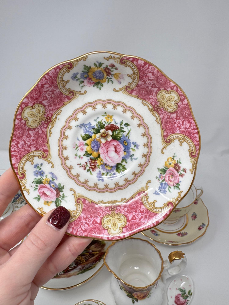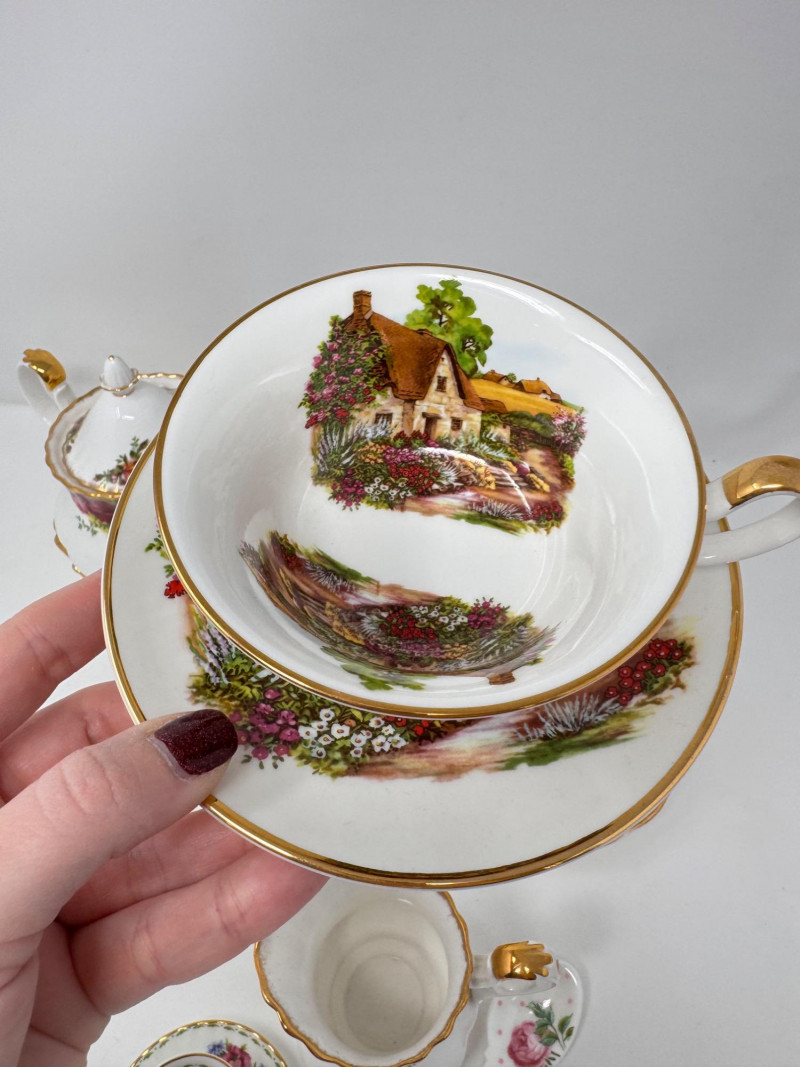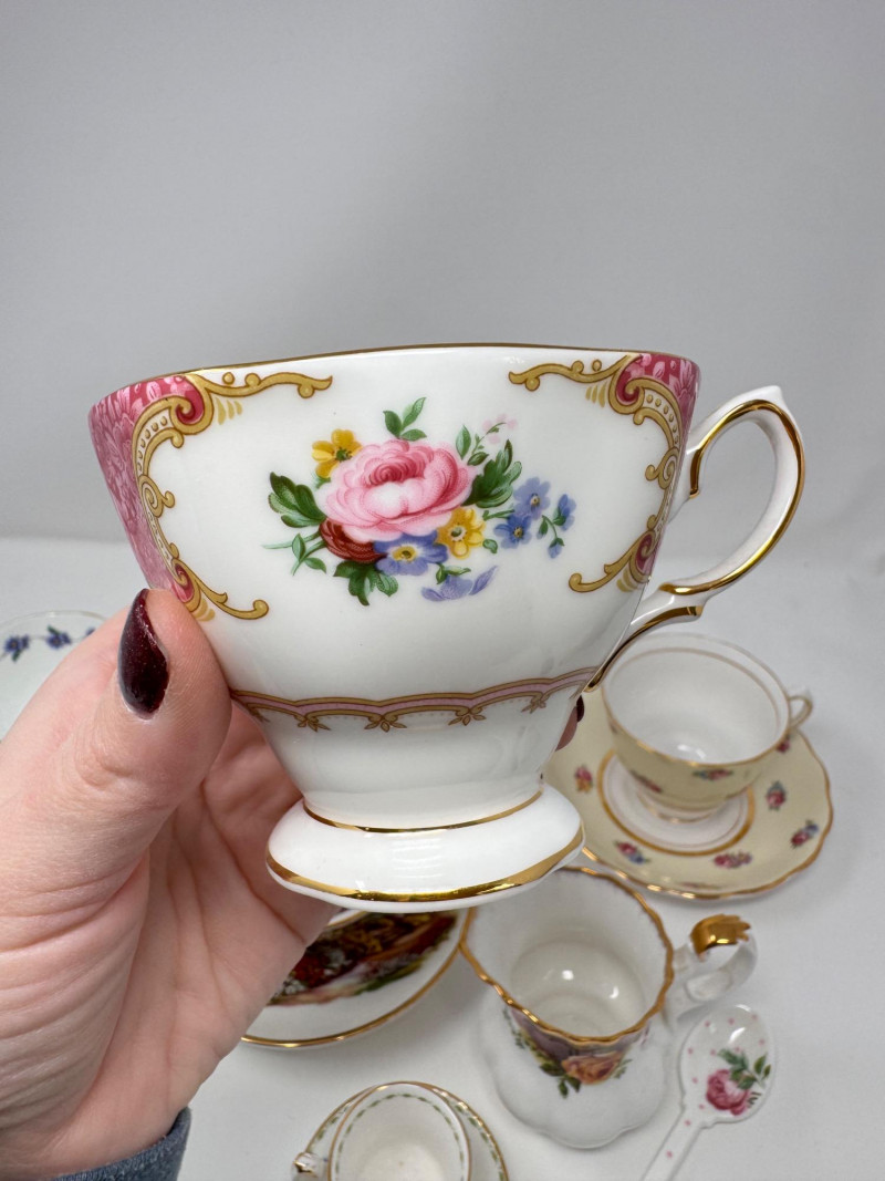 Vintage English Bone China Tea Cup Collection + Old Country Roses Set. Mini floral teacup & saucer + porcelain floral spoon