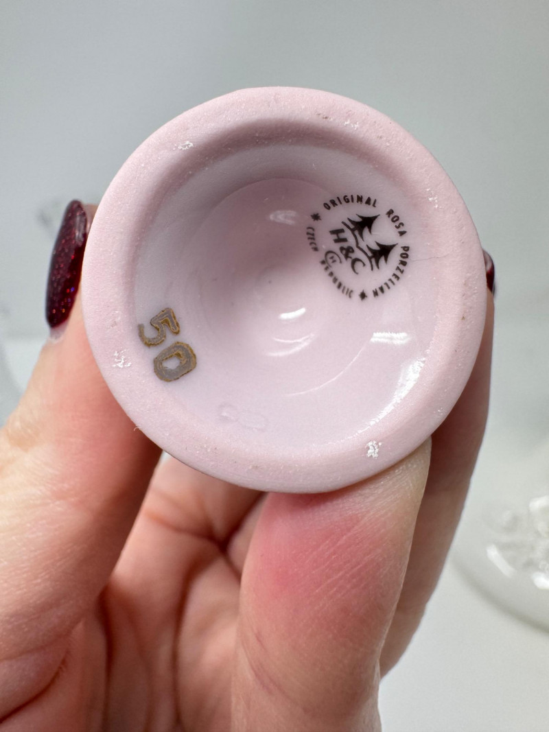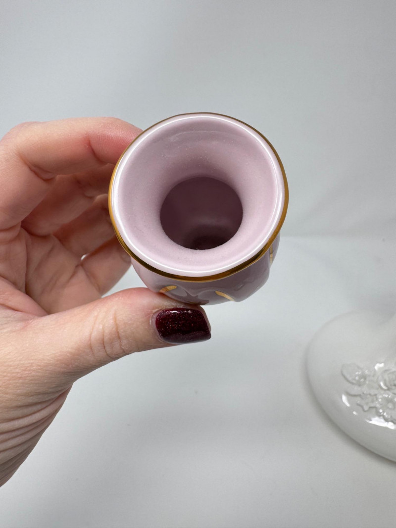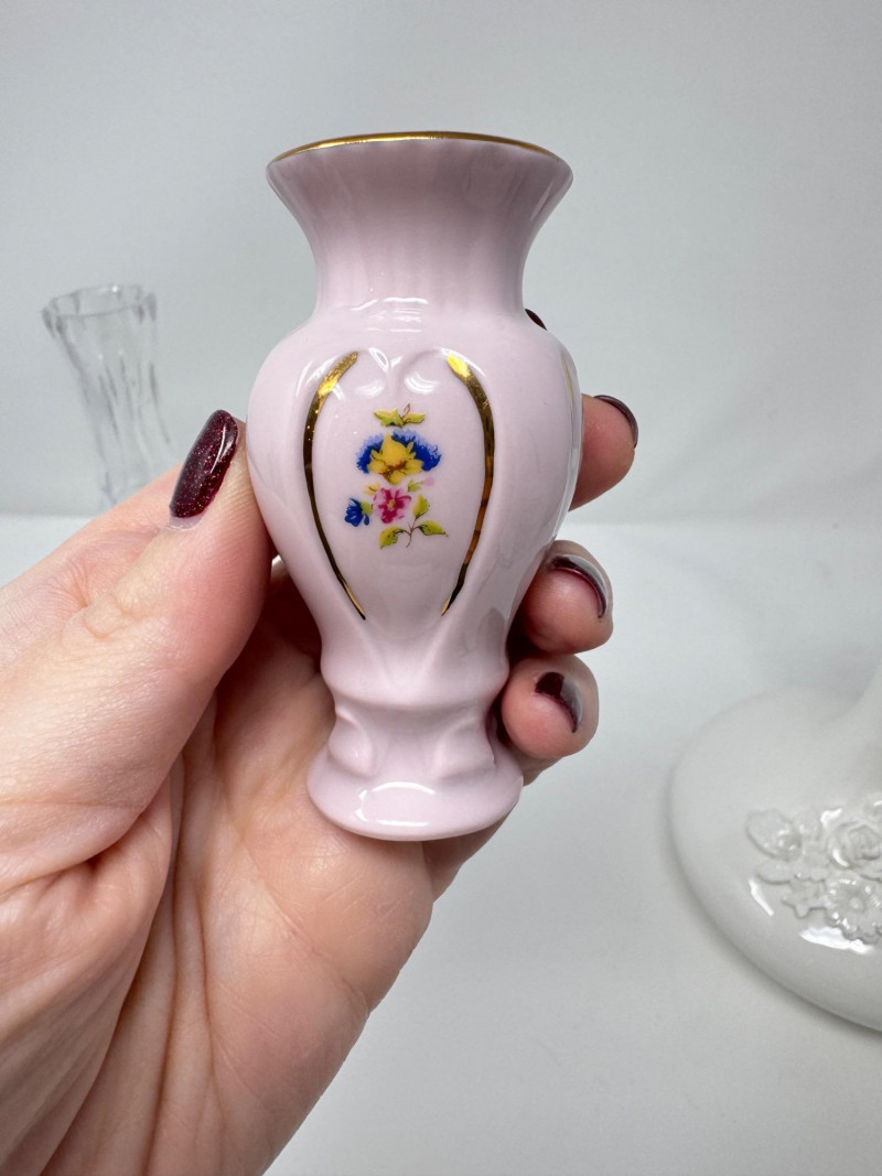 Additional clear and pink ceramic vases with floral motifs and gold trim - Approx. 3" tall.