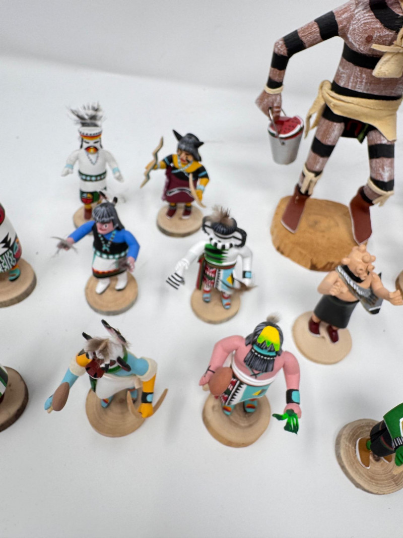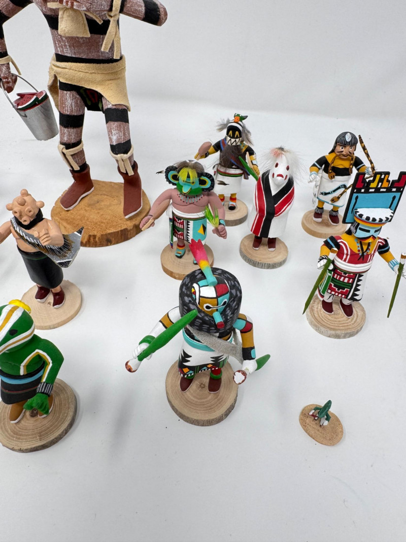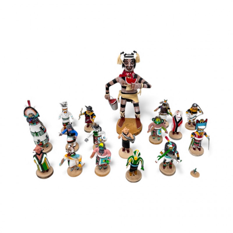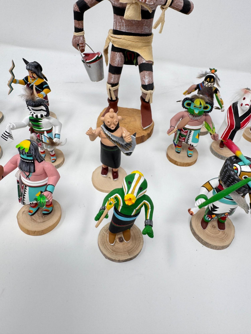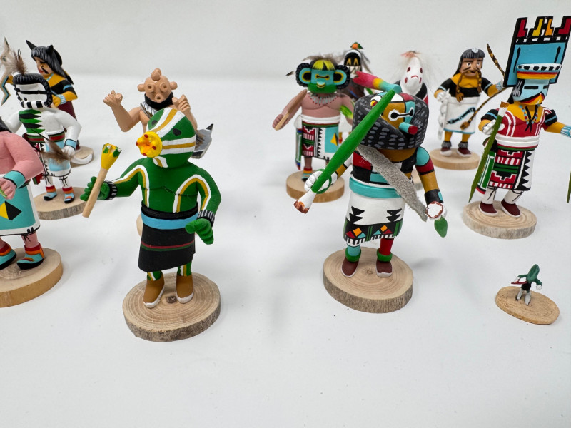 17 Signed Hopi-Style Carved Kachina Dolls - Warrior, Clown, Animal +