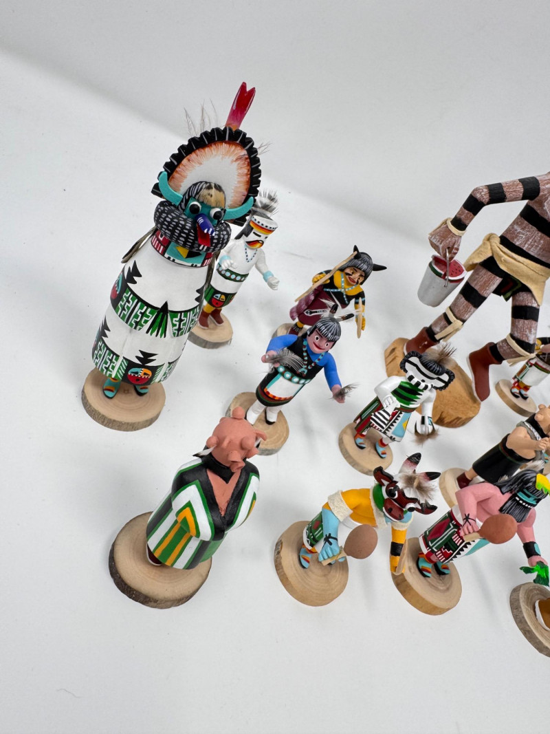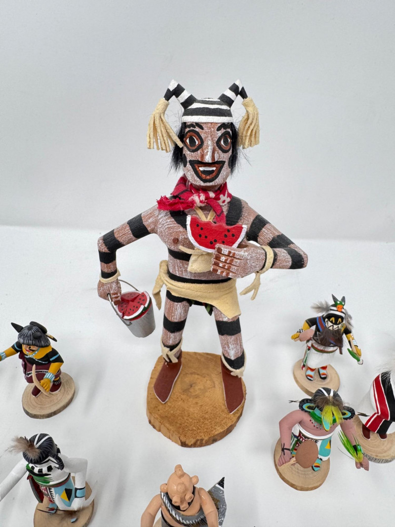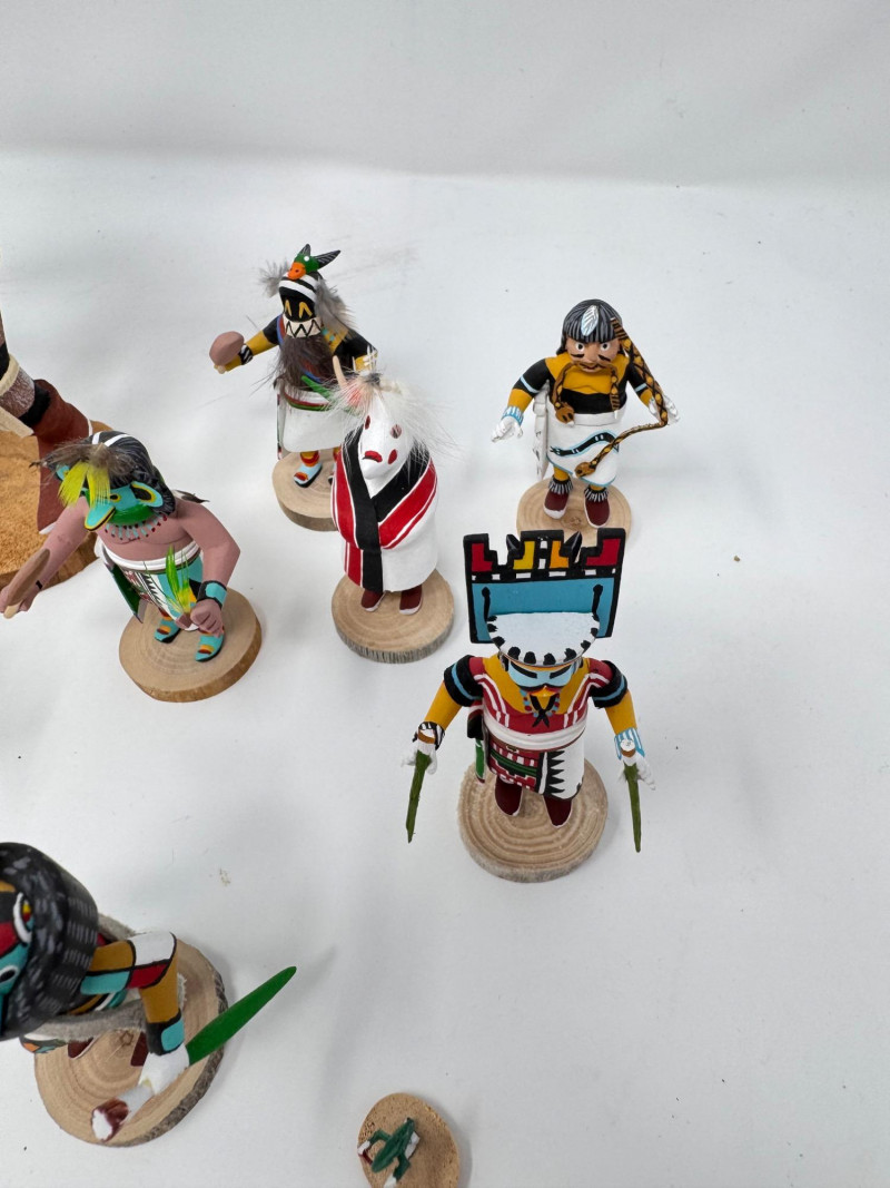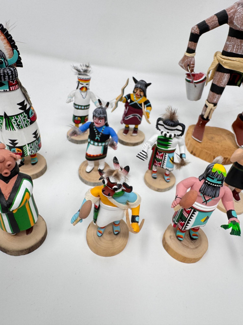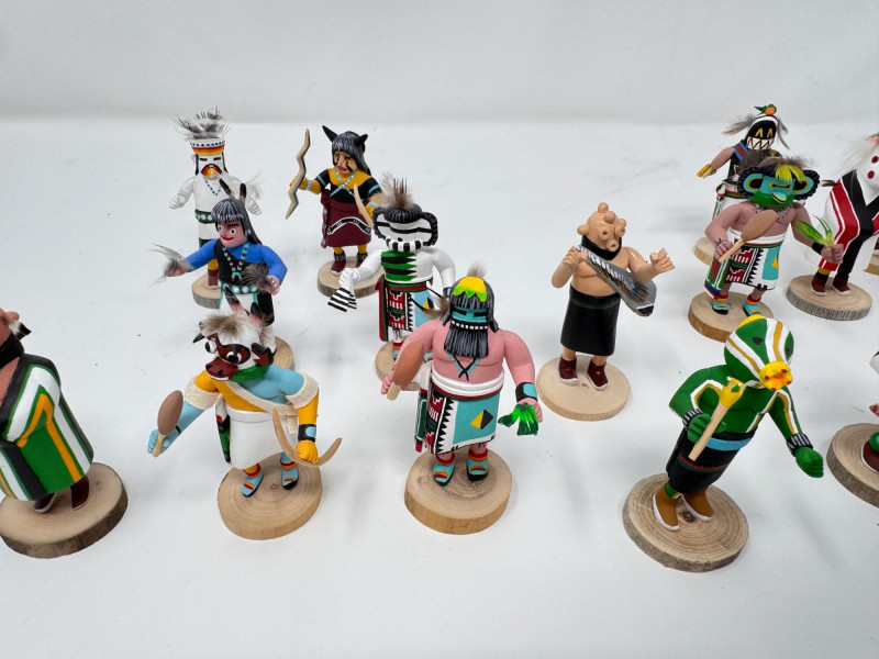 17 Signed Hopi-Style Carved Kachina Dolls - Warrior, Clown, Animal +