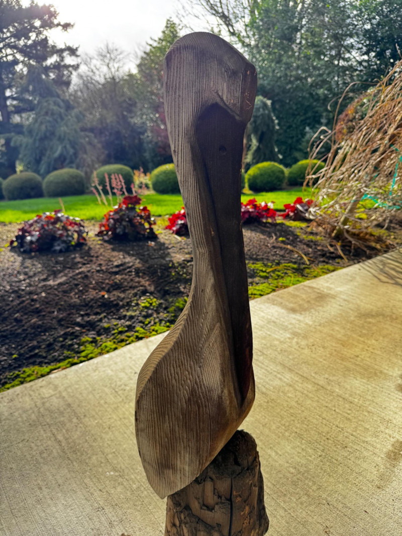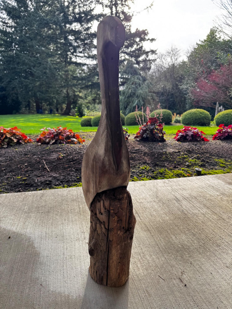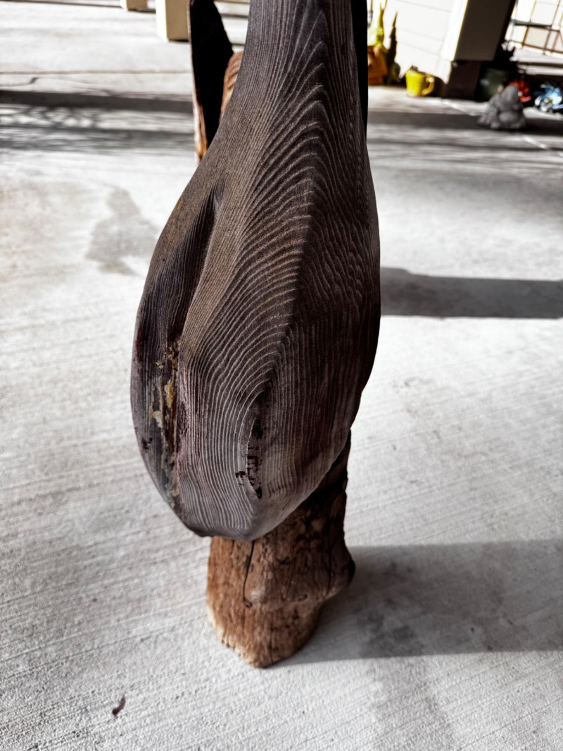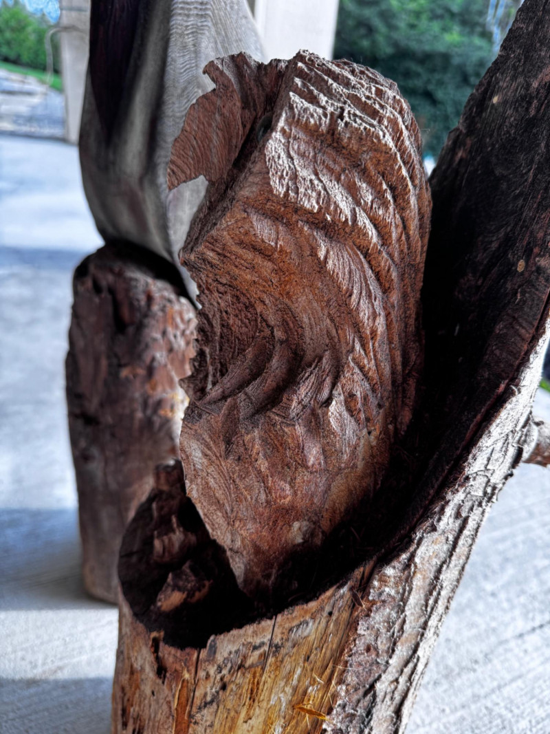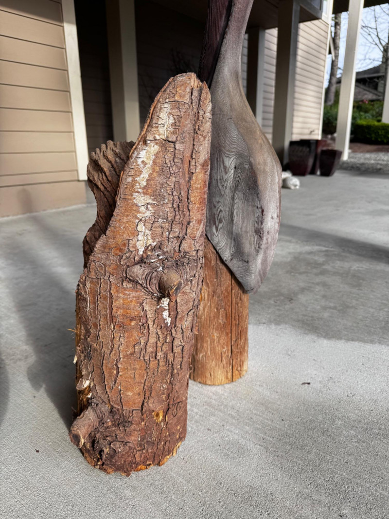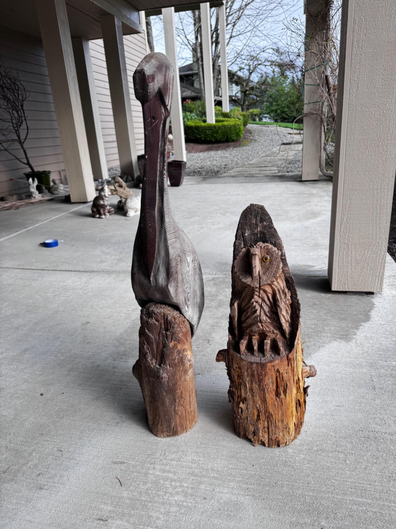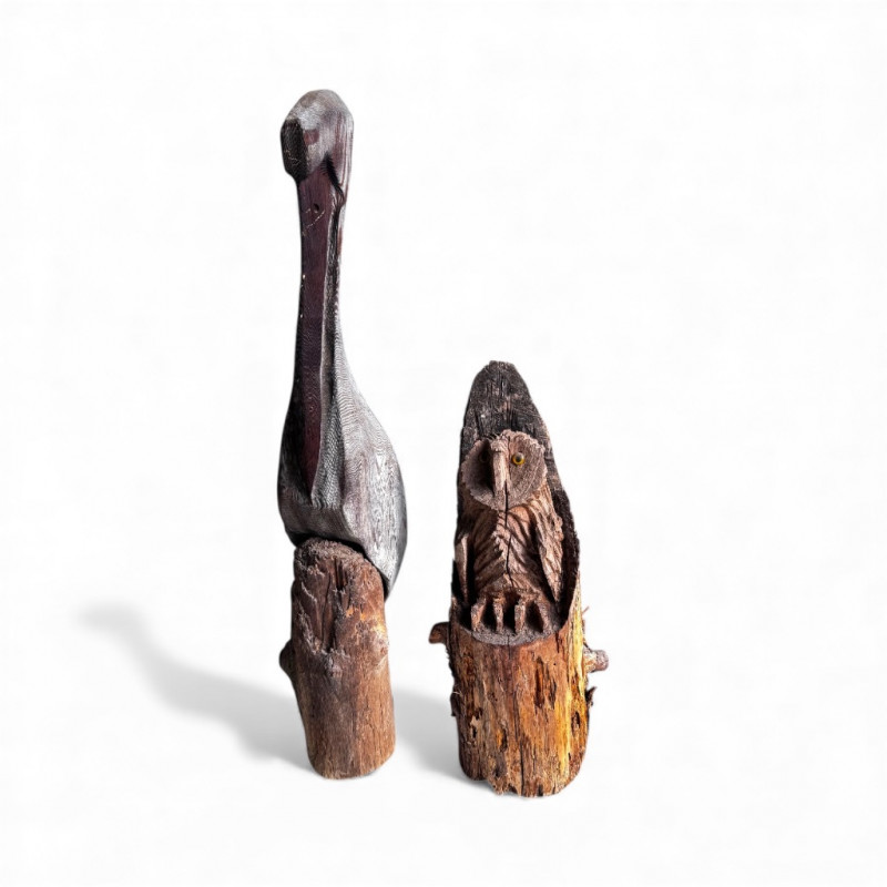 Two hand-carved wood sculptures, crafted from natural tree trunks