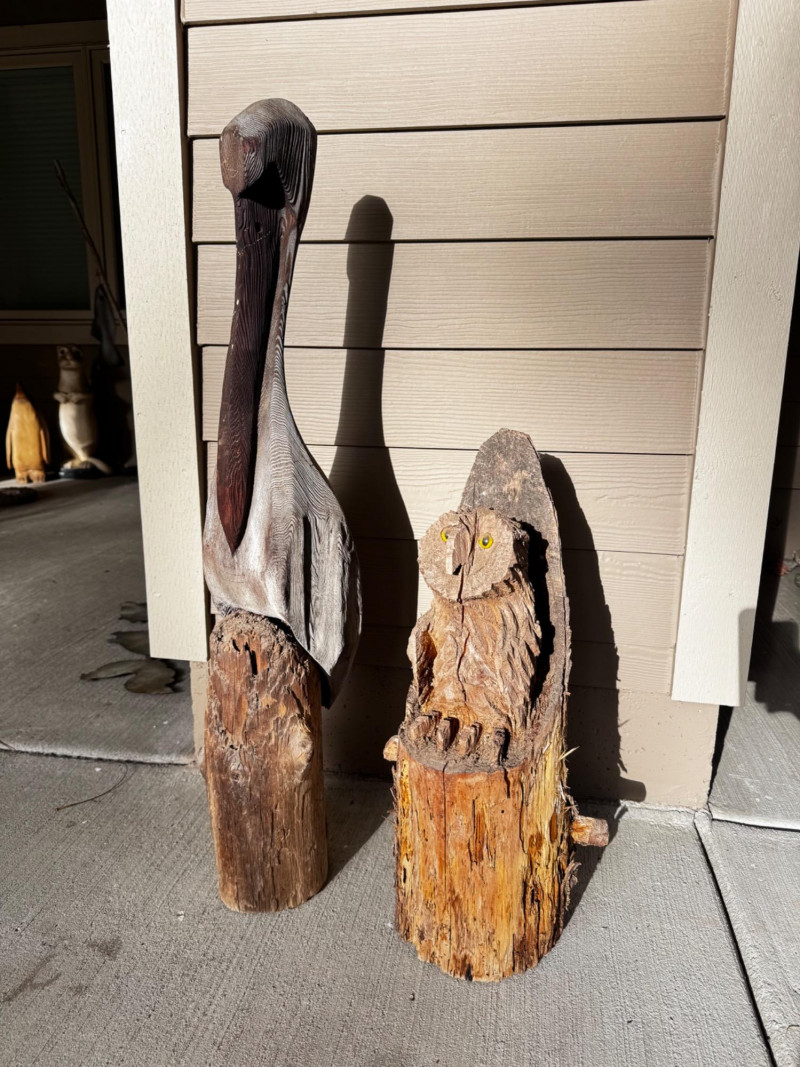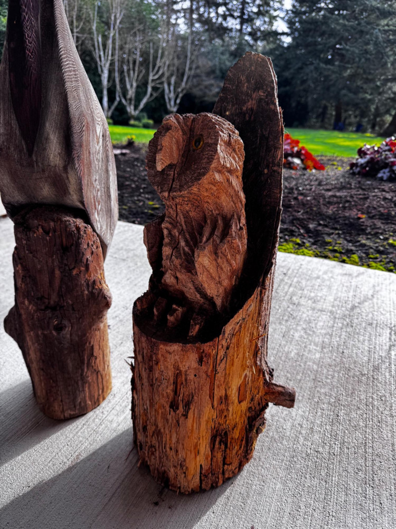Hand-Carved Wood Bird & Owl Sculptures – Tree Trunk Art.